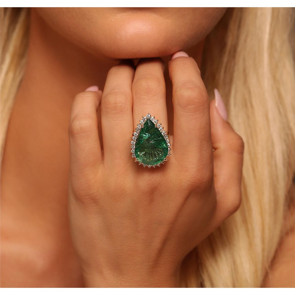 One electronically tested 14KT yellow gold ladies cast emerald and diamond ring with a bright polish finish. Condition is new, good workmanship. The featured emerald is set within a diamond bezel, supported by split shoulders and completed by a two and one half millimeter wide band. Identified with markings of "K14". Containing: One prong set pear mixed cut natural emerald, measuring 23.92 x 16.96 x 9.20mm, exact weight 19.13ct., clarity is heavily included, type III, medium, very slightly grayish, green color, (GIA G 5/3), cut is good. Transmitting light with a minimum of distortion, transparent to translucent. Naturally occurring internal & external characteristics are present. Indications of oil residue. GIA Gemological Report attached. Graded loose prior to setting in the GIA Laboratory, Report #2151952110.Twenty-Nine prong set round brilliant cut diamonds, measuring 2.10 - 2.00 x 1.23mm (depth est.) approximate. Total Weight of 29 Stones = 1.01ct. Graded in the setting. Clarity: SI-2 to I-1. Color: G - I. Total Weight of Colored Stones 19.13ct. Total Weight of Diamonds 1.01ct. Total Weight of Ring 12.60 grams. AIG Appraised at $24,985.00.