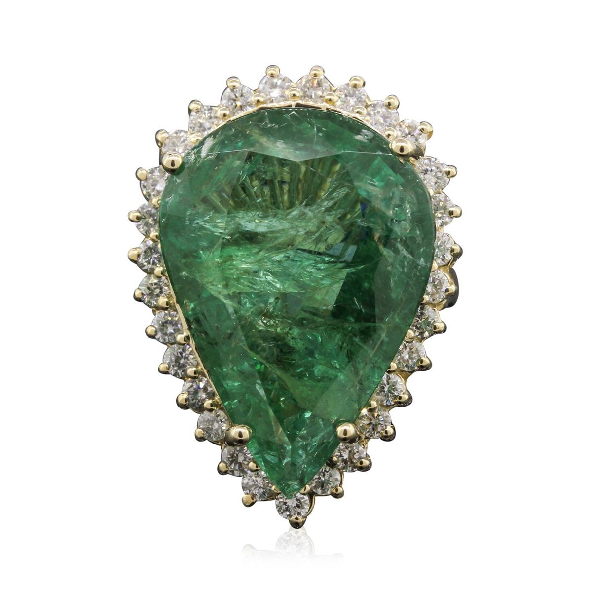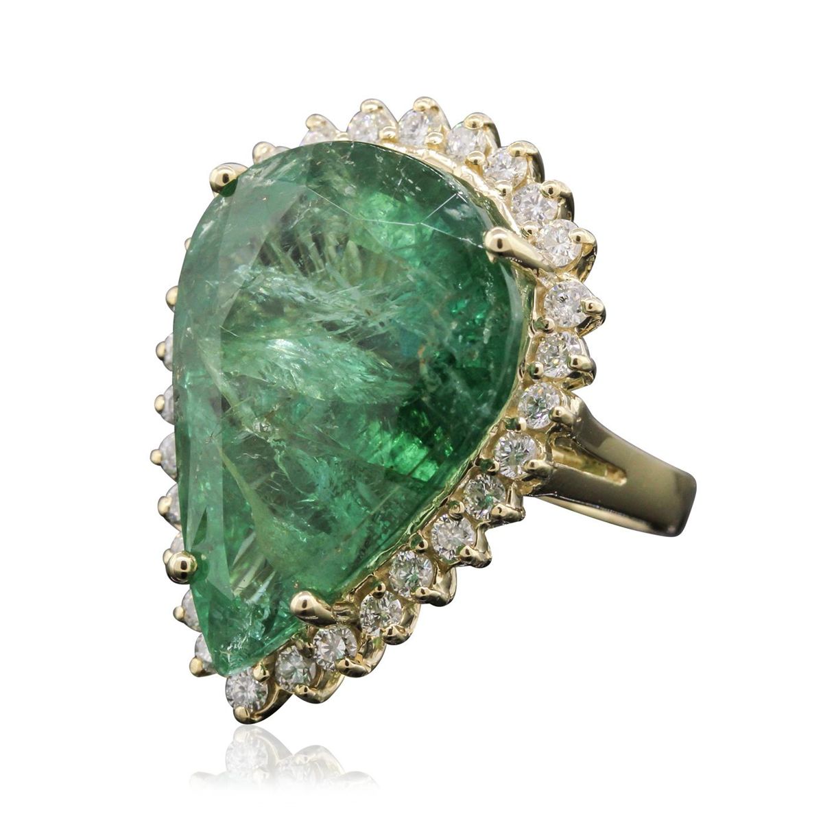 One electronically tested 14KT yellow gold ladies cast emerald and diamond ring with a bright polish finish. Condition is new, good workmanship. The featured emerald is set within a diamond bezel, supported by split shoulders and completed by a two and one half millimeter wide band. Identified with markings of "K14". Containing: One prong set pear mixed cut natural emerald, measuring 23.92 x 16.96 x 9.20mm, exact weight 19.13ct., clarity is heavily included, type III, medium, very slightly grayish, green color, (GIA G 5/3), cut is good. Transmitting light with a minimum of distortion, transparent to translucent. Naturally occurring internal & external characteristics are present. Indications of oil residue. GIA Gemological Report attached. Graded loose prior to setting in the GIA Laboratory, Report #2151952110.Twenty-Nine prong set round brilliant cut diamonds, measuring 2.10 - 2.00 x 1.23mm (depth est.) approximate. Total Weight of 29 Stones = 1.01ct. Graded in the setting. Clarity: SI-2 to I-1. Color: G - I. Total Weight of Colored Stones 19.13ct. Total Weight of Diamonds 1.01ct. Total Weight of Ring 12.60 grams. AIG Appraised at $24,985.00.