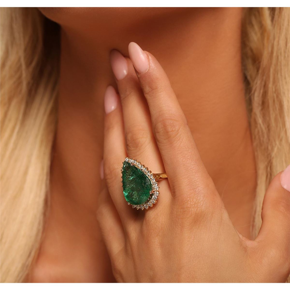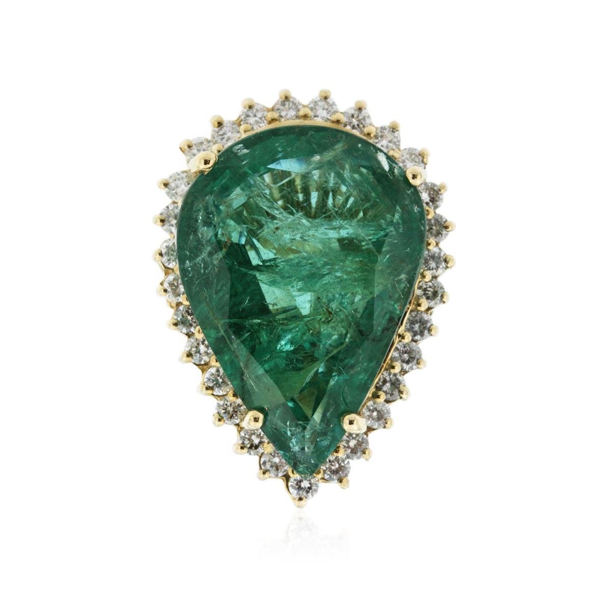 One electronically tested 14KT yellow gold ladies cast emerald and diamond ring with a bright polish finish. Condition is new, good workmanship. The featured emerald is set within a diamond bezel, supported by split shoulders and completed by a two and one half millimeter wide band. Identified with markings of "K14". Containing: One prong set pear mixed cut natural emerald, measuring 23.92 x 16.96 x 9.20mm, exact weight 19.13ct., clarity is heavily included, type III, medium, very slightly grayish, green color, (GIA G 5/3), cut is good. Transmitting light with a minimum of distortion, transparent to translucent. Naturally occurring internal & external characteristics are present. Indications of oil residue. GIA Gemological Report attached. Graded loose prior to setting in the GIA Laboratory, Report #2151952110.Twenty-Nine prong set round brilliant cut diamonds, measuring 2.10 - 2.00 x 1.23mm (depth est.) approximate. Total Weight of 29 Stones = 1.01ct. Graded in the setting. Clarity: SI-2 to I-1. Color: G - I. Total Weight of Colored Stones 19.13ct. Total Weight of Diamonds 1.01ct. Total Weight of Ring 12.60 grams. AIG Appraised at $24,985.00.