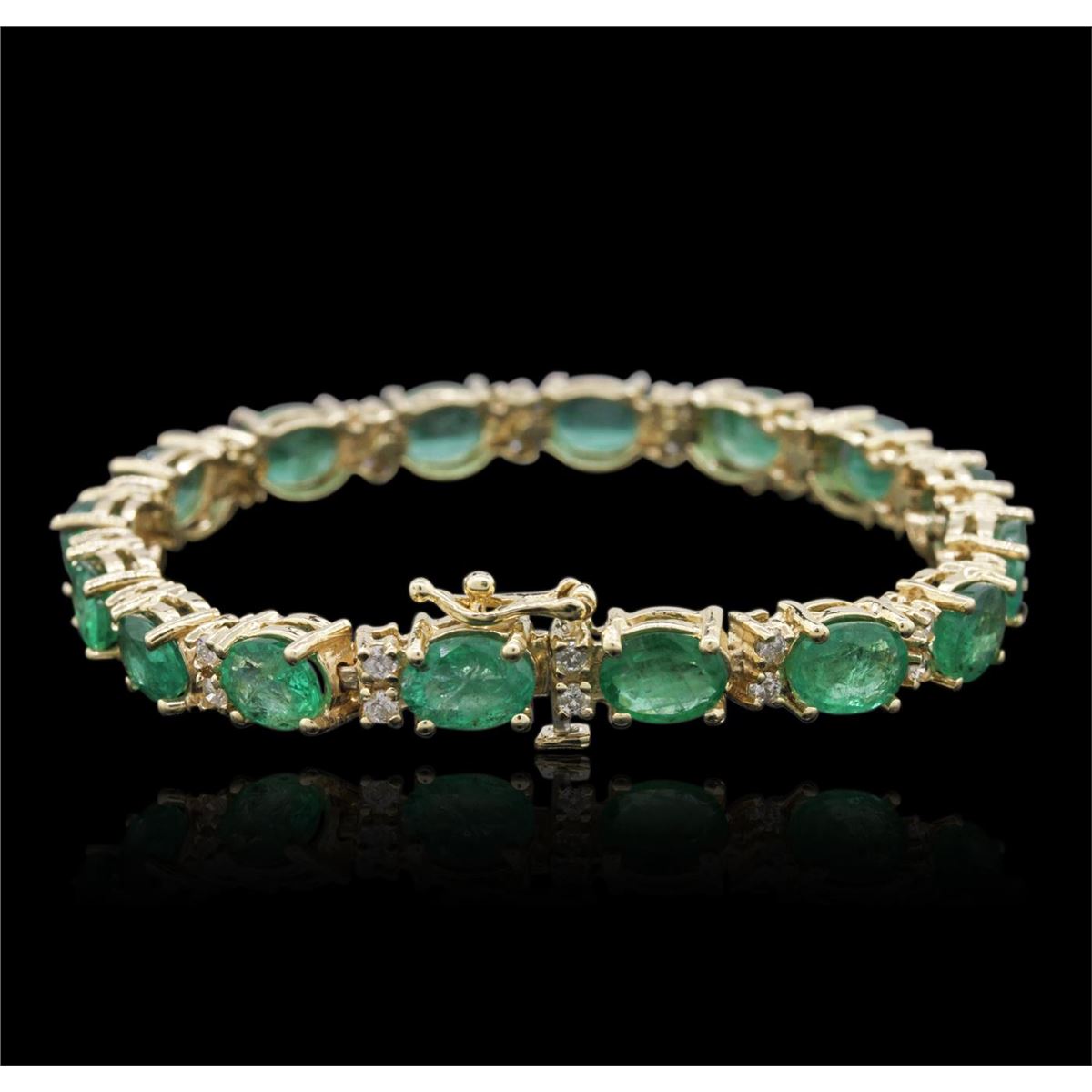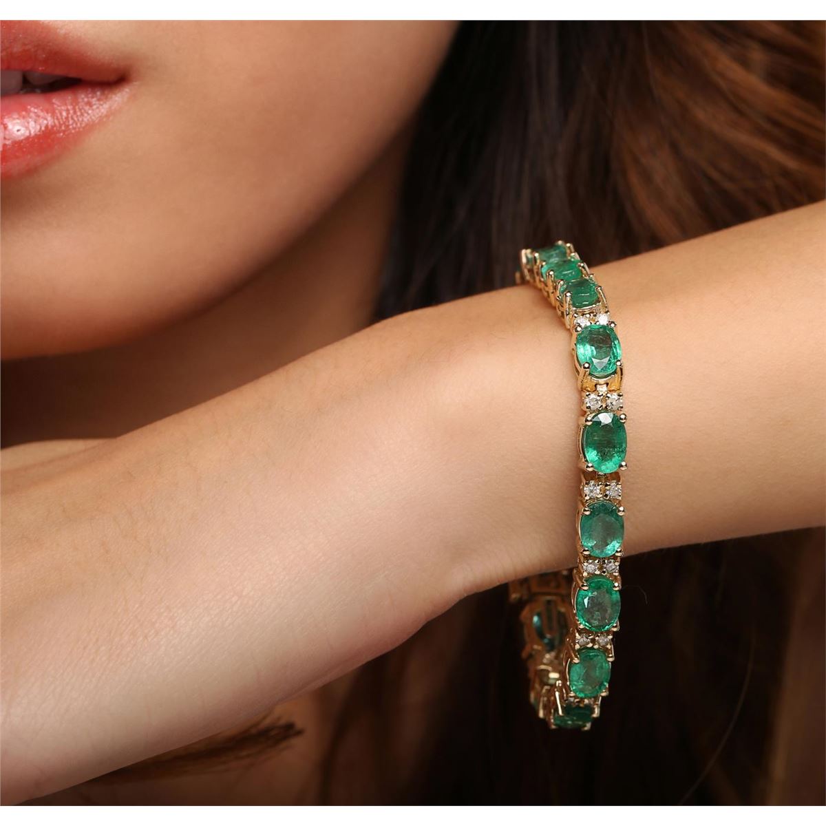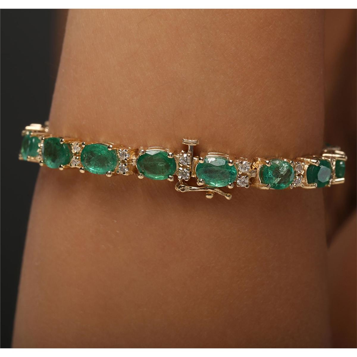 One electronically tested 14KT yellow gold ladies combination cast & assembled emerald and diamond bracelet with a hidden box clasp with safety closer with a bright polish finish. Measurements: 7" in length. Identified with markings of "14K". Condition is new. Containing: Sixteen prong set oval modified brilliant cut natural emeralds, measuring 8.23 x 5.93 x 4.40mm, approximate total weight of 19.20ct., clarity is moderately included, type III, medium light, very slightly grayish, green color, (GIA G 4/3), cut is good. Thirty-Two prong set round brilliant cut diamonds, measuring 1.80 - 1.80 x 1.08mm (depth est.) approximate total weight of 32 Stones = 0.68ct. Clarity: I-1 to I-2. Color: J - K, Cut is Good. Colored gemstones are presumed to have been subjected to commonly used enhancement processes. All diamonds and colored gemstones are graded in the mounting, unless otherwise stated. Total Weight of Colored Stones 19.20ct. Total Weight of Diamonds 0.68ct. Total Weight of Bracelet 20.80 grams. GGL Appraised at $8,935.00.