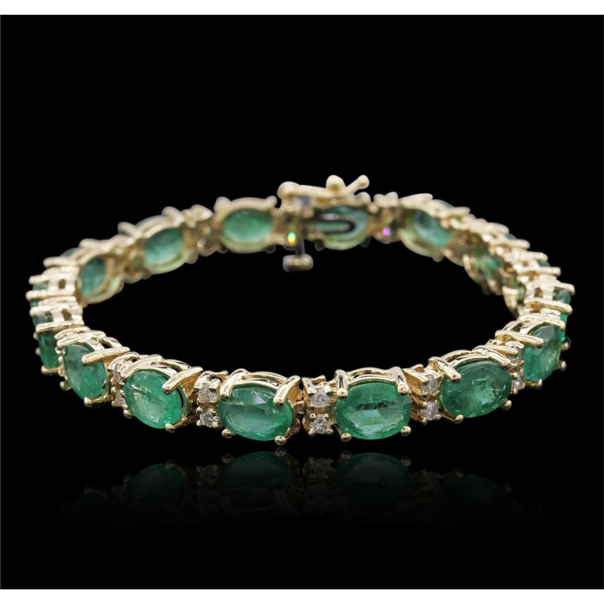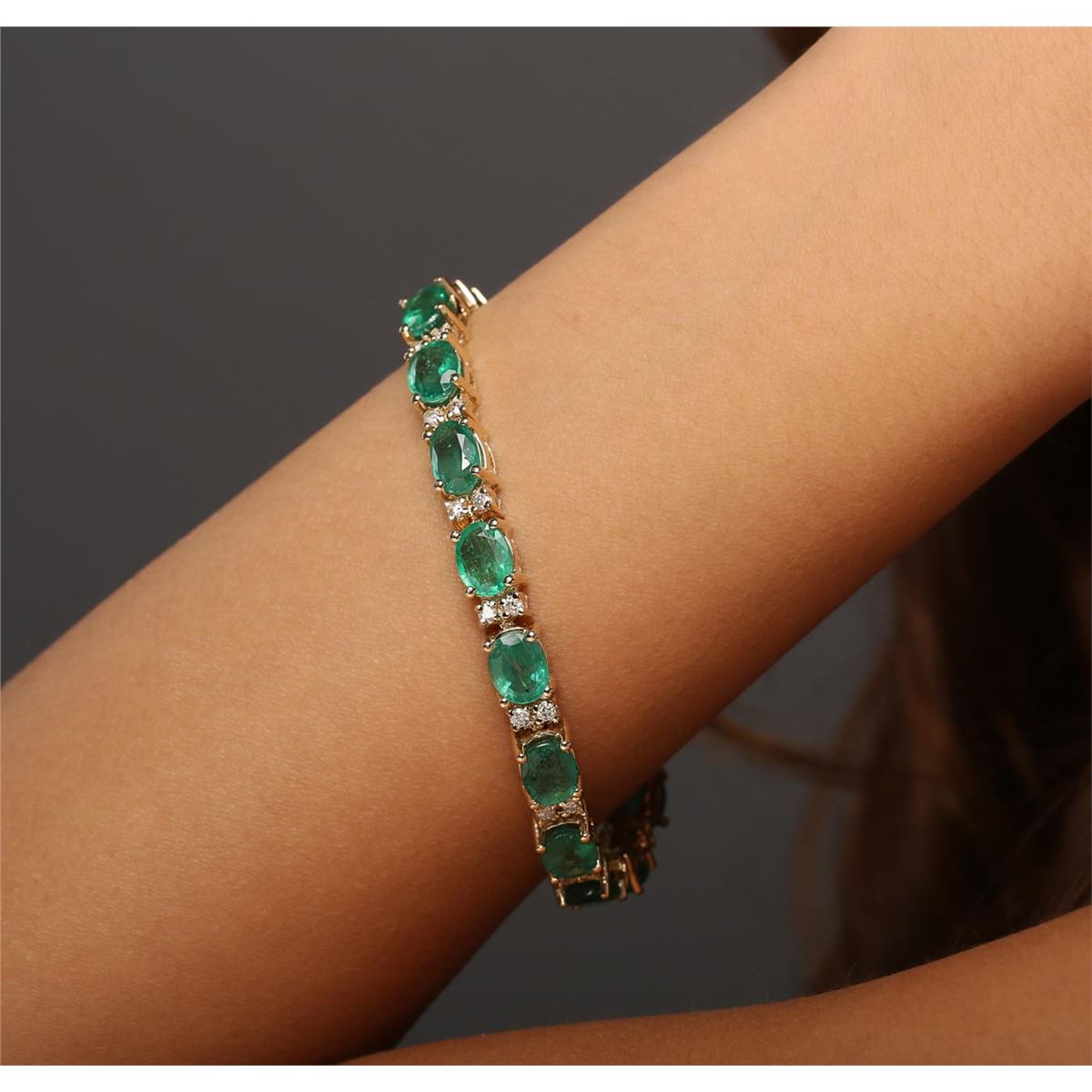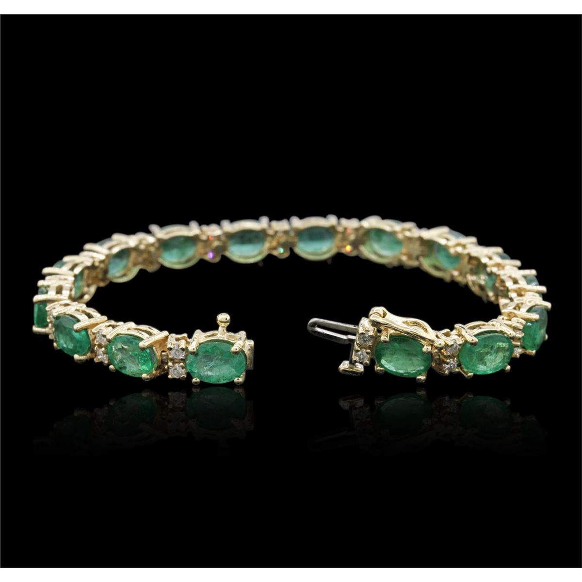 One electronically tested 14KT yellow gold ladies combination cast & assembled emerald and diamond bracelet with a hidden box clasp with safety closer with a bright polish finish. Measurements: 7" in length. Identified with markings of "14K". Condition is new. Containing: Sixteen prong set oval modified brilliant cut natural emeralds, measuring 8.23 x 5.93 x 4.40mm, approximate total weight of 19.20ct., clarity is moderately included, type III, medium light, very slightly grayish, green color, (GIA G 4/3), cut is good. Thirty-Two prong set round brilliant cut diamonds, measuring 1.80 - 1.80 x 1.08mm (depth est.) approximate total weight of 32 Stones = 0.68ct. Clarity: I-1 to I-2. Color: J - K, Cut is Good. Colored gemstones are presumed to have been subjected to commonly used enhancement processes. All diamonds and colored gemstones are graded in the mounting, unless otherwise stated. Total Weight of Colored Stones 19.20ct. Total Weight of Diamonds 0.68ct. Total Weight of Bracelet 20.80 grams. GGL Appraised at $8,935.00.