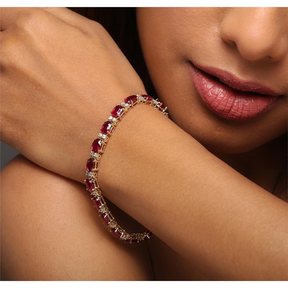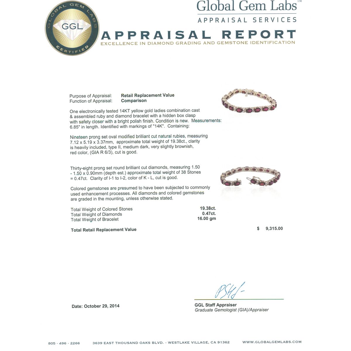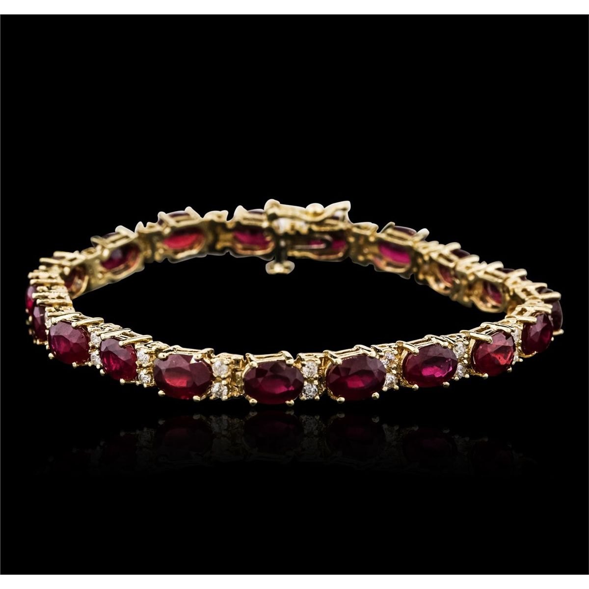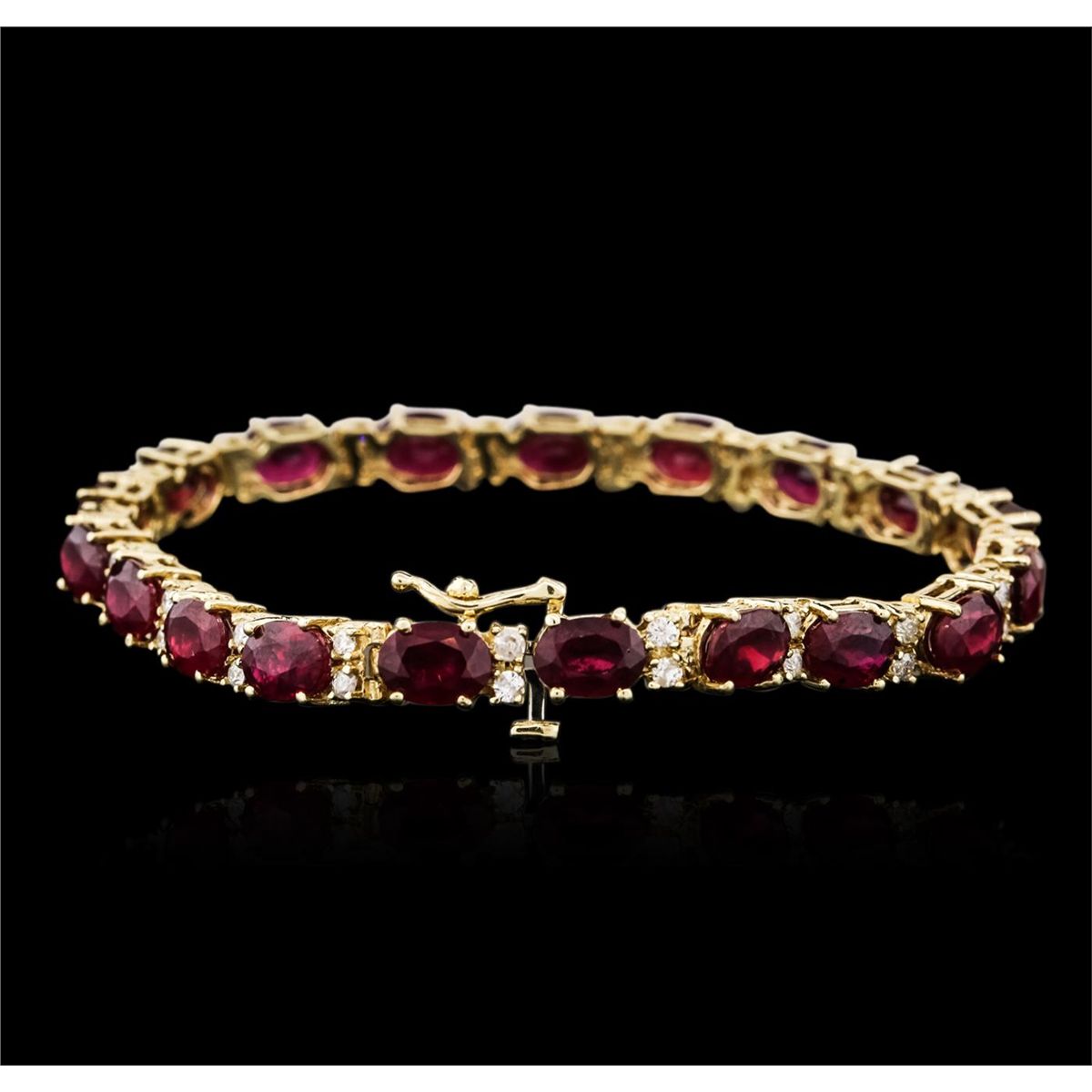 One electronically tested 14KT yellow gold ladies combination cast & assembled ruby and diamond bracelet with a hidden box clasp with safety closer with a bright polish finish. Measurements: 6.85 in length. Identified with markings of 14K. Condition is new. Containing: Nineteen prong set oval modified brilliant cut natural rubies, measuring 7.12 x 5.19 x 3.37mm, approximate total weight of 19.38ct., clarity is heavily included, type II, medium dark, very slightly brownish, red color, (GIA R 6/3), cut is good. Thirty-Eight prong set round brilliant cut diamonds, measuring 1.50 - 1.50 x 0.90mm (depth est.) approximate total weight of 38 Stones = 0.47ct. Clarity: I-1 to I-2. Color: K - L, Cut is Good. Colored gemstones are presumed to have been subjected to commonly used enhancement processes. All diamonds and colored gemstones are graded in the mounting, unless otherwise stated. Total Weight of Colored Stones 19.38ct. Total Weight of Diamonds 0.47ct. Total Weight of Bracelet 16.00 grams. GGL Appraised at $9,315.00.