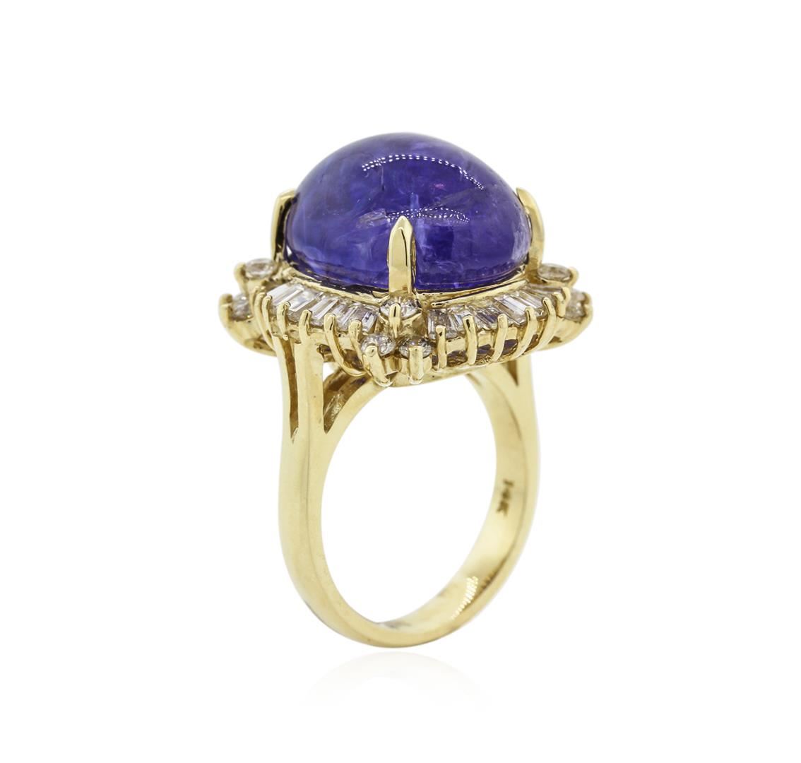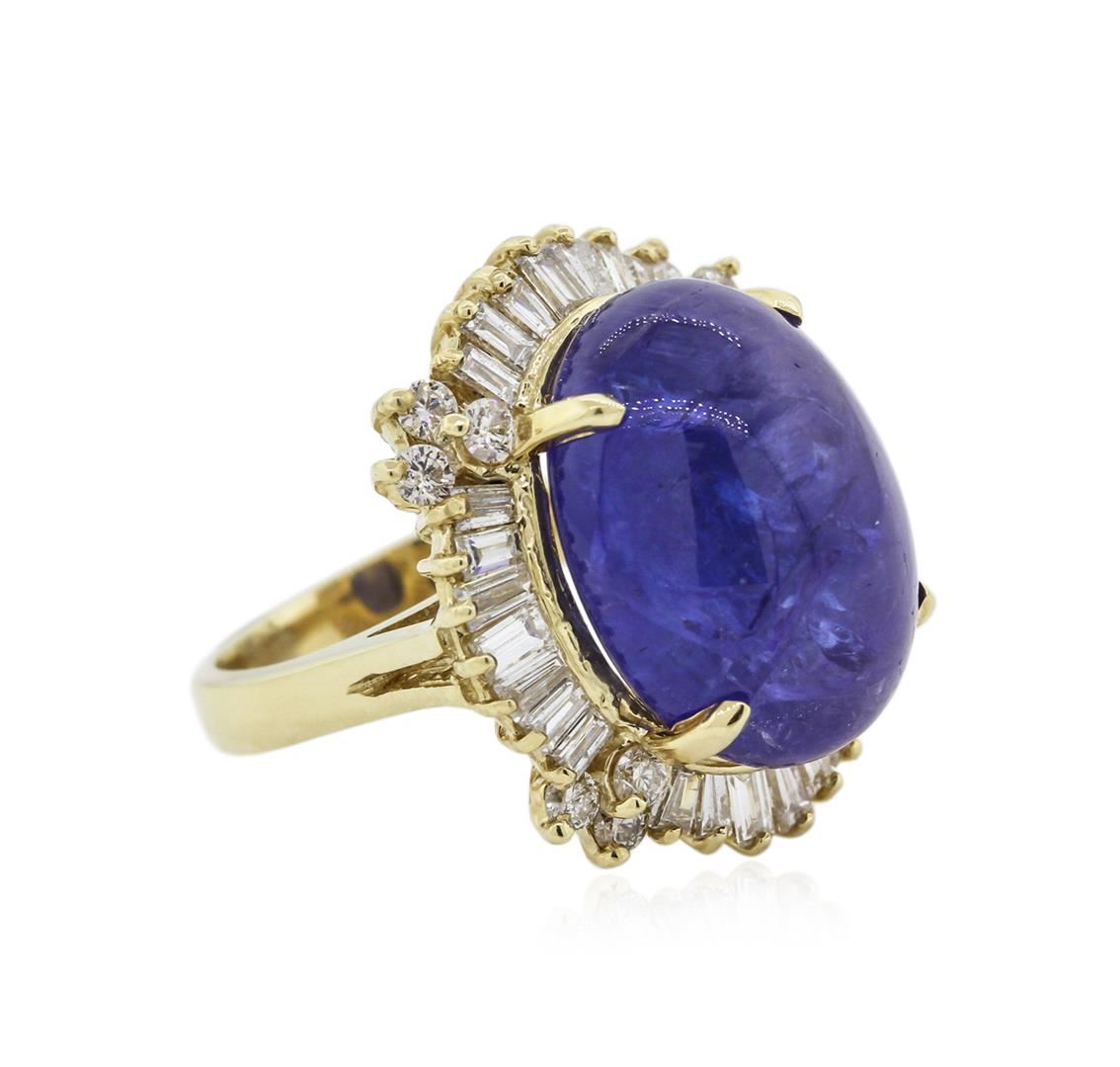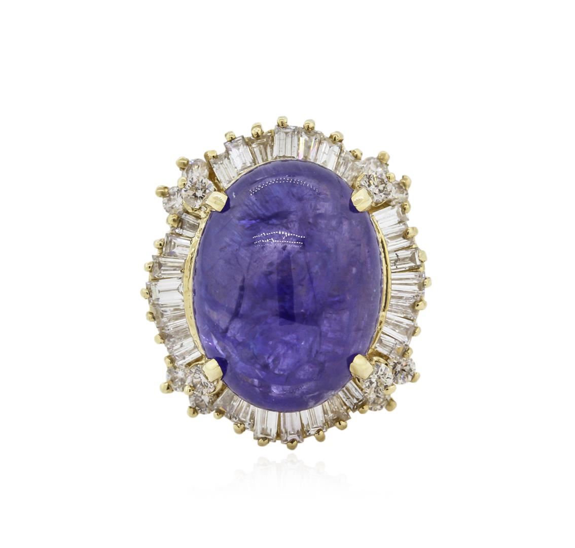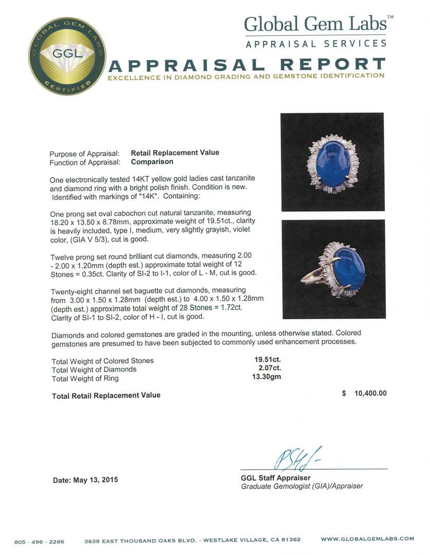 One electronically tested 14KT yellow gold ladies cast tanzanite and diamond ring with a bright polish finish. Identified with markings of "14K". Condition is new. Containing: One prong set oval cabochon cut natural tanzanite, measuring 18.20 x 13.50 x 8.78mm, approximate weight of 19.51ct., clarity is heavily included, type I, medium, very slightly grayish, violet color, (GIA V 5/3), cut is good. Twelve prong set round brilliant cut diamonds, measuring 2.00 - 2.00 x 1.20mm (depth est.) approximate total weight of 12 Stones = 0.35ct. Clarity: SI-2 to I-1. Color: L - M, Cut is Good. Twenty-Eight channel set baguette cut diamonds, measuring from 3.00 x 1.50 x 1.28mm (depth est.) to 4.00 x 1.50 x 1.28mm (depth est.) approximate total weight of 28 Stones = 1.72ct. Clarity: SI-1 to SI-2. Color: H - I, Cut is Good. Diamonds and colored gemstones are graded in the mounting, unless otherwise stated. Colored gemstones are presumed to have been subjected to commonly used enhancement processes. Total Weight of Colored Stones 19.51ct. Total Weight of Diamonds 2.07ct. Total Weight of Ring 13.30 grams. GGL Appraised at $10,400.00.