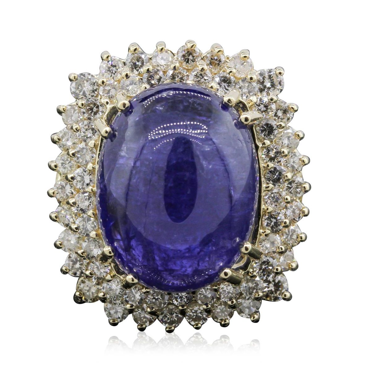 One electronically tested 14KT yellow gold ladies cast tanzanite and diamond ring with a bright polish finish. Condition is new, good workmanship. The featured tanzanite is set within two tiered diamond bezels supported by tapering shoulders, completed by a two and one-half millimeter wide band. Identified with markings of "K14". Containing: One prong set oval cabochon cut natural tanzanite, measuring 18.35 x 14.15 x 7.30mm, 15%. bulge factor, approximate weight of 19.72ct., clarity is heavily included, type I, dark, moderately strong, bluish violet color, (GIA bV 7/4), cut is good. Transmitting light somewhat diffusely, translucent. Naturally occurring internal & external characteristics are present. Colored Stone Grading Report attached. Graded in the setting. Sixty prong set round brilliant cut diamonds, measuring 2.20 - 2.00 x 1.26mm (depth est.) approximate. Total Weight of 60 Stones = 2.13ct. Graded in the setting. Clarity: SI-1 to I-1. Color: I - K. Total Weight of Colored Stones 19.72ct. Total Weight of Diamonds 2.13ct. Total Weight of Ring 15.99 grams. AIG Appraised at $13,045.00.
