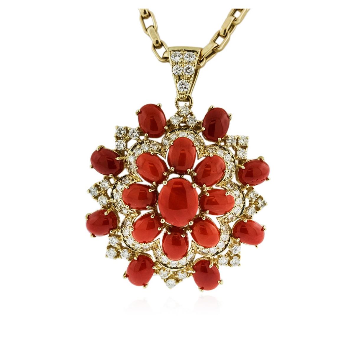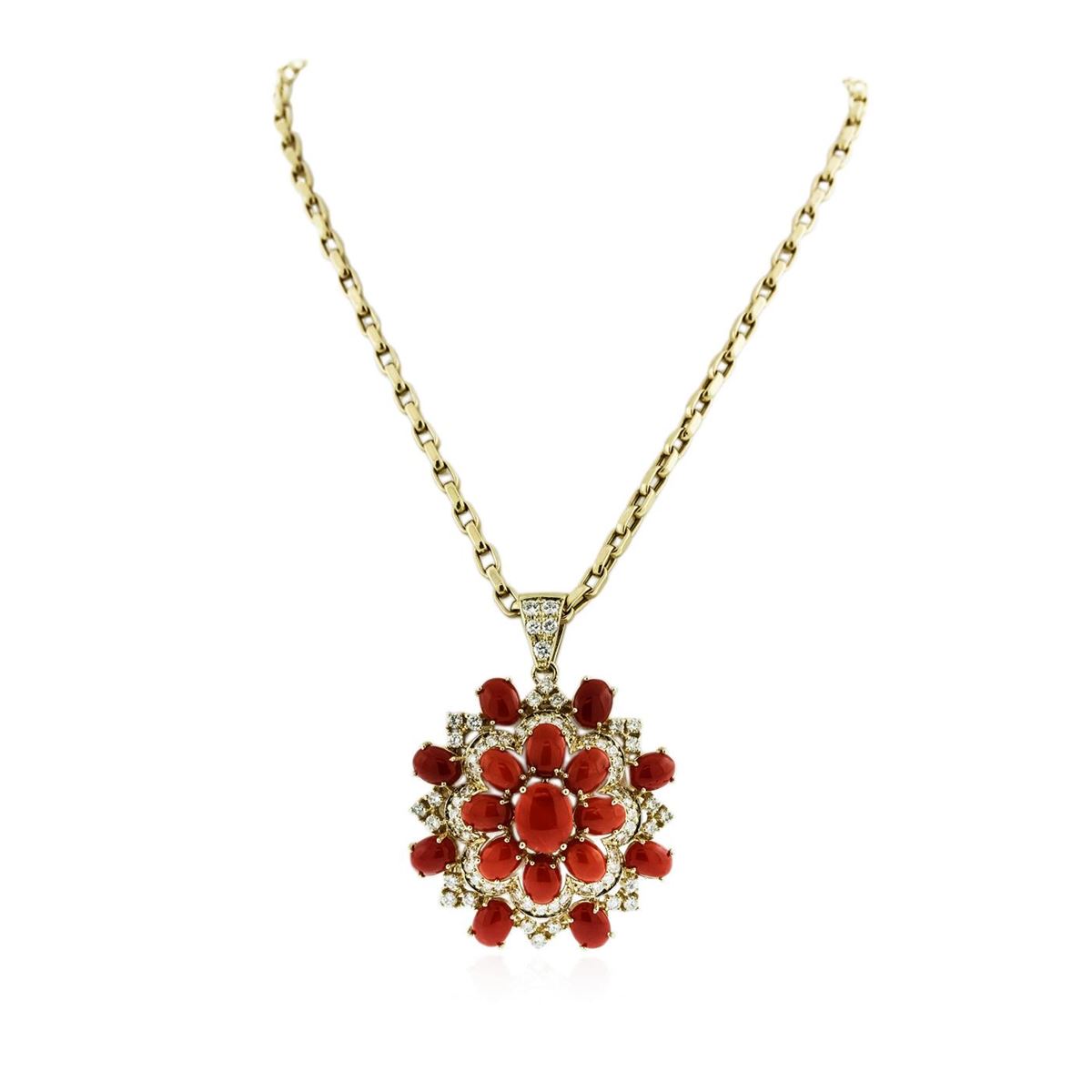 One electronically tested 14KT yellow gold ladies cast & assembled coral and diamond pendant with chain. Condition is new, good workmanship. The pendant features a stylized coral and diamond floret, completed by a diamond set bail. The pendant is supported by an eighteen inch length 14KT yellow gold designer style chain, terminating in a lobster claw clasp. Bright polish finish. Identified with markings of "K14". Containing: Seventeen prong set oval cabochon cut natural red corals approximate total weight of 19.87ct., clarity is severely included, medium dark, very slightly brownish, orangy red color, (GIA oR 6/3), cut is good. Transmitting light very diffusely, opaque, Naturally occurring internal & external characteristics are present. Color grade is an average for the group. Graded in the setting. Red Coral (Corallium Japonicum) is formed undersea by microscopic animals called coral polyps. These tiny, creatures form minute, hard shells. As a colony grows, it takes on complex branching, tree-like forms which allows the maximum number of polyps to be fed by the nutrients in the water. It grows about one quarter inch per year. This color of coral is commonly treated to improve or change the color and stability. Evidence that may confirm this is typically lacking. Sixty-nine bead and prong set round brilliant cut diamonds, measuring 2.50 - 2.20 x 1.41mm (depth est.) approximate total weight of 69 Stones = 3.06ct. Graded in the setting. Clarity SI-1 to I-1. Color G - I. Total Weight of Colored Stones 19.87ct. Total Weight of Diamonds 3.06et. Total Weight of Pendant With Chain 31.93gm. AIG Appraised at $20,440.00.
