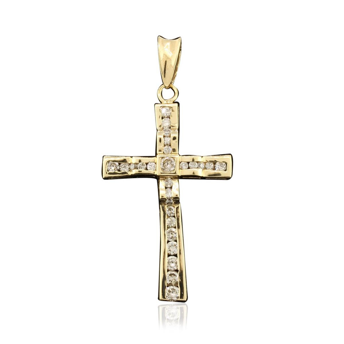 One electronically tested 14KT yellow gold Ladies combination cast & assembled cross pendant with a bright polish finish. Condition is excellent. Containing: Six channel set round brilliant cut diamonds, measuring 4.00 - 3.00 x 2.10mm (depth est.) approximate total weight of 6 Stones = 0.94ct. Clarity of I-1, Color of L - M, Cut is Good. Twenty channel set round brilliant cut diamonds, measuring 2.60 - 2.10 x 1.41mm (depth est.) approximate total weight of 20 Stones = 1.06ct. Clarity of SI-2 to I-1, Color of L - M, Cut is Good. Total Weight of Diamonds 2.00ct. Total Weight of Pendant 8.50gm. GGL Appraised at $5,540.00.