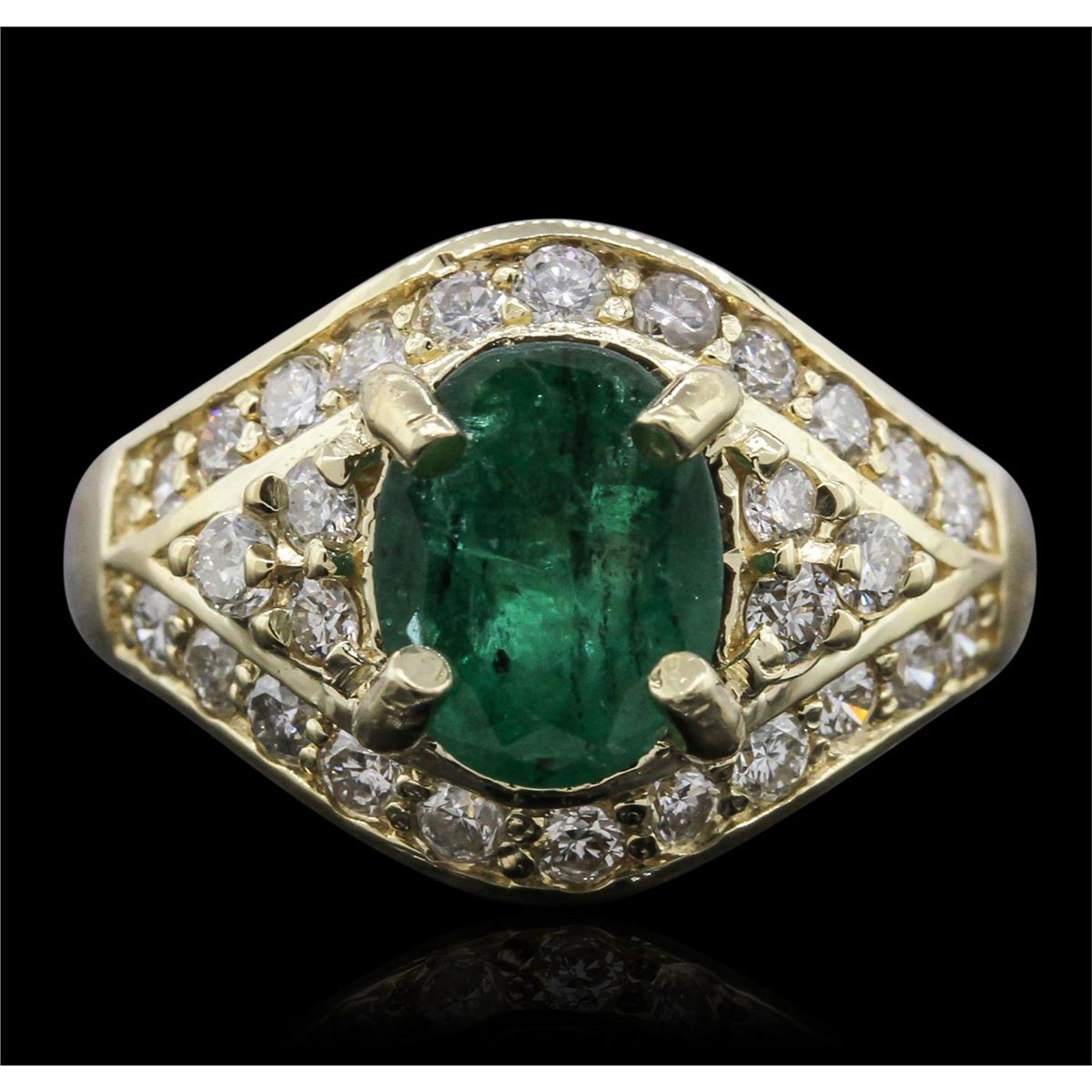One electronically tested 14KT yellow gold ladies cast emerald and diamond ring with a bright polish finish. Condition is new, good workmanship. The featured emerald is supported by diamond accented shoulders framed by mirroring ribbons of diamonds, completed by a three and one-half millimeter wide. Identified with markings of "K14". Containing: One prong set oval mixed cut natural emerald, measuring 9.10 x 7.10 x 5.10mm, 8% bulge factor, approximate weight of 2.01ct, clarity is heavily included, type III, medium dark, moderately strong, very slightly bluish green color, (GIA vslbG 6/4), cut is good. Transmitting light with a minimum of distortion, transparent to translucent. Naturally occurring internal & external characteristics are present. Indications of oil & opticon residue. Graded in the setting. Twenty-Eight prong & bead set round brilliant cut diamonds, measuring 2.20 - 2.00 x 1.26mm (depth est.) approximate total weight of 28 Stones = 1.05ct. Graded in the setting. Clarity SI-2 to I-1 Color G - I Total Weight of Colored Stones 2.01ct. Total Weight of Diamonds 1.05ct. Total Weight of Ring 7.80 grams. AIG Appraised at $7,400.00.