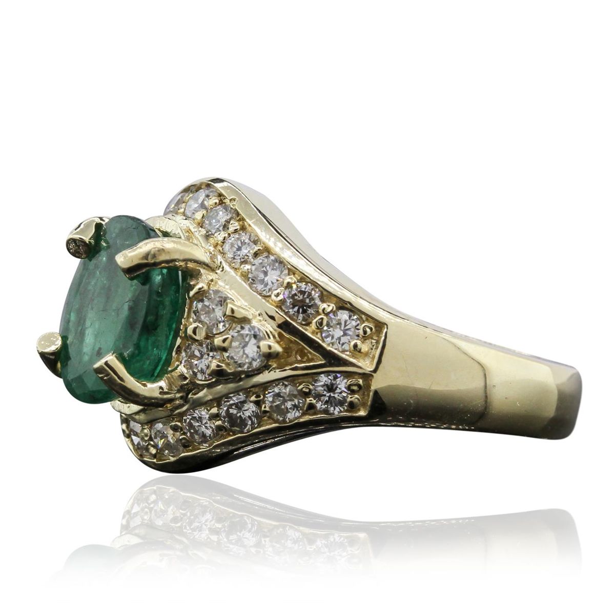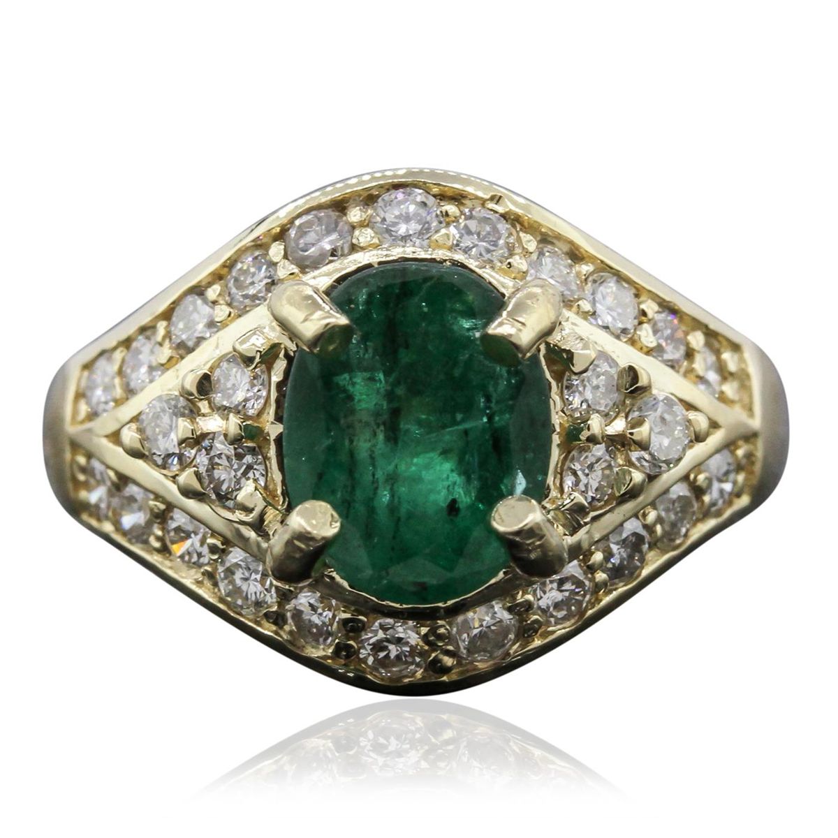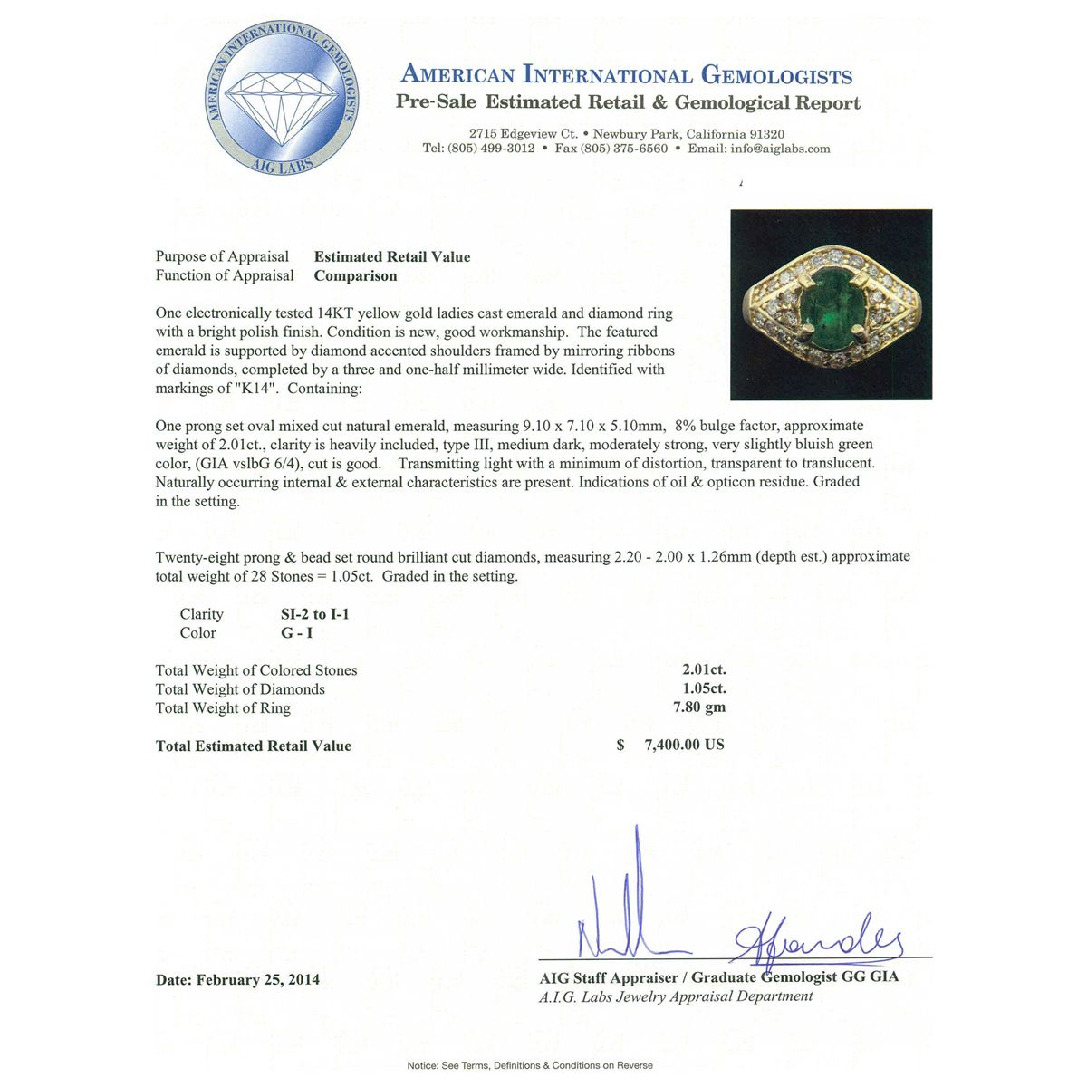 One electronically tested 14KT yellow gold ladies cast emerald and diamond ring with a bright polish finish. Condition is new, good workmanship. The featured emerald is supported by diamond accented shoulders framed by mirroring ribbons of diamonds, completed by a three and one-half millimeter wide. Identified with markings of "K14". Containing: One prong set oval mixed cut natural emerald, measuring 9.10 x 7.10 x 5.10mm, 8% bulge factor, approximate weight of 2.01ct, clarity is heavily included, type III, medium dark, moderately strong, very slightly bluish green color, (GIA vslbG 6/4), cut is good. Transmitting light with a minimum of distortion, transparent to translucent. Naturally occurring internal & external characteristics are present. Indications of oil & opticon residue. Graded in the setting. Twenty-Eight prong & bead set round brilliant cut diamonds, measuring 2.20 - 2.00 x 1.26mm (depth est.) approximate total weight of 28 Stones = 1.05ct. Graded in the setting. Clarity SI-2 to I-1 Color G - I Total Weight of Colored Stones 2.01ct. Total Weight of Diamonds 1.05ct. Total Weight of Ring 7.80 grams. AIG Appraised at $7,400.00.