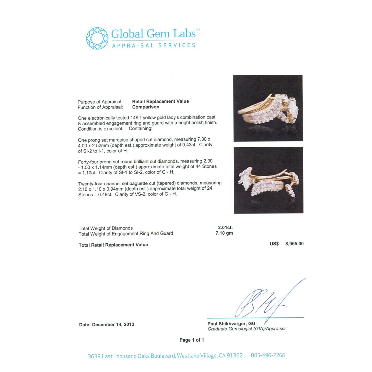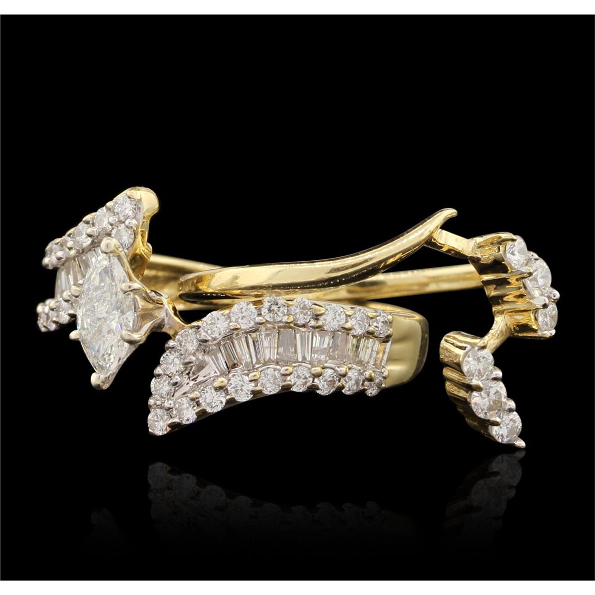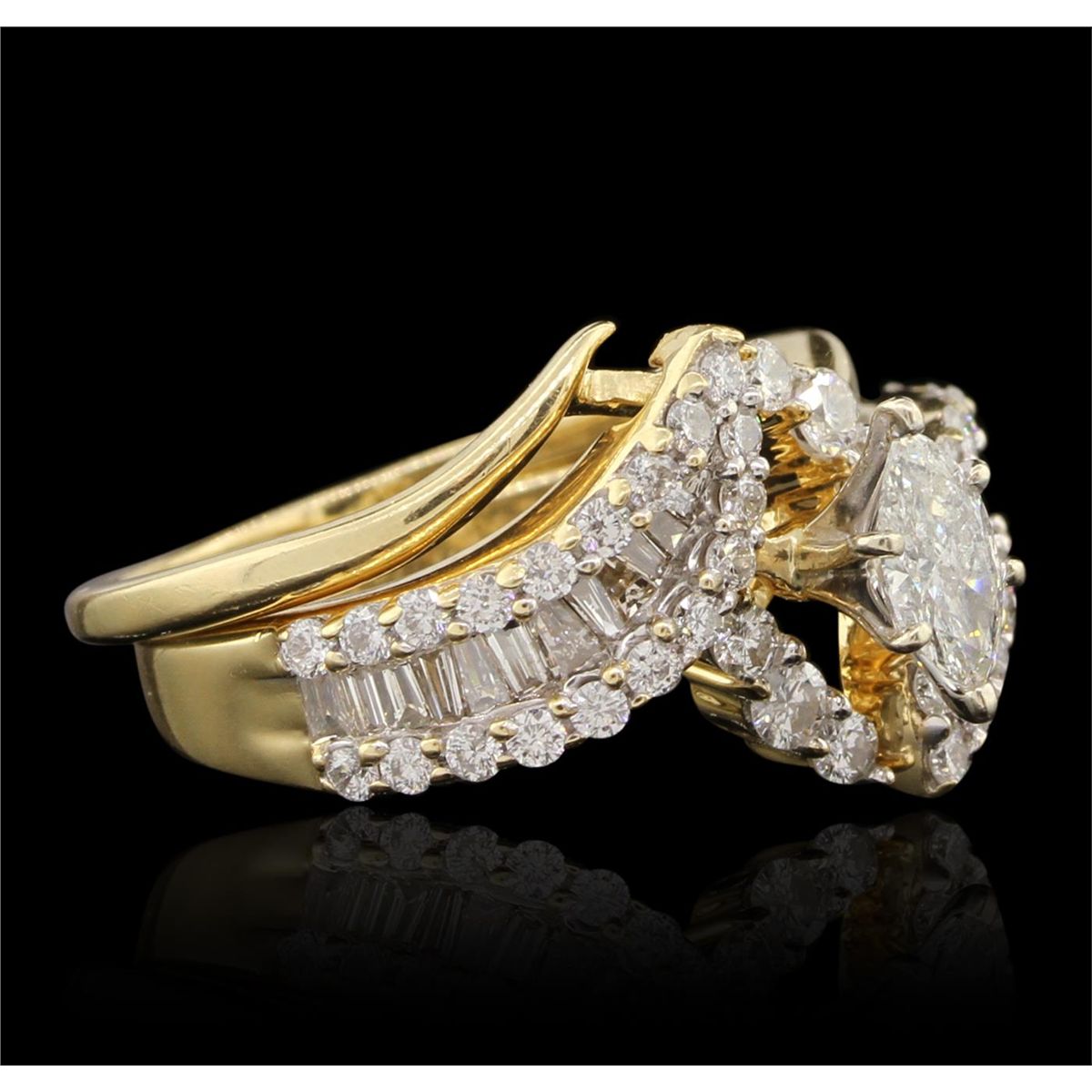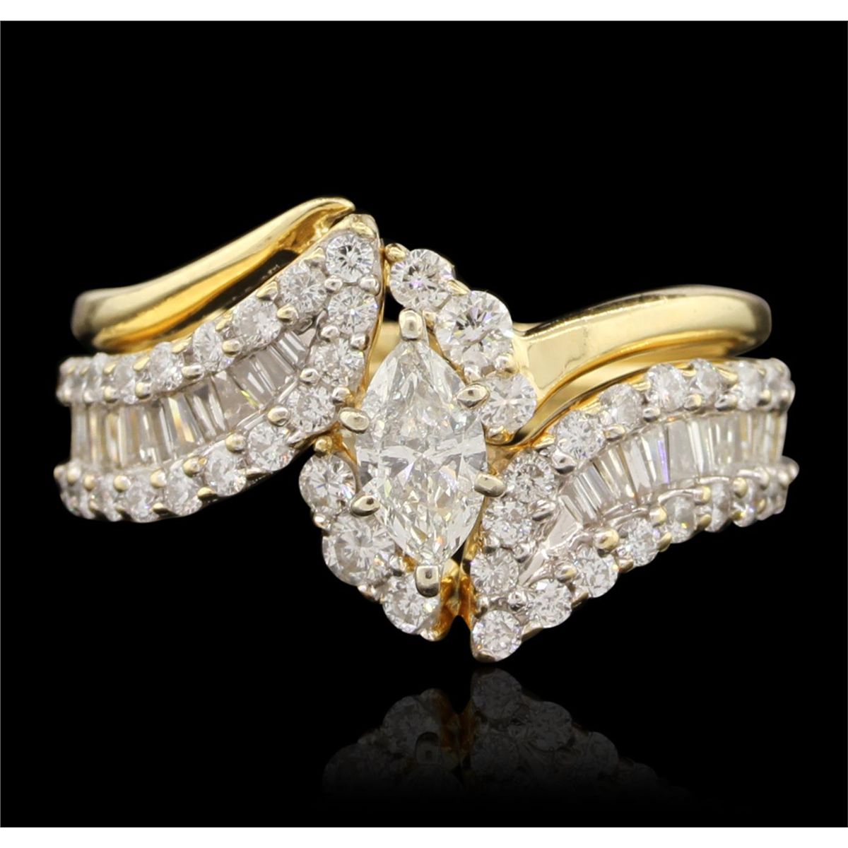 One electronically tested 14KT yellow gold Ladies combination cast & assembled engagement ring and guard with a bright polish finish. Condition is excellent. Containing: One prong set marquise shaped cut diamond, measuring 7.30 x 4.00 x 2.52mm (depth est.) approximate weight of 0.43ct. Clarity of SI-2 to I-1, Color of H. Forty-Four prong set round brilliant cut diamonds, measuring 2.30 - 1.50 x 1.14mm (depth est.) approximate total weight of 44 Stones = 1.10ct. Clarity of SI-1 to SI-2, Color of G - H. Twenty-Four channel set baguette cut (tapered) diamonds, measuring 2.10 x 1.10 x 0.94mm (depth est.) approximate total weight of 24 Stones = 0.48ct. Clarity of VS-2, Color of G - H. Total Weight of Diamonds 2.01ct. Total Weight of Engagement Ring and Guard 7.10gm. GGL Appraised at $8,965.00.