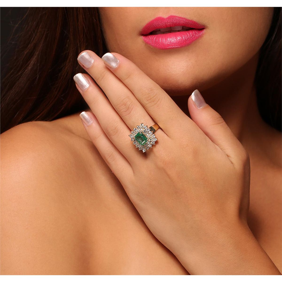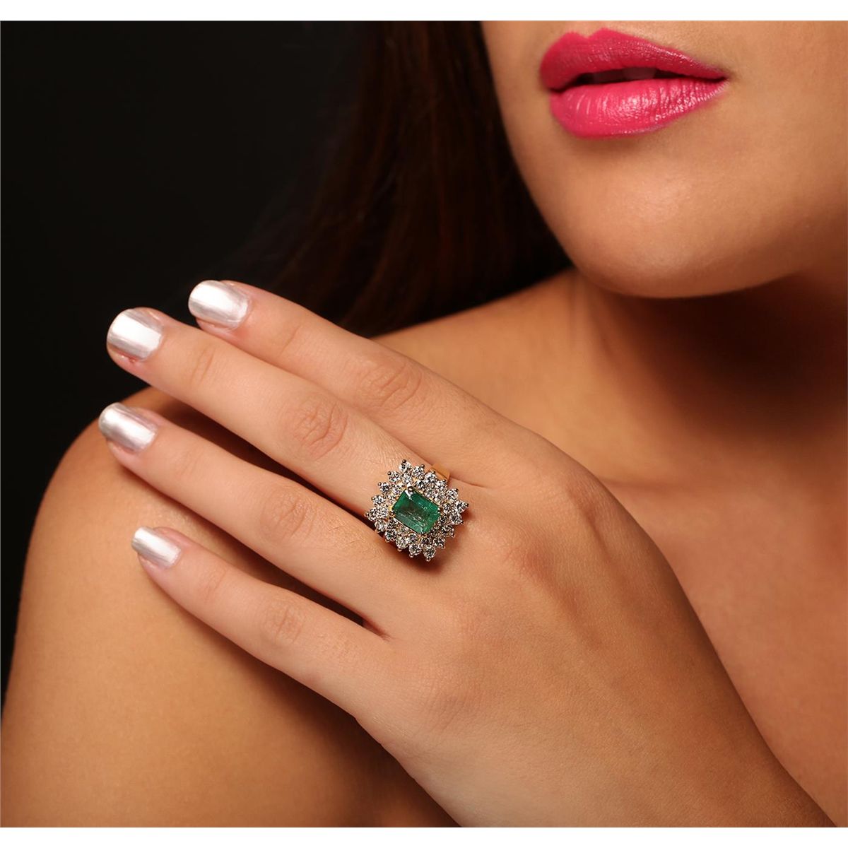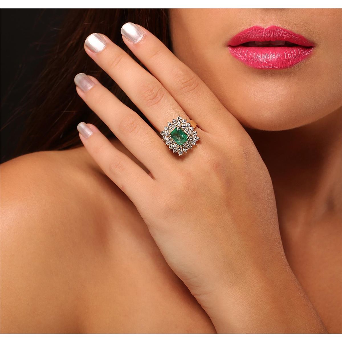 One electronically tested 14KT yellow gold Ladies combination cast & assembled fashion ring with a high polish finish. Condition is new. Identified with markings of "14K". Containing: One prong set emerald standard step cut natural emerald, measuring 8.80 x 6.80 x 4.60mm, approximate weight of 2.02ct., clarity is heavily included, type III, medium light, very slightly grayish, very slightly bluish green color, (GIA vslbG 4/3), cut is good. Colored gemstones are presumed to have been subjected to commonly used and possible undetectable color/clarity enhancement processes. Thirty-Two prong set round brilliant cut diamonds, measuring 2.50 - 2.30 x 1.44mm (depth est.) approximate total weight of 32 Stones = 1.62ct. Clarity of SI-1 to I-1, Color of J - K, Cut is Good. Total Weight of Colored Stones 2.02ct. Total Weight of Diamonds 1.62ct. Total Weight of Ring 9.50 grams. GGL Appraised at $10,325.00.