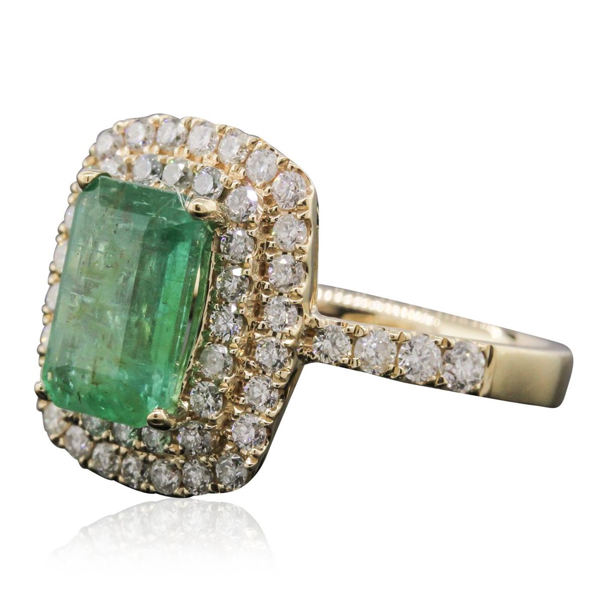 One electronically tested 14KT yellow gold Ladies combination cast & assembled ring with a high polish finish. Condition is new. Identified with markings of "14K". Containing: One prong set emerald standard step cut natural emerald, measuring 10.00 x 7.00 x 3.90mm, approximate weight of 2.03ct., clarity is heavily included, type III, medium light, very slightly grayish, very slightly bluish green color, (GIA vslbG 4/3), cut is good. Colored gemstones are presumed to have been subjected to commonly used color/clarity enhancement processes. Fifty-Four bead set round brilliant cut diamonds, measuring 2.10 - 1.40 x 1.05mm (depth est.) approximate. Total Weight of 54 Stones = 0.97ct. Clarity: I-1 to I-2. Color: I - J, Cut is Good. Total Weight of Colored Stones 2.03ct. Total Weight of Diamonds 0.97ct. Total Weight of Ring 5.80 grams. GGL Appraised at $7,680.00.