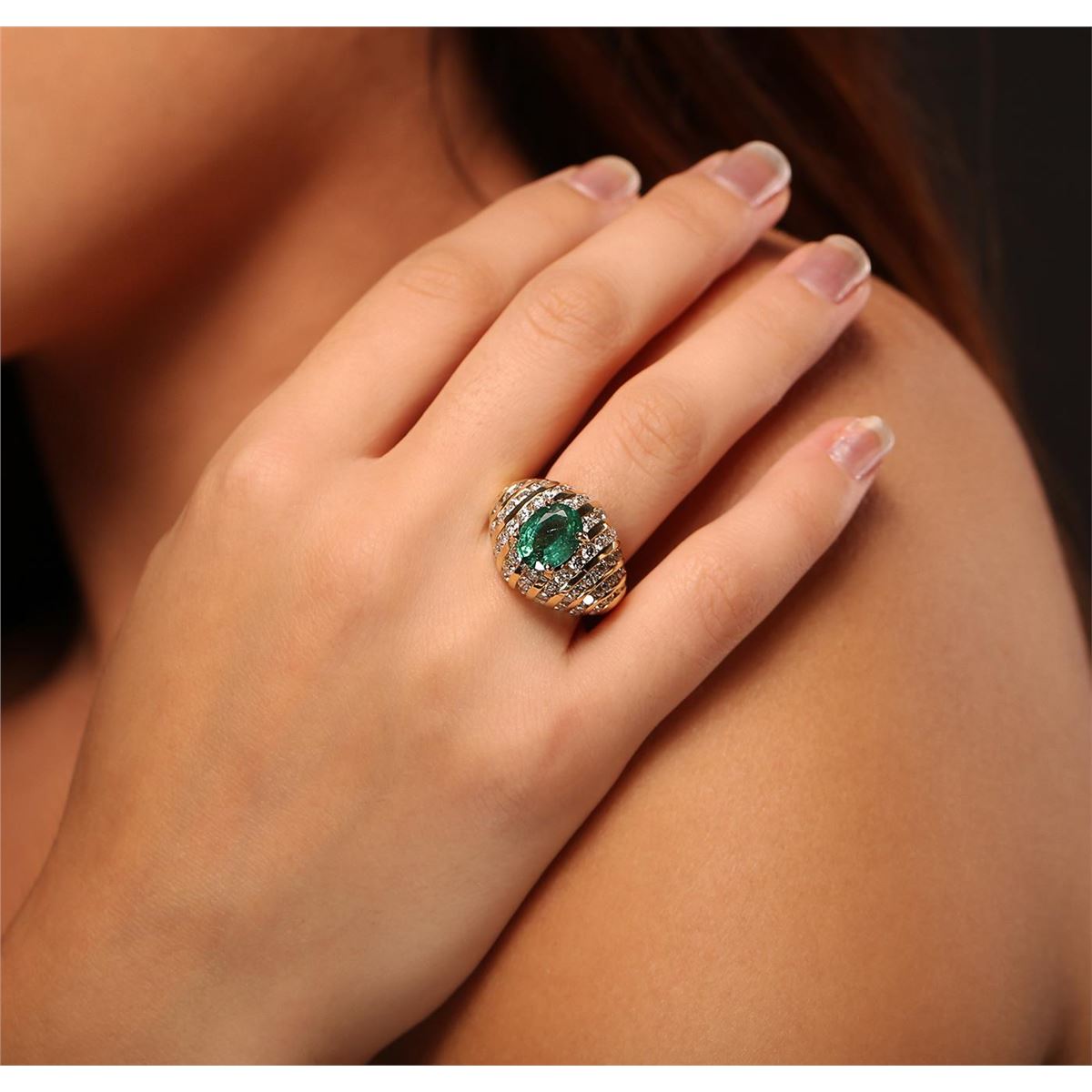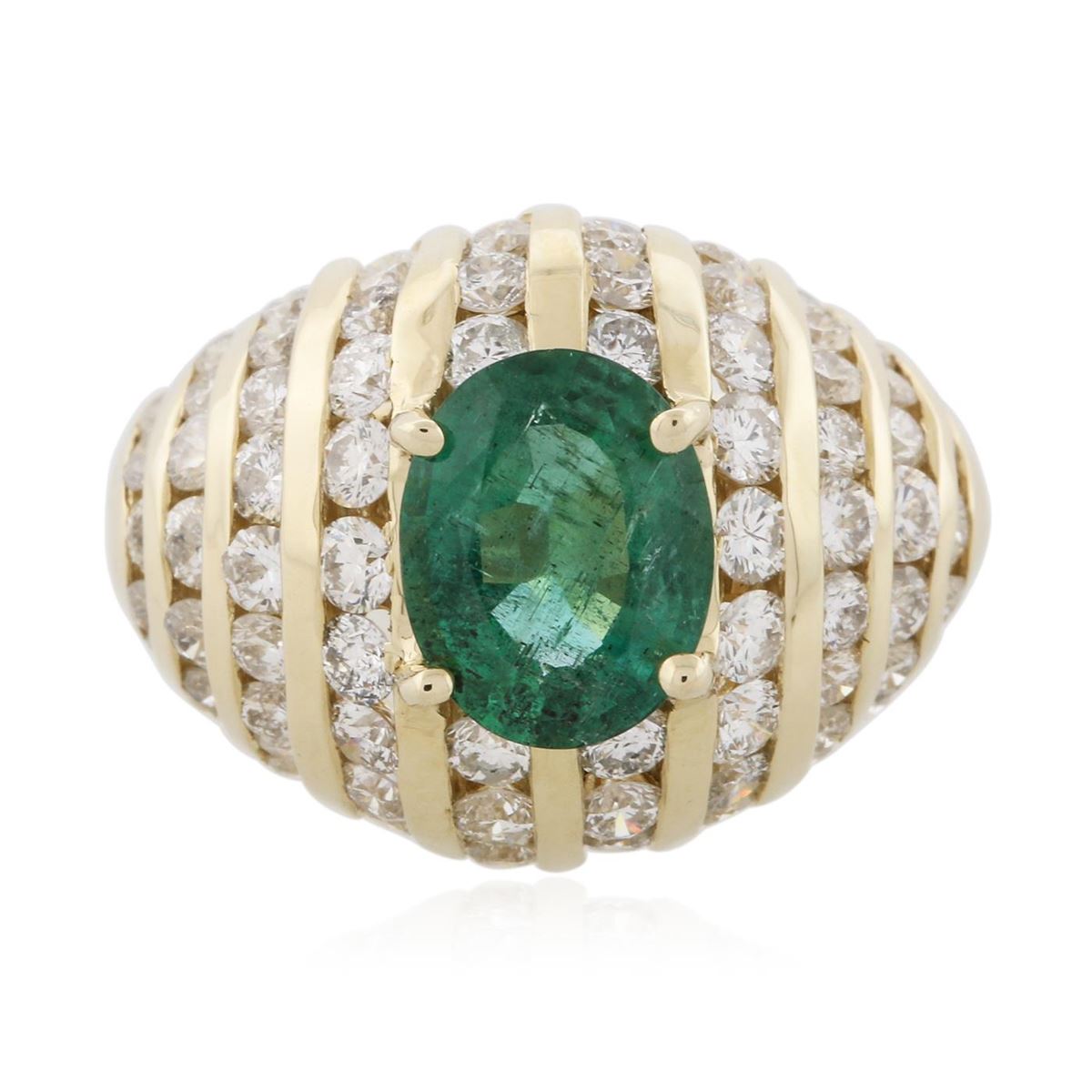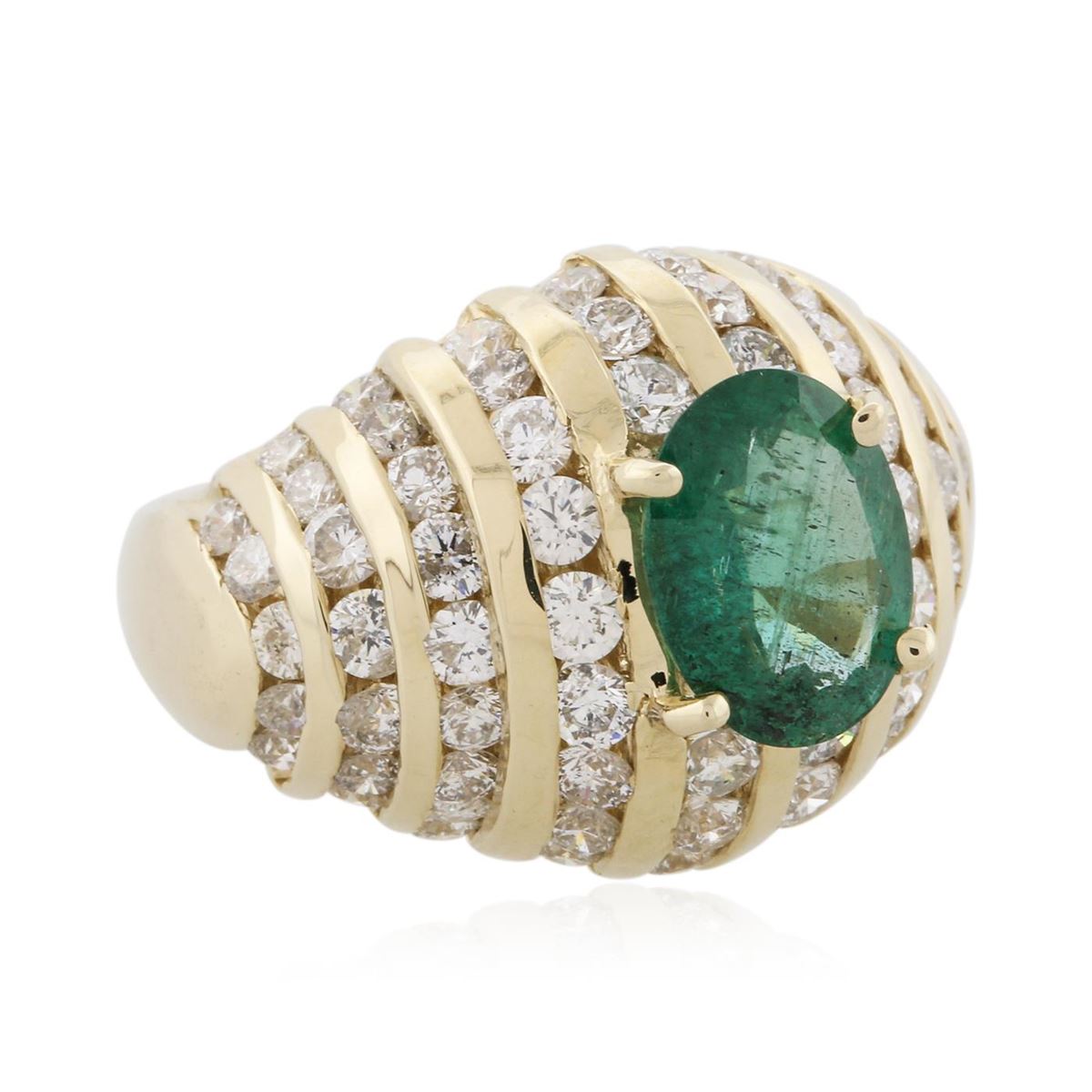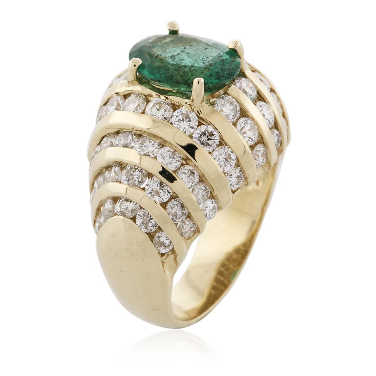 One electronically tested 14KT yellow gold Ladies combination cast & assembled fashion ring with a high polish finish. Condition is new. Identified with markings of "14K". Containing: One prong set oval modified mixed cut natural emerald, measuring 9.95 x 8.08 x 4.60mm, approximate weight of 2.03ct., clarity is heavily included, type III, medium, very slightly grayish, very slightly bluish green color, (GIA vslbG 5/3), cut is good. Colored gemstones are presumed to have been subjected to commonly used and possible undetectable color/clarity enhancement processes. Sixty-Six prong set round brilliant cut diamonds, measuring 2.50 - 1.50 x 1.20mm (depth est.) approximate total weight of 66 Stones = 1.93ct. Clarity of SI-1 to I-1, Color of I - J, Cut is Good. Total Weight of Colored Stones 2.03ct. Total Weight of Diamonds 1.93ct. Total Weight of Ring 12.70 grams. GGL Appraised at $12,415.00.