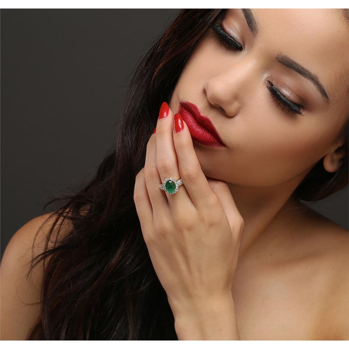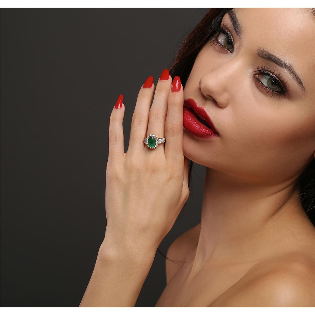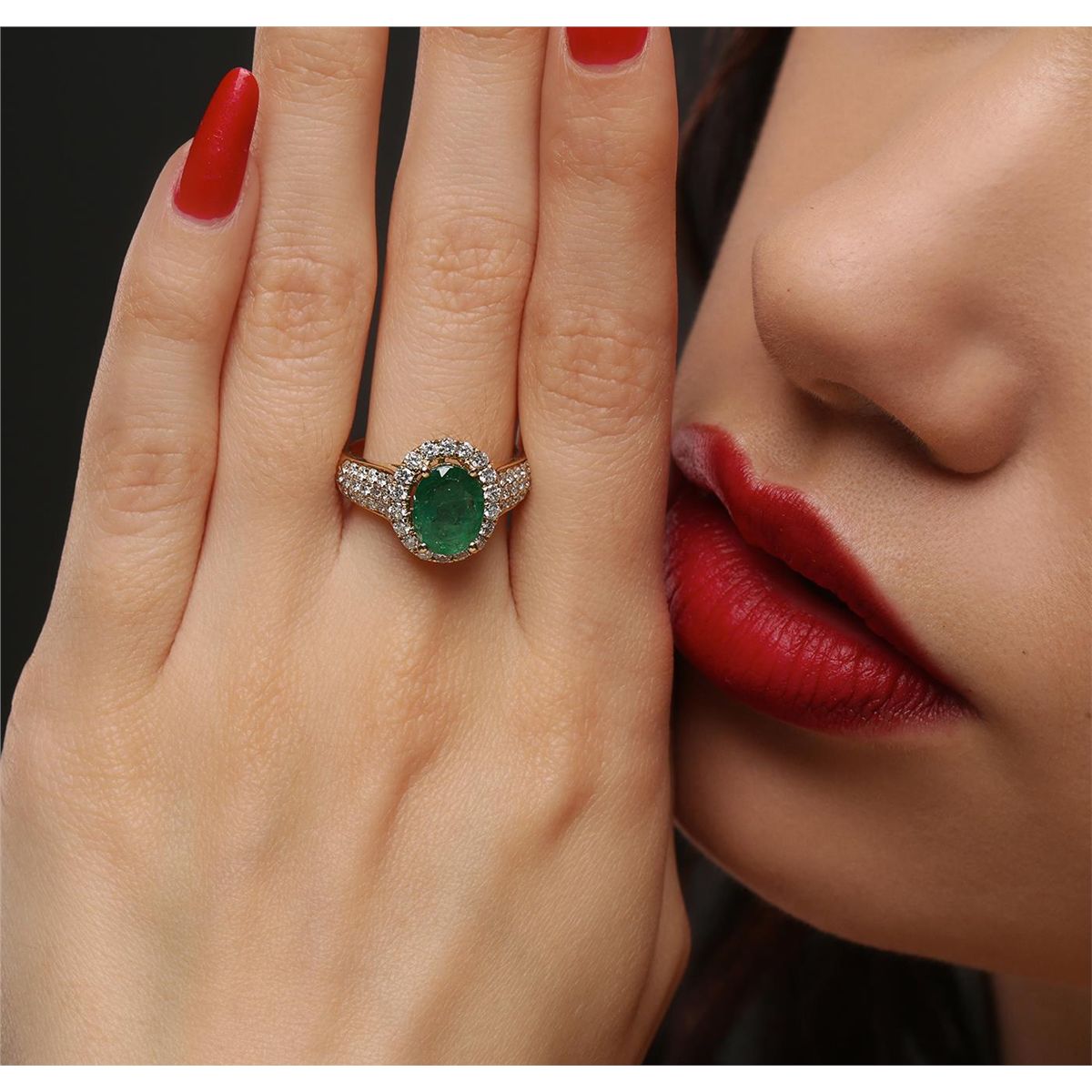 One electronically tested 14KT yellow gold Ladies combination cast & assembled ring with a bright polish finish. Condition is new. Identified with markings of "14K". Containing: One prong set oval modified brilliant cut natural emerald, measuring 9.50 x 7.50 x 5.20mm, approximate weight of 2.04ct., clarity is heavily included, type III, medium, moderately strong, green color, (GIA G 5/4), cut is good. Colored gemstones are presumed to have been subjected to commonly used color/clarity enhancement processes. Fifty-Four bead set round brilliant cut diamonds, measuring 1.70 - 1.60 x 0.99mm (depth est.) approximate. Total Weight of 54 Stones = 0.89ct. Clarity: SI-2 to I-1. Color: I - J, Cut is Good. Four prong set baguette cut diamonds, measuring 3.00 x 1.50 x 1.28mm (depth est.) approximate. Total Weight of 4 Stones = 0.21ct. Clarity: SI-2 to I-1. Color: H - I, Cut is Good. Total Weight of Colored Stones 2.04ct. Total Weight of Diamonds 1.10ct. Total Weight of Ring 5.50 grams. GGL Appraised at $8,120.00.
