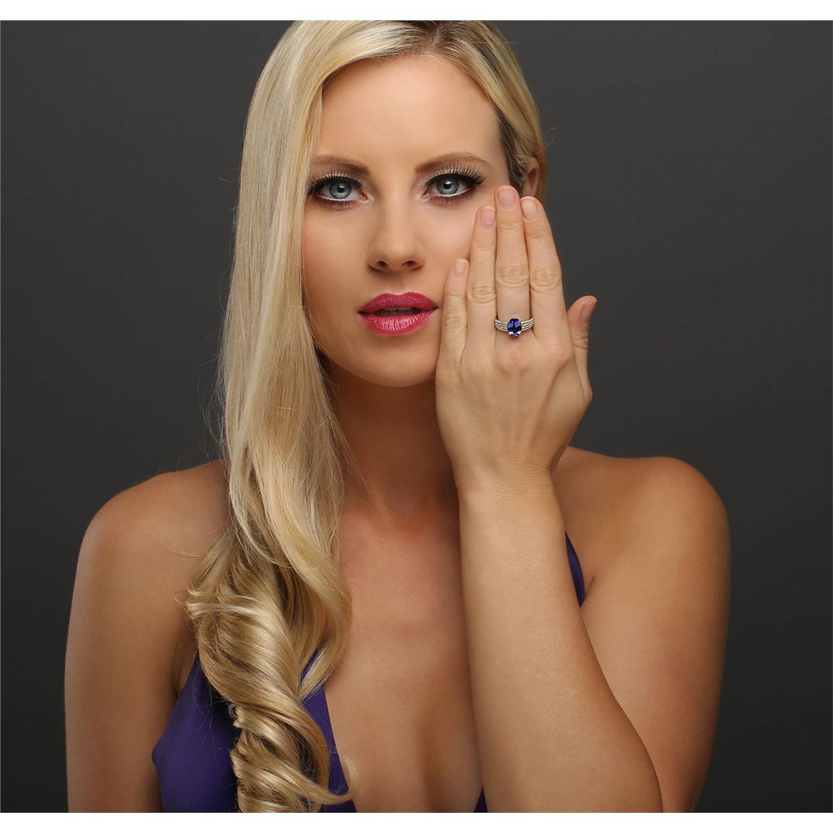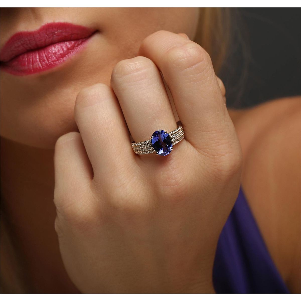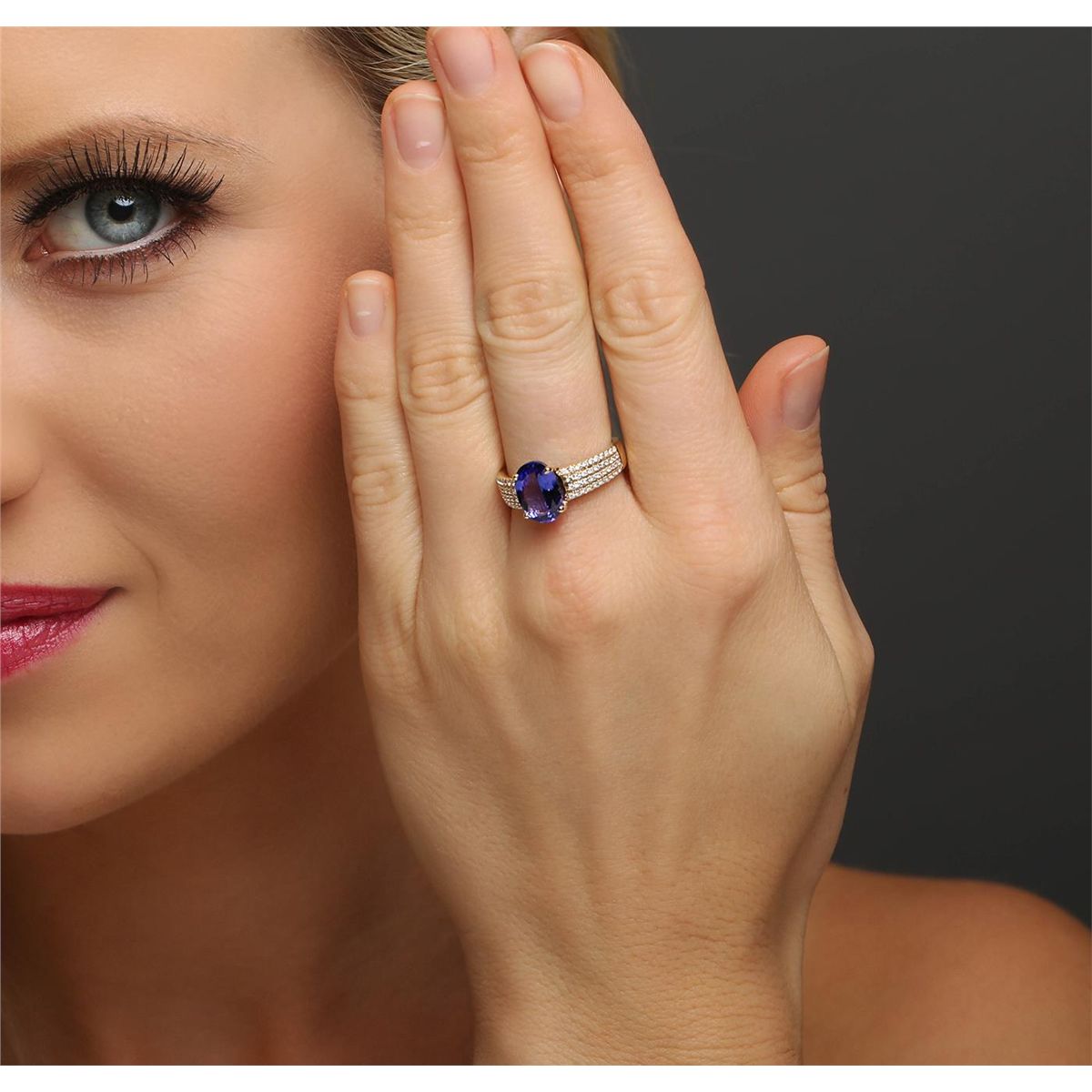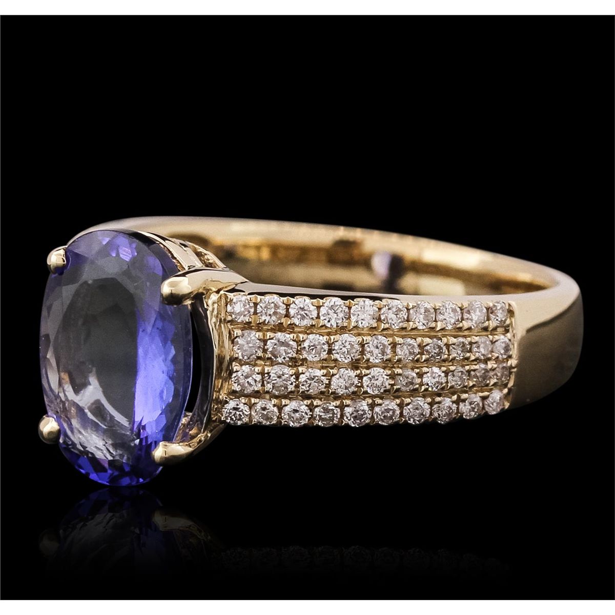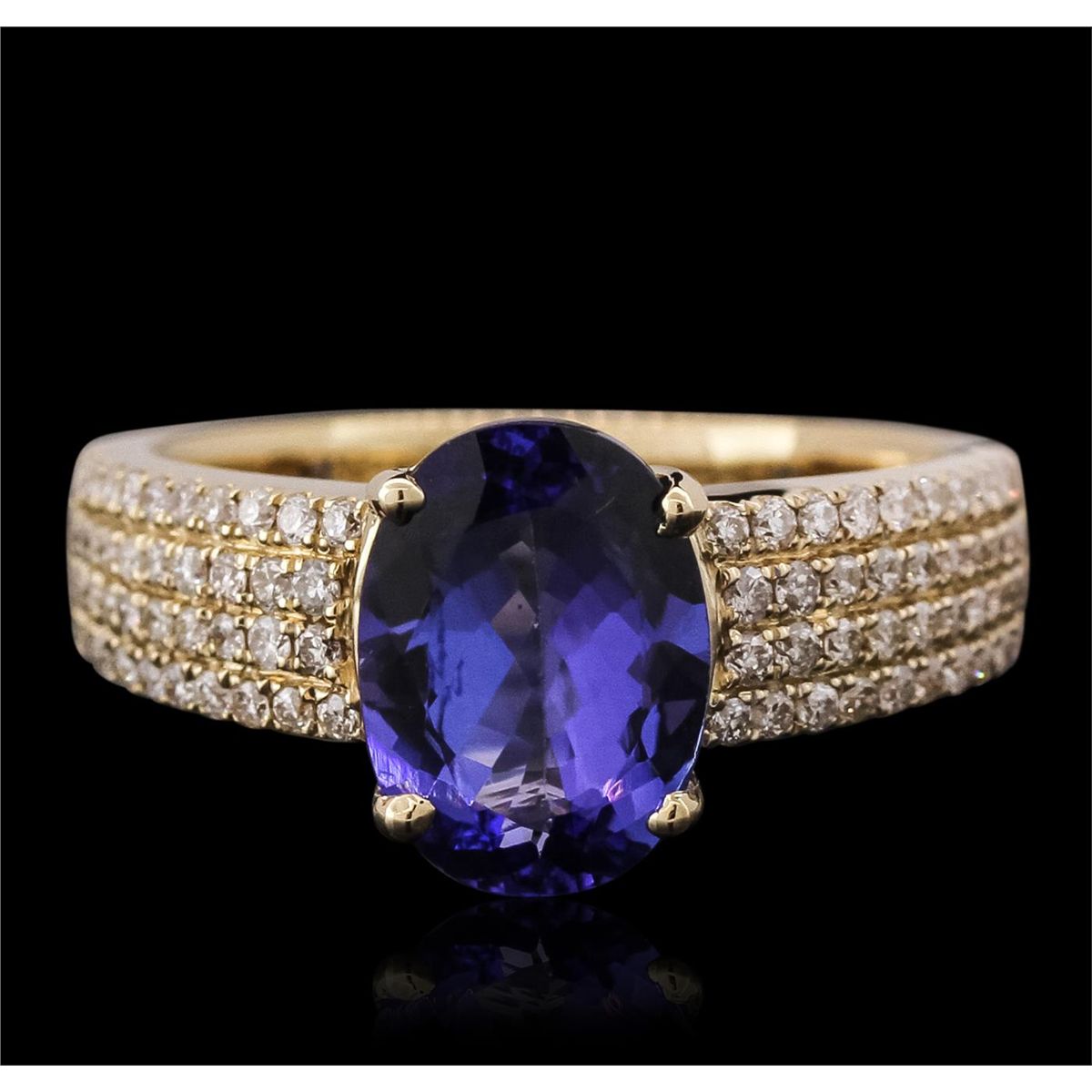 One electronically tested 14KT yellow gold ladies combination cast & assembled tanzanite and diamond ring with a flat shank with a bright polish finish. Identified with markings of "14K". Condition is new. Containing: One prong set oval modified brilliant cut natural tanzanite, measuring 10.30 x 7.50 x 3.89mm, approximate weight of 2.06ct., clarity is eye clean, type I, medium, moderately strong, violet color, (GIA V 5/4), cut is good. Seventy-Two prong set round brilliant cut diamonds, measuring 1.10 - 1.10 x 0.66mm (depth est.) approximate total weight of 72 Stones = 0.35ct. Clarity: I-1 to I-2. Color: I - J, Cut is Good. Colored gemstones are presumed to have been subjected to commonly used enhancement processes. All diamonds and colored gemstones are graded in the mounting, unless otherwise stated total weight of Colored Stones 2.06ct. Total Weight of Diamonds 0.35ct. Total Weight of Ring 5.20 grams. GGL Appraised at $5,650.00.