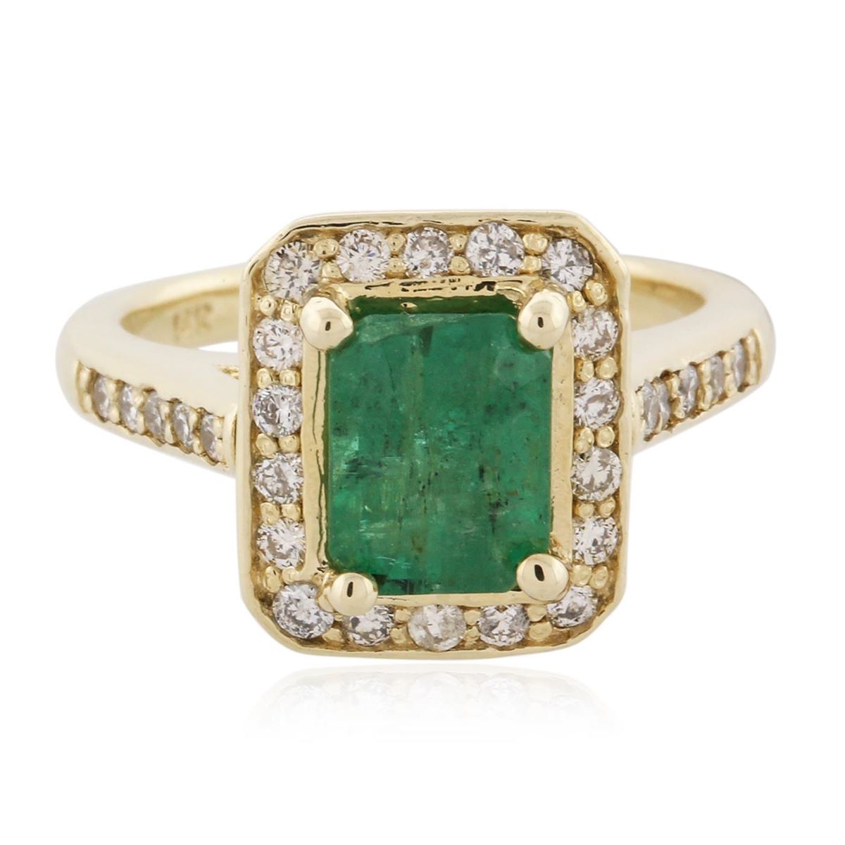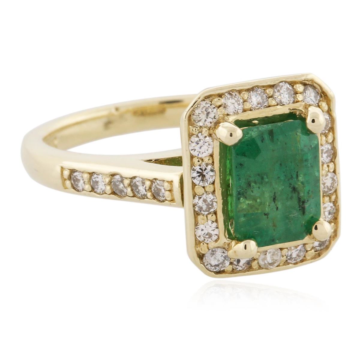 One electronically tested 14KT yellow gold ladies cast emerald and diamond ring with a bright polish finish. Condition is new, good workmanship. The featured emerald is set within a diamond bezel supported by a diamond set under gallery and diamond set shoulders, completed by a two millimeter wide band. Identified with markings of "14K". Containing: One prong set rectangular step cut natural emerald, measuring 7.80 x 6.15 x 5.00mm, 6% bulge factor, approximate weight of 2.07ct, clarity is heavily included, type III, medium dark, very slightly grayish, very slightly bluish green color, (GIA vslbG 6/3), cut is good. Transmitting light with a minimum of distortion, transparent. Naturally occurring internal & external characteristics are present. Indications of oil residue. Graded in the setting. Thirty-Eight bead and prong set round brilliant cut diamonds, measuring 1.70 - 1.50 x 0.96mm (depth est.) approximate total weight of 38 Stones = 0.67ct. Graded in the setting. Clarity SI-1 to I-1 Color H - J Total Weight of Colored Stones 2.07ct. Total Weight of Diamonds 0.67ct. Total Weight of Ring 6.31 grams. AIG Appraised at $5,495.00.