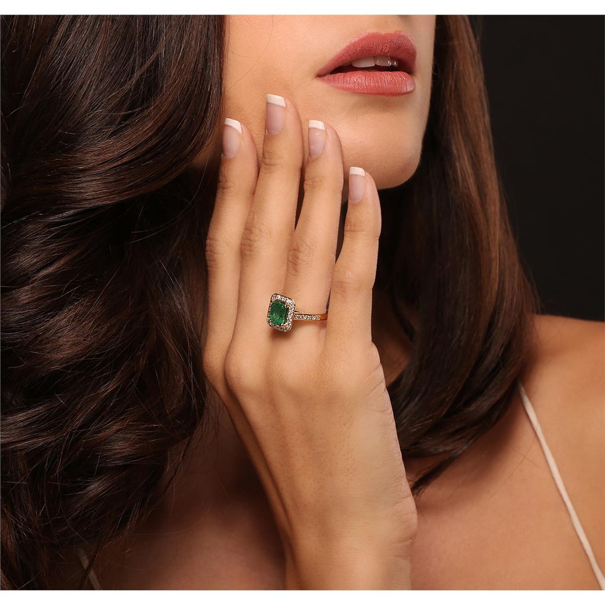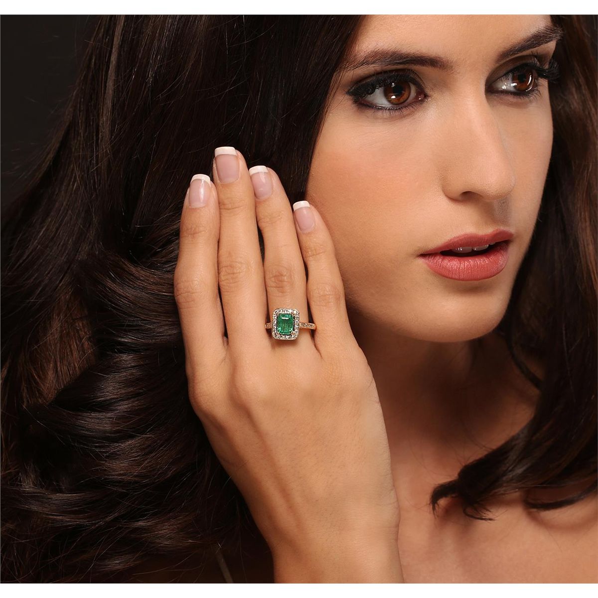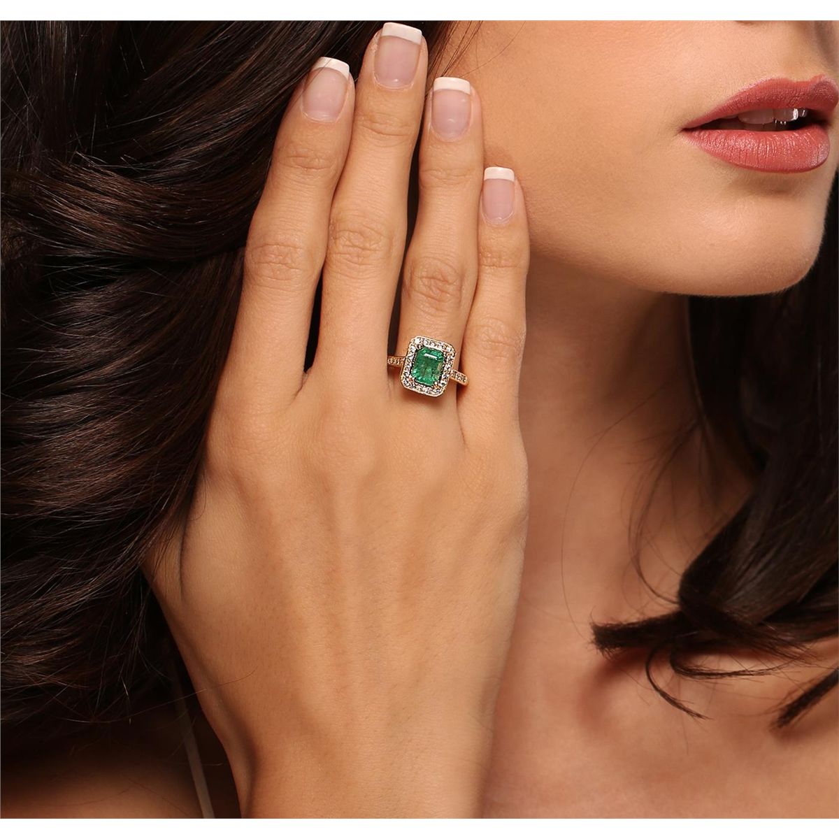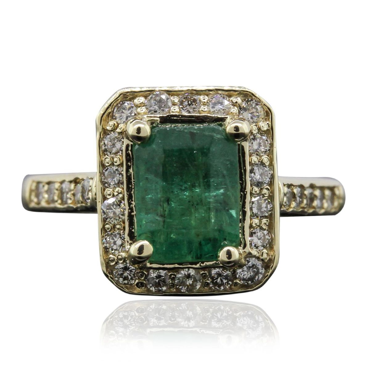 One electronically tested 14KT yellow gold ladies cast emerald and diamond ring with a bright polish finish. Condition is new, good workmanship. The featured emerald is set within a diamond bezel supported by a diamond set under gallery and diamond set shoulders, completed by a two millimeter wide band. Identified with markings of "14K". Containing: One prong set rectangular step cut natural emerald, measuring 7.80 x 6.15 x 5.00mm, 6% bulge factor, approximate weight of 2.07ct, clarity is heavily included, type III, medium dark, very slightly grayish, very slightly bluish green color, (GIA vslbG 6/3), cut is good. Transmitting light with a minimum of distortion, transparent. Naturally occurring internal & external characteristics are present. Indications of oil residue. Graded in the setting. Thirty-Eight bead and prong set round brilliant cut diamonds, measuring 1.70 - 1.50 x 0.96mm (depth est.) approximate total weight of 38 Stones = 0.67ct. Graded in the setting. Clarity SI-1 to I-1 Color H - J Total Weight of Colored Stones 2.07ct. Total Weight of Diamonds 0.67ct. Total Weight of Ring 6.31 grams. AIG Appraised at $5,495.00.