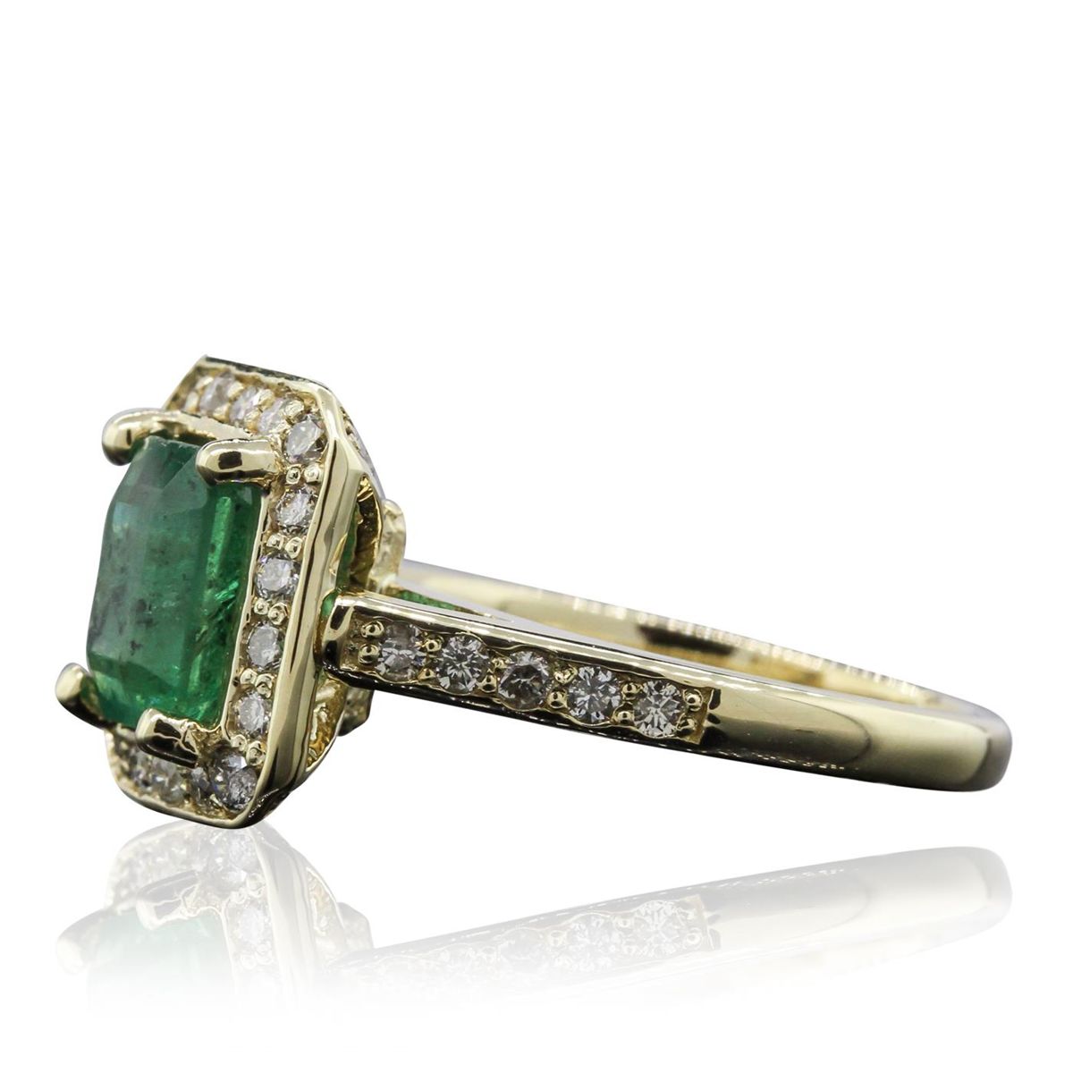 One electronically tested 14KT yellow gold ladies cast emerald and diamond ring with a bright polish finish. Condition is new, good workmanship. The featured emerald is set within a diamond bezel supported by a diamond set under gallery and diamond set shoulders, completed by a two millimeter wide band. Identified with markings of "14K". Containing: One prong set rectangular step cut natural emerald, measuring 7.80 x 6.15 x 5.00mm, 6% bulge factor, approximate weight of 2.07ct, clarity is heavily included, type III, medium dark, very slightly grayish, very slightly bluish green color, (GIA vslbG 6/3), cut is good. Transmitting light with a minimum of distortion, transparent. Naturally occurring internal & external characteristics are present. Indications of oil residue. Graded in the setting. Thirty-Eight bead and prong set round brilliant cut diamonds, measuring 1.70 - 1.50 x 0.96mm (depth est.) approximate total weight of 38 Stones = 0.67ct. Graded in the setting. Clarity SI-1 to I-1 Color H - J Total Weight of Colored Stones 2.07ct. Total Weight of Diamonds 0.67ct. Total Weight of Ring 6.31 grams. AIG Appraised at $5,495.00.