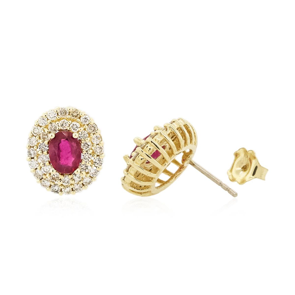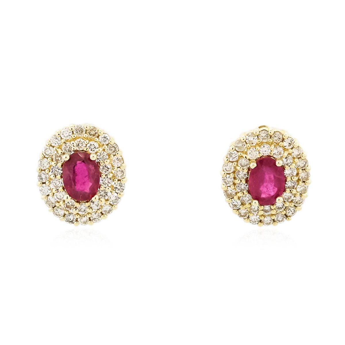 One pair electronically tested 14KT yellow gold Ladies combination cast & assembled stud earrings with friction posts with a bright polish finish. Condition is new. Identified with markings of "14K". Containing: Two prong set oval modified brilliant cut natural rubies, measuring 6.89 x 5.02 x 2.65mm, approximate. Total Weight of 2.07ct., clarity is heavily included, medium, moderately strong, strongly purplish red color, (GIA stpR 5/4), cut is good. Colored gemstones are presumed to have been subjected to commonly used color/clarity enhancement processes. Seventy-Two prong set round brilliant cut diamonds, measuring 1.50 - 1.50 x 0.90mm (depth est.) approximate. Total Weight of 72 Stones = 1.41ct. Clarity: I-1 to I-2. Color: J - K, Cut is Good. Total Weight of Colored Stones 2.07ct. Total Weight of Diamonds 1.41ct. Total Weight of Earrings 5.00 grams. GGL Appraised at $4,675.00.