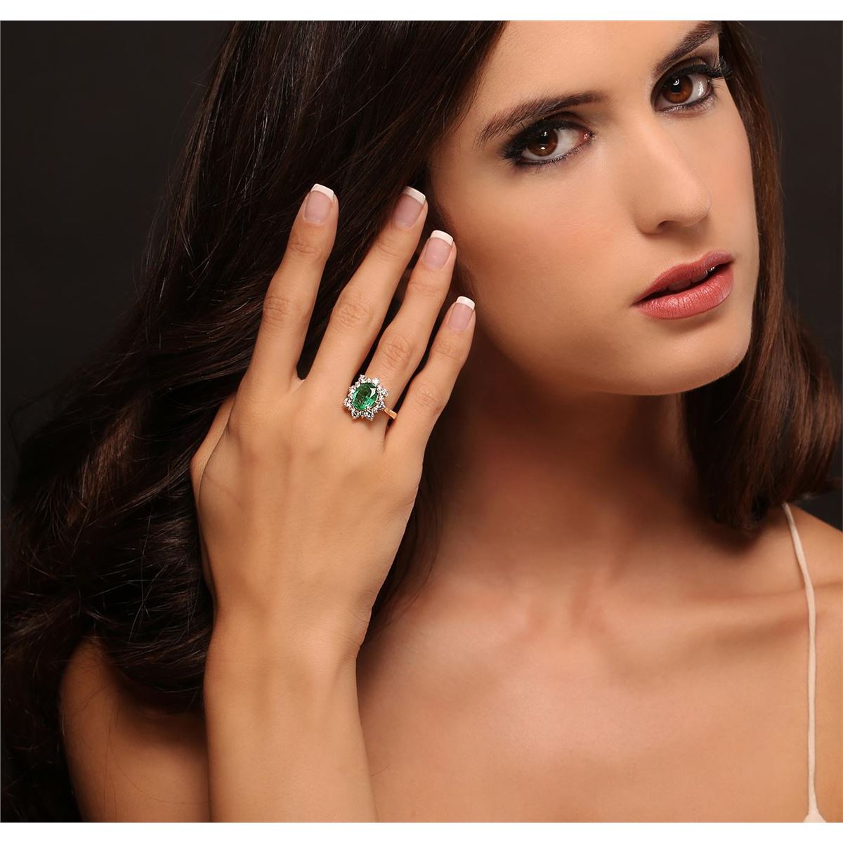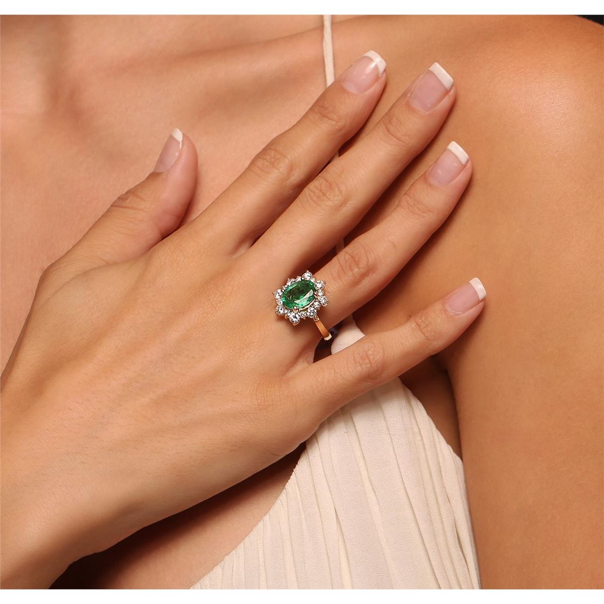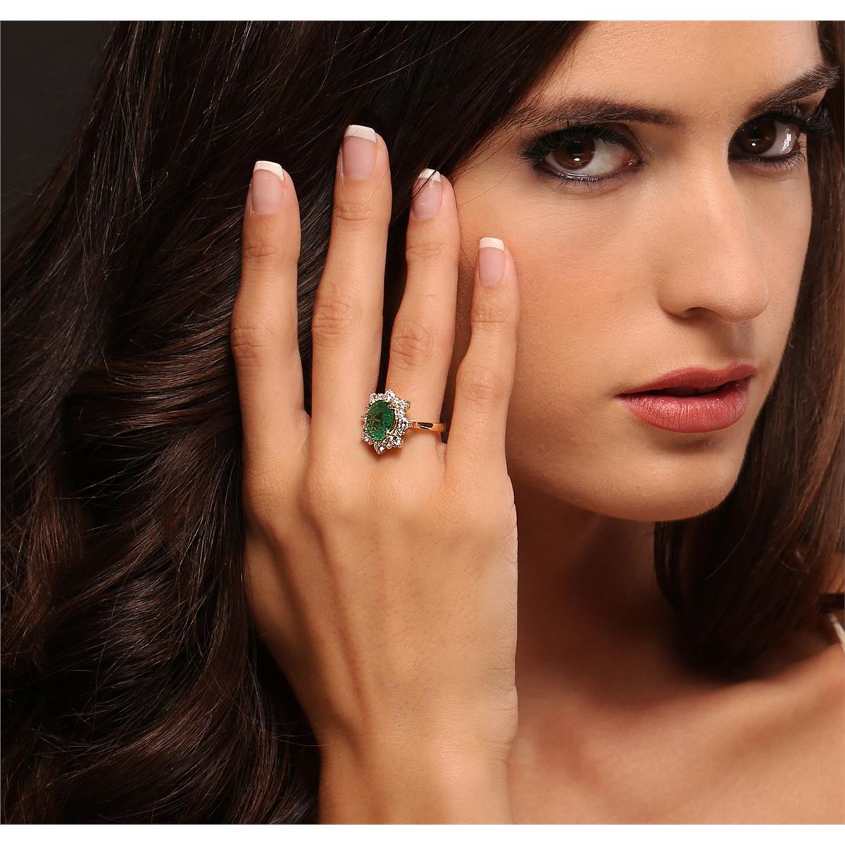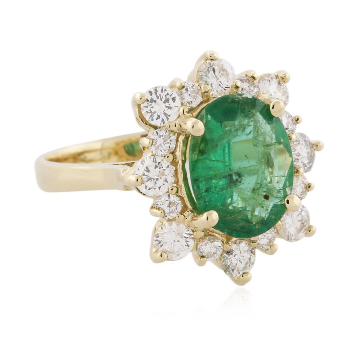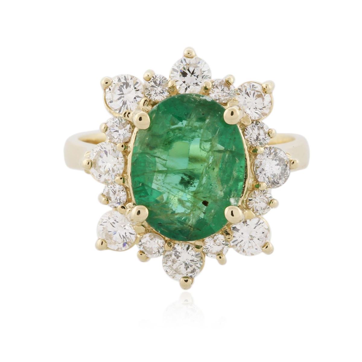 One electronically tested 14KT yellow gold ladies cast emerald and diamond ring with a bright polish finish. Condition is new, good workmanship. The featured emerald is set within a diamond floret, completed by a two and one-half millimeter wide band. Identified with markings of "K14". Containing: One prong set oval mixed cut natural emerald, measuring 10.80 x 8.45 x 3.90mm, 6% bulge factor, approximate weight of 2.08ct, clarity is heavily included, type III, medium dark, moderately strong, very slightly bluish green color, (GIA vslbG 6/4), cut is good. Transmitting light with a minimum of distortion, transparent. Naturally occurring internal & external characteristics are present. Indications of oil residue. Graded in the setting. Eight prong set round brilliant cut diamonds, measuring 3.20 - 3.10 x 1.89mm (depth est.) approximate total weight of 8 Stones = 1.01ct. Graded in the setting. Clarity SI-1 to I-1 Color G - I Eight prong set round brilliant cut diamonds, measuring 2.20 - 2.10 x 1.29mm (depth est.) approximate total weight of 8 Stones = 0.39ct. Graded in the setting. Clarity SI-1 to I-1 Color G - I Total Weight of Colored Stones 2.08ct. Total Weight of Diamonds 1.40ct. Total Weight of Ring 5.23 grams. AIG Appraised at $7,275.00.