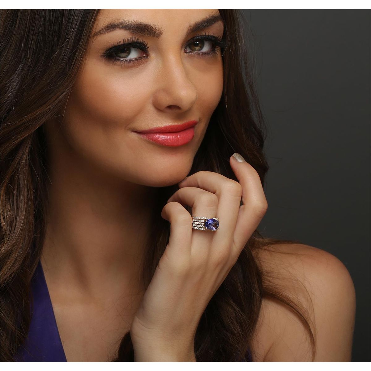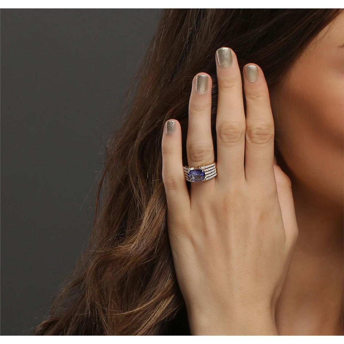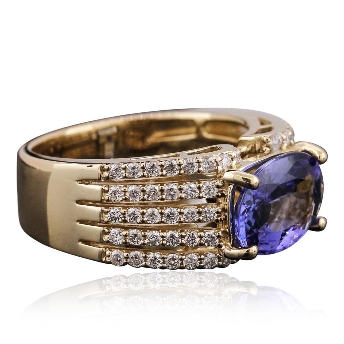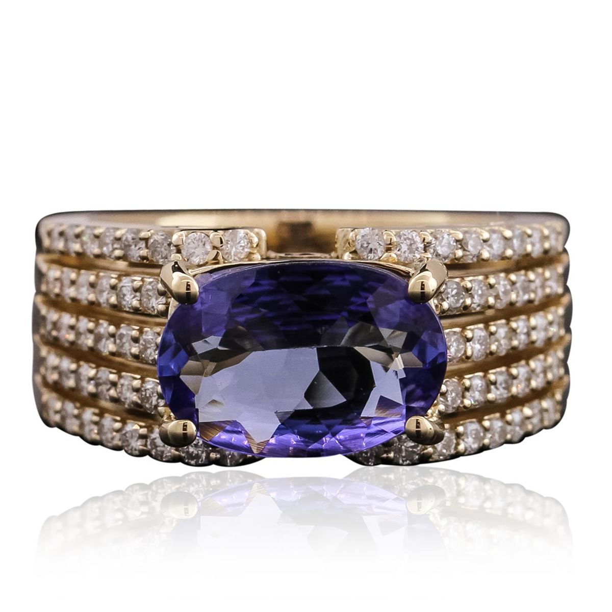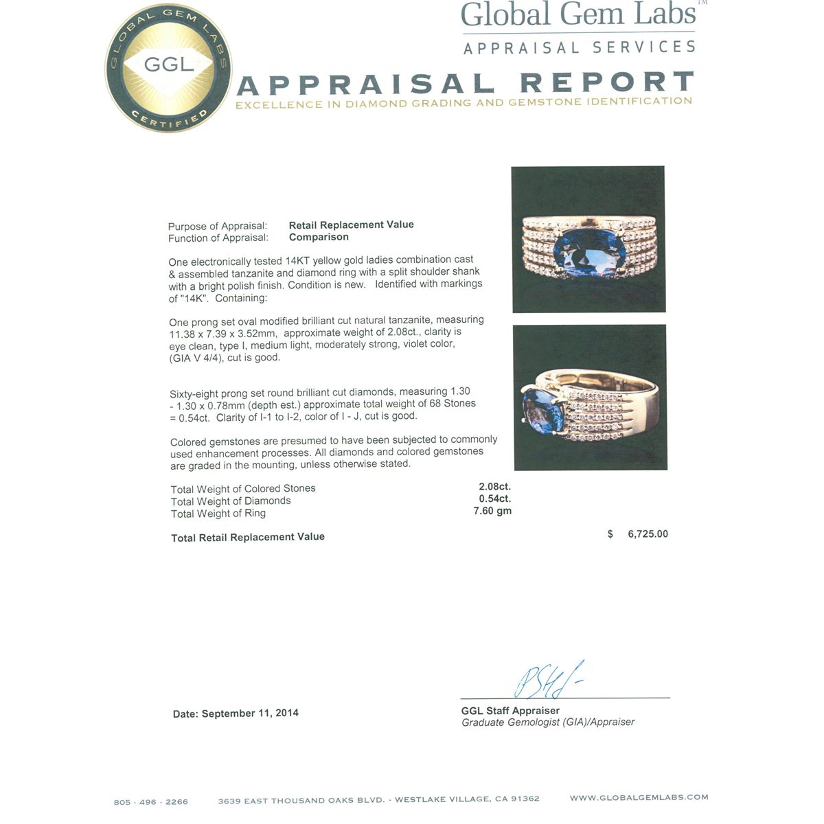 One electronically tested 14KT yellow gold ladies combination cast & assembled tanzanite and diamond ring with a split shoulder shank with a bright polish finish. Identified with markings of "14K". Condition is new. Containing: One prong set oval modified brilliant cut natural tanzanite, measuring 11.38 x 7.39 x 3.52mm, approximate weight of 2.08ct., clarity is eye clean, type I, medium light, moderately strong, violet color, (GIA V 4/4), cut is good. Sixty-Eight prong set round brilliant cut diamonds, measuring 1.30 - 1.30 x 0.78mm (depth est.) approximate total weight of 68 Stones = 0.54ct. Clarity: I-1 to I-2. Color: I - J, Cut is Good. Colored gemstones are presumed to have been subjected to commonly used enhancement processes. All diamonds and colored gemstones are graded in the mounting, unless otherwise stated. Total Weight of Colored Stones 2.08ct. Total Weight of Diamonds 0.54ct. Total Weight of Ring 7.60 grams. GGL Appraised at $6,725.00.