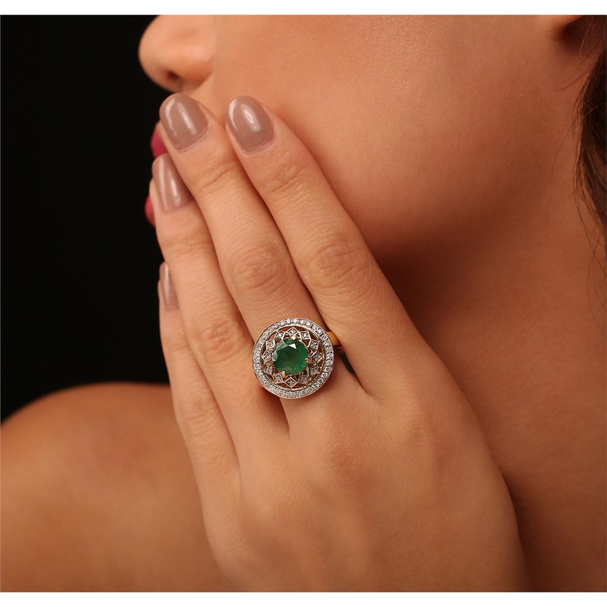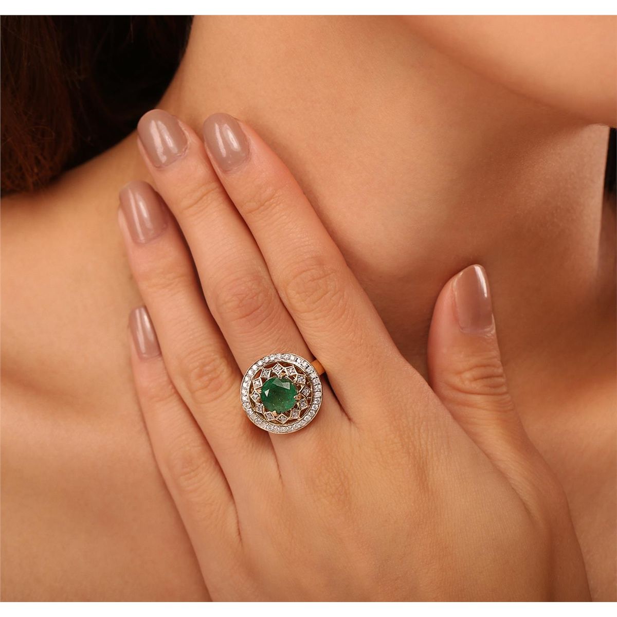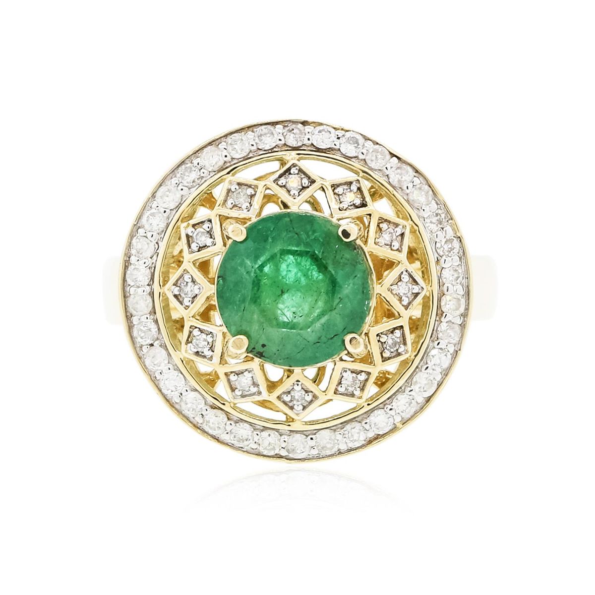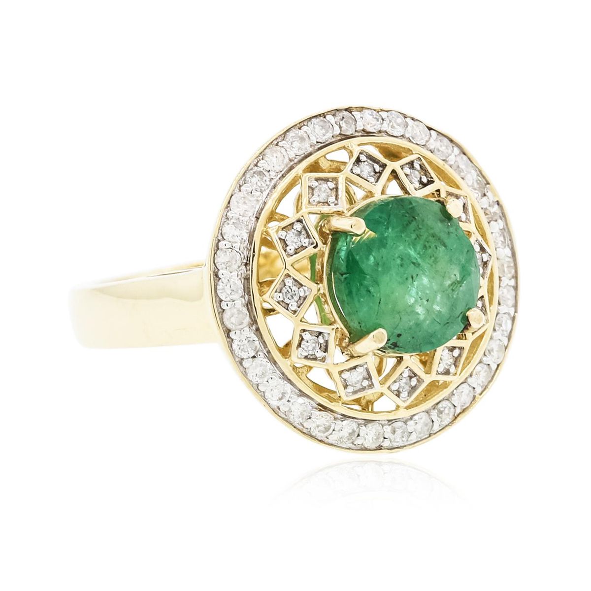 One electronically tested 14KT yellow gold Ladies cast ring with a bright polish finish. Condition is new. Identified with markings of "14K". Containing: One prong set round modified brilliant cut natural emerald, measuring 8.28 - 8.28 x 5.60 mm, approximate weight of 2.09ct., clarity is heavily included, type III, medium, moderately strong, green color, (GIA G 5/4), cut is good. Colored gemstones are presumed to have been subjected to commonly used color/clarity enhancement processes. Forty-Six prong set round brilliant cut diamonds, measuring 1.30 - 1.30 x 0.78mm (depth est.) approximate. Total Weight of 46 Stones = 0.37ct. Clarity: I-1 to I-2. Color: I - J, Cut is Good. Total Weight of Colored Stones 2.09ct. Total Weight of Diamonds 0.37ct. Total Weight of Ring 5.80 Grams. GGL Appraised at $6,850.00.