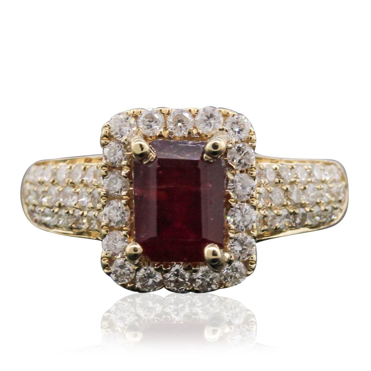 One electronically tested 14KT yellow gold Ladies combination cast & assembled ring with a bright polish finish. Condition is new. Identified with markings of "14K". Containing: Eighteen prong set round brilliant cut diamonds, measuring 1.50 - 1.50 x 0.90mm (depth est.) approximate. Total Weight of 18 Stones = 0.43ct. Clarity: I-1 to I-2. Color: I - J, Cut is Good. Forty-Two prong set round brilliant cut diamonds, measuring 1.30 - 1.30 x 0.78mm (depth est.) approximate. Total Weight of 42 Stones = 0.60ct. Clarity: I-1 to I-2. Color: H - I, Cut is Good. One prong set emerald standard step cut natural ruby, measuring 7.50 x 5.60 x 4.20mm, exact weight 2.09ct., clarity is heavily included, type II, dark, moderately strong, strongly purplish red color, (GIA stpR 7/4), cut is good. Colored gemstones are presumed to have been subjected to commonly used and possible undetectable color/clarity enhancement processes. Total Weight of Colored Stones 2.09ct. Total Weight of Diamonds 1.03ct. Total Weight of Ring 5.30 grams. GGL Appraised at $4,230.00.