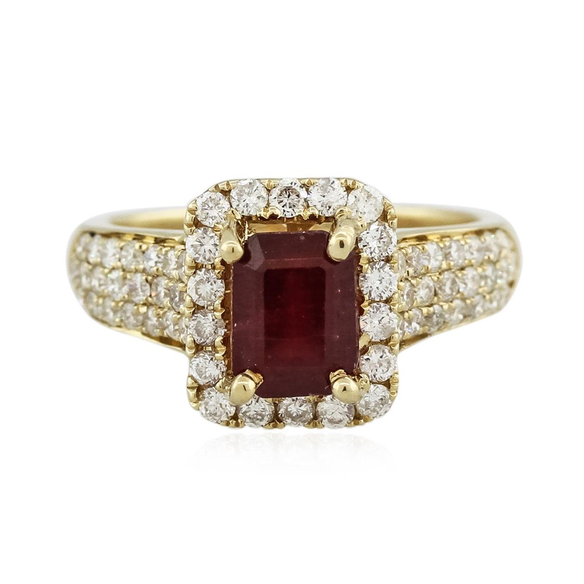 One electronically tested 14KT yellow gold Ladies combination cast & assembled ring with a bright polish finish. Condition is new. Identified with markings of "14K". Containing: Eighteen prong set round brilliant cut diamonds, measuring 1.50 - 1.50 x 0.90mm (depth est.) approximate. Total Weight of 18 Stones = 0.43ct. Clarity: I-1 to I-2. Color: I - J, Cut is Good. Forty-Two prong set round brilliant cut diamonds, measuring 1.30 - 1.30 x 0.78mm (depth est.) approximate. Total Weight of 42 Stones = 0.60ct. Clarity: I-1 to I-2. Color: H - I, Cut is Good. One prong set emerald standard step cut natural ruby, measuring 7.50 x 5.60 x 4.20mm, exact weight 2.09ct., clarity is heavily included, type II, dark, moderately strong, strongly purplish red color, (GIA stpR 7/4), cut is good. Colored gemstones are presumed to have been subjected to commonly used and possible undetectable color/clarity enhancement processes. Total Weight of Colored Stones 2.09ct. Total Weight of Diamonds 1.03ct. Total Weight of Ring 5.30 grams. GGL Appraised at $4,230.00.
