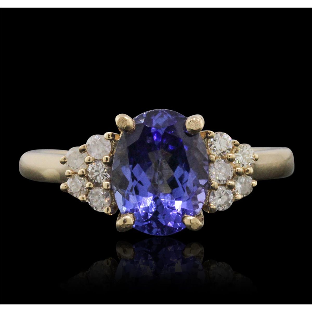 One electronically tested 14KT yellow gold ladies cast tanzanite and diamond ring with a bright polish finish. The featured tanzanite is supported by diamond set shoulders, completed by a one and one-half millimeter wide band. Trademark is Orianne. Identified with markings of "14K". Condition is new, good workmanship. Containing: One prong set oval brilliant cut natural tanzanite, measuring 9.20 x 7.00 x 4.50mm, 6% bulge factor, approximate weight of 2.10ct., clarity is eye clean, type I, medium dark, very slightly grayish, violetish blue color, (GIA vB 6/3), cut is good. Transmitting light with no distortion, transparent. Graded in the setting. Tanzanite is a very rare gemstone that is only found in the country of Tanzania. Originally discovered in 1967. Tiffany & Company, named the stone Tanzanite. It is found in the Usumburu Mountains that border the Umba Valley of northern Tanzania. Tanzanite occurs in gray, brown, violet, blue, reddish-purple, & green. The gem is interesting because of its exceptional pleochroism. Rotated in different directions a tanzanite will exhibit multiple changes of color. Tanzanite has a low tolerance to ultrasonic cleaning, and should not be cleaned using this method. Ten prong set round brilliant cut diamonds, measuring 1.90 - 1.80 x 1.11mm (depth est.) approximate total weight of 10 Stones = 0.33ct. Graded in the setting. Clarity: SI-1 to I-1. Color: H - J. Total Weight of Colored Stones 2.10ct. Total Weight of Diamonds 0.33ct. Total Weight of Ring 4.52 grams. AIG Appraised at $6,445.00.