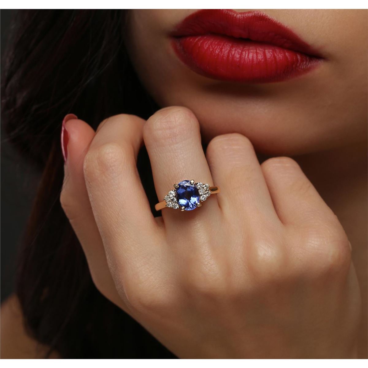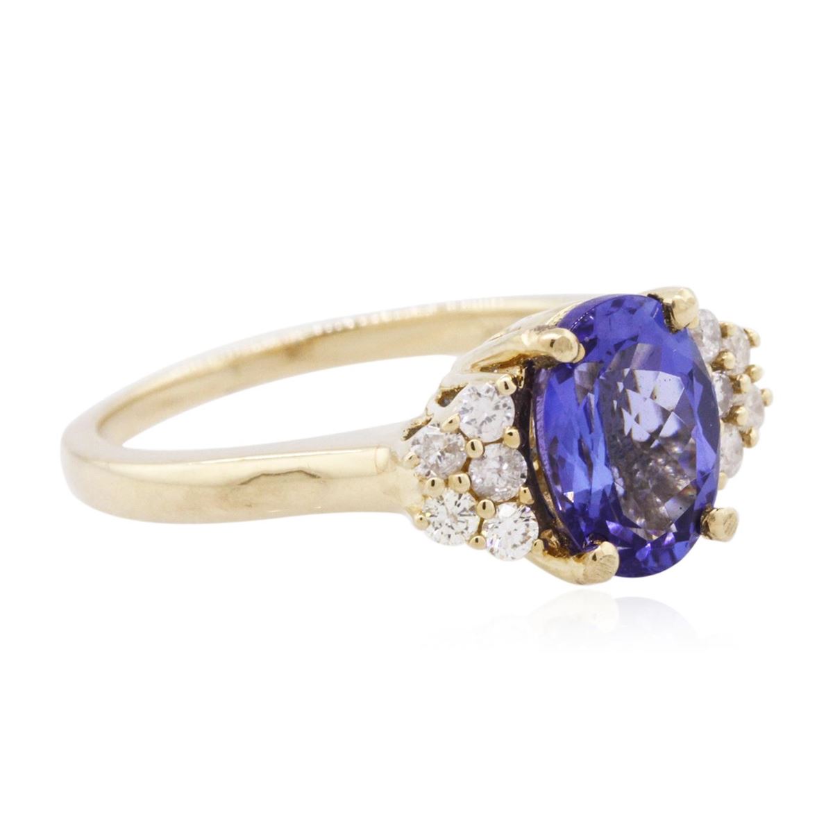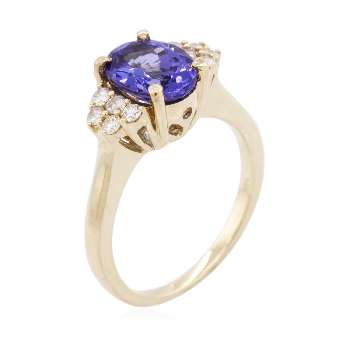 One electronically tested 14KT yellow gold ladies cast tanzanite and diamond ring with a bright polish finish. The featured tanzanite is supported by diamond set shoulders, completed by a one and one-half millimeter wide band. Trademark is Orianne. Identified with markings of "14K". Condition is new, good workmanship. Containing: One prong set oval brilliant cut natural tanzanite, measuring 9.20 x 7.00 x 4.50mm, 6% bulge factor, approximate weight of 2.10ct., clarity is eye clean, type I, medium dark, very slightly grayish, violetish blue color, (GIA vB 6/3), cut is good. Transmitting light with no distortion, transparent. Graded in the setting. Tanzanite is a very rare gemstone that is only found in the country of Tanzania. Originally discovered in 1967. Tiffany & Company, named the stone Tanzanite. It is found in the Usumburu Mountains that border the Umba Valley of northern Tanzania. Tanzanite occurs in gray, brown, violet, blue, reddish-purple, & green. The gem is interesting because of its exceptional pleochroism. Rotated in different directions a tanzanite will exhibit multiple changes of color. Tanzanite has a low tolerance to ultrasonic cleaning, and should not be cleaned using this method. Ten prong set round brilliant cut diamonds, measuring 1.90 - 1.80 x 1.11mm (depth est.) approximate total weight of 10 Stones = 0.33ct. Graded in the setting. Clarity: SI-1 to I-1. Color: H - J. Total Weight of Colored Stones 2.10ct. Total Weight of Diamonds 0.33ct. Total Weight of Ring 4.52 grams. AIG Appraised at $6,445.00.