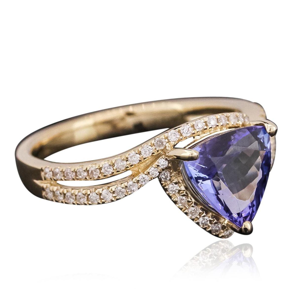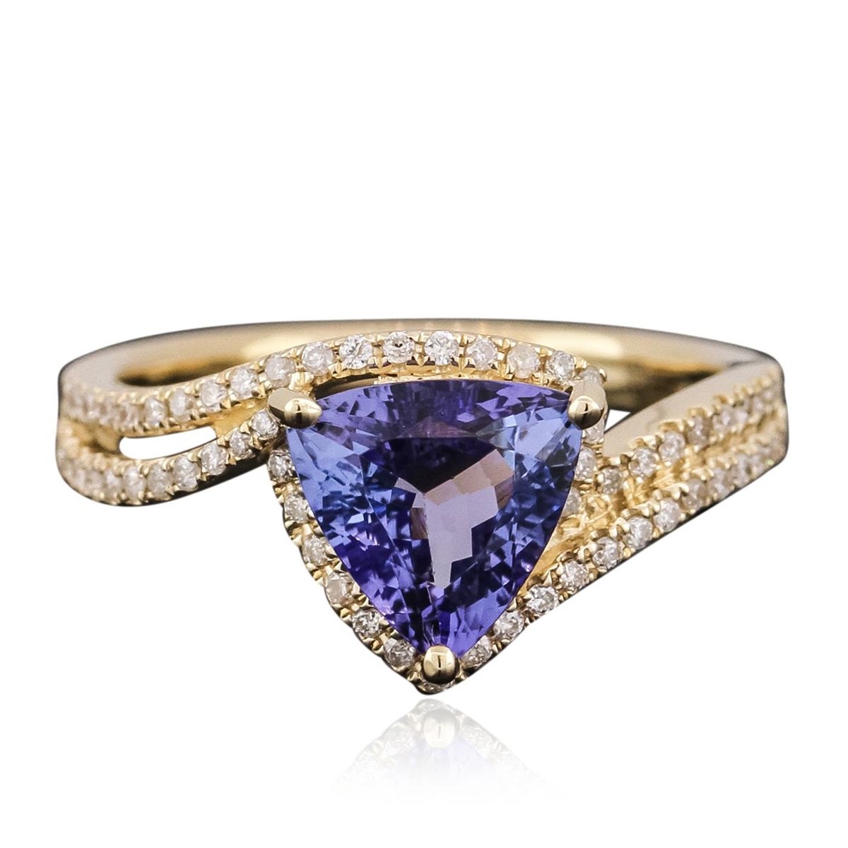 One electronically tested 14KT yellow gold ladies combination cast & assembled ring with a bright polish finish. Identified with markings of "14K". Condition is new. Containing: One prong set triangle modified brilliant cut natural tanzanite, measuring 9.00 x 9.00 x 4.33mm, approximate weight of 2.11ct., clarity is eye clean, type I, medium light, very slightly grayish, violet color, (GIA V 4/3), cut is good. Ninety-Five prong set round brilliant cut diamonds, measuring 1.20 - 1.20 x 0.72mm (depth est.) approximate total weight of 95 Stones = 0.60ct. Clarity: I-1 to I-2. Color: J - K, Cut is Good. Colored gemstones are presumed to have been subjected to commonly used enhancement processes. All diamonds and colored gemstones are graded in the mounting, unless otherwise stated. Total Weight of Colored Stones 2.11ct. Total Weight of Diamonds 0.60ct. Total Weight of Ring 3.80 grams. GGL Appraised at $4,990.00.