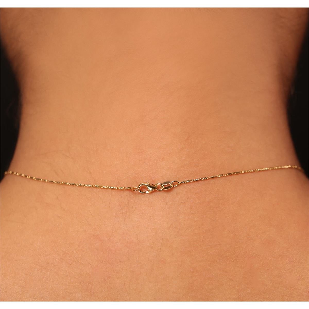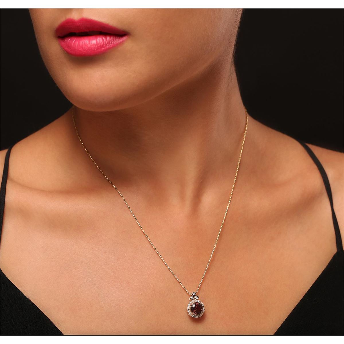 One electronically tested 14KT yellow gold ladies cast & assembled tourmaline and diamond pendant with chain. Condition is new, good workmanship. The featured tourmaline is set within a diamond bezel, completed by a diamond set bail. The pendant is supported by an eighteen inch length 14KT yellow gold designer style chain, terminating in a lobster claw clasp. Bright polish finish. Trademark is ORIANNE. Identified with markings of "14K". Containing: One prong set round mixed cut natural rubellite, measuring 7.50 - 7.40 x 5.20 mm, 15%. bulge factor, approximate weight of 2.12ct., clarity is slightly included, type III, medium dark, moderately strong, strongly purplish red color, (GIA stpR 6/4), cut is good. Transmitting light with a minimum of distortion, transparent. Naturally occurring internal & external characteristics are present. Graded in the setting. Twenty-Three bezel and prong set round brilliant cut diamonds, measuring 1.40 - 1.30 x 0.81mm (depth est.) approximate. Total Weight of 23 Stones = 0.24ct. Graded in the setting. Clarity: SI-2 to I-2. Color: G - I. Total Weight of Colored Stones 2.12ct. Total Weight of Diamonds 0.24ct. Total Weight of Pendant With Chain 4.41 grams. AIG Appraised at $3,025.00.