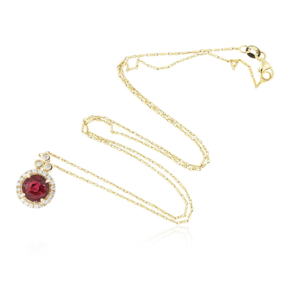 One electronically tested 14KT yellow gold ladies cast & assembled tourmaline and diamond pendant with chain. Condition is new, good workmanship. The featured tourmaline is set within a diamond bezel, completed by a diamond set bail. The pendant is supported by an eighteen inch length 14KT yellow gold designer style chain, terminating in a lobster claw clasp. Bright polish finish. Trademark is ORIANNE. Identified with markings of "14K". Containing: One prong set round mixed cut natural rubellite, measuring 7.50 - 7.40 x 5.20 mm, 15%. bulge factor, approximate weight of 2.12ct., clarity is slightly included, type III, medium dark, moderately strong, strongly purplish red color, (GIA stpR 6/4), cut is good. Transmitting light with a minimum of distortion, transparent. Naturally occurring internal & external characteristics are present. Graded in the setting. Twenty-Three bezel and prong set round brilliant cut diamonds, measuring 1.40 - 1.30 x 0.81mm (depth est.) approximate. Total Weight of 23 Stones = 0.24ct. Graded in the setting. Clarity: SI-2 to I-2. Color: G - I. Total Weight of Colored Stones 2.12ct. Total Weight of Diamonds 0.24ct. Total Weight of Pendant With Chain 4.41 grams. AIG Appraised at $3,025.00.