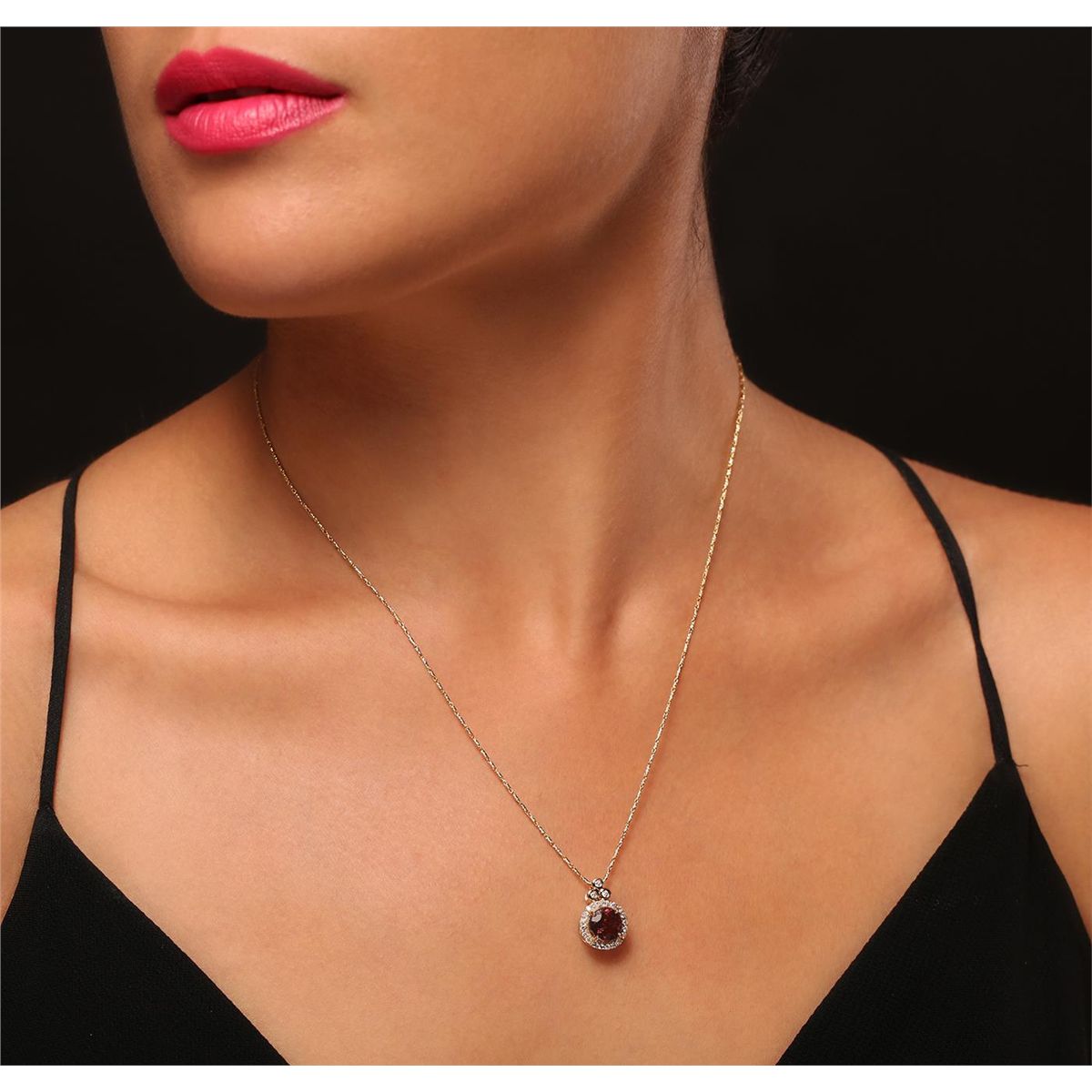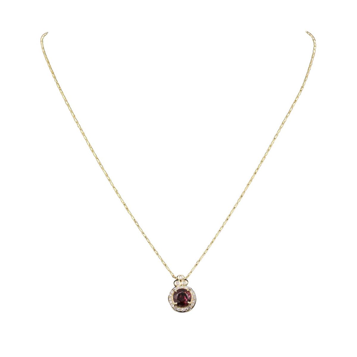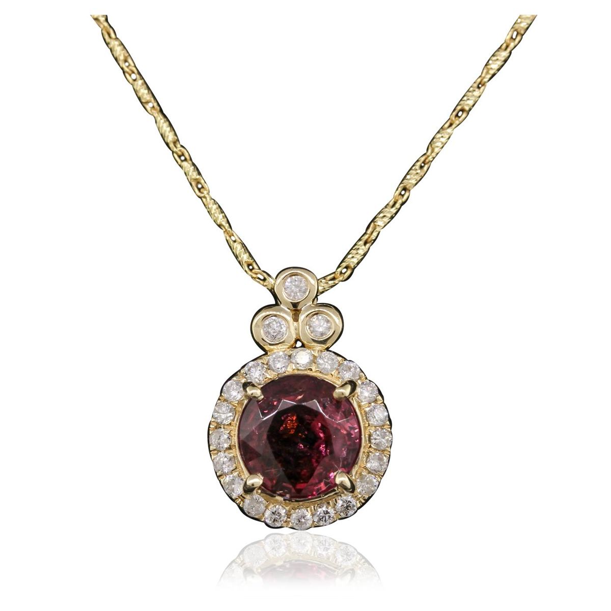 One electronically tested 14KT yellow gold ladies cast & assembled tourmaline and diamond pendant with chain. Condition is new, good workmanship. The featured tourmaline is set within a diamond bezel, completed by a diamond set bail. The pendant is supported by an eighteen inch length 14KT yellow gold designer style chain, terminating in a lobster claw clasp. Bright polish finish. Trademark is ORIANNE. Identified with markings of "14K". Containing: One prong set round mixed cut natural rubellite, measuring 7.50 - 7.40 x 5.20 mm, 15%. bulge factor, approximate weight of 2.12ct., clarity is slightly included, type III, medium dark, moderately strong, strongly purplish red color, (GIA stpR 6/4), cut is good. Transmitting light with a minimum of distortion, transparent. Naturally occurring internal & external characteristics are present. Graded in the setting. Twenty-Three bezel and prong set round brilliant cut diamonds, measuring 1.40 - 1.30 x 0.81mm (depth est.) approximate. Total Weight of 23 Stones = 0.24ct. Graded in the setting. Clarity: SI-2 to I-2. Color: G - I. Total Weight of Colored Stones 2.12ct. Total Weight of Diamonds 0.24ct. Total Weight of Pendant With Chain 4.41 grams. AIG Appraised at $3,025.00.