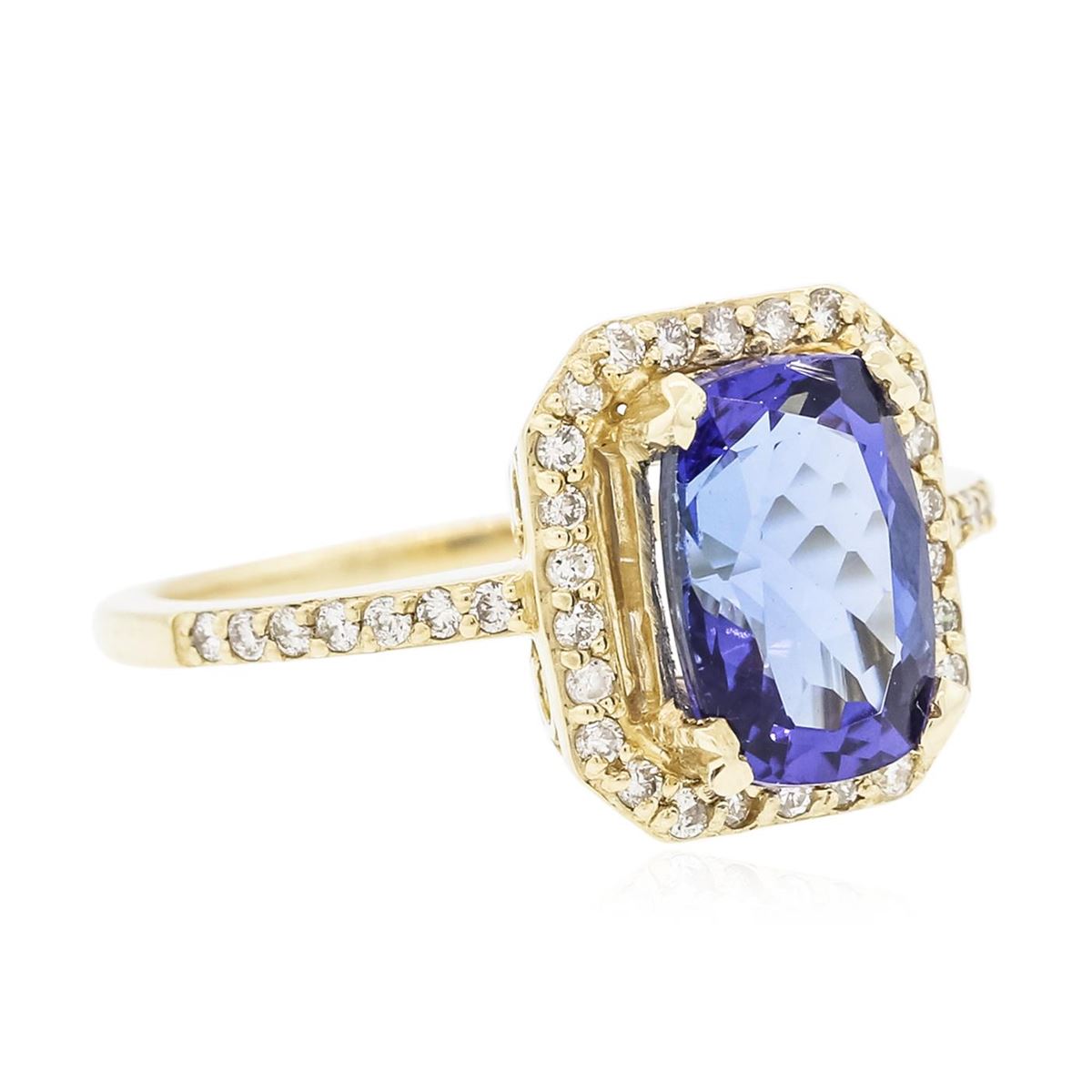One electronically tested 14KT yellow gold Ladies cast ring with a bright polish finish. Condition is new. Identified with markings of "14K". Containing: One prong set rectangular cushion modified brilliant cut natural tanzanite, measuring 9.66 x 6.59 x 4.28mm, approximate weight of 2.14ct., clarity is eye clean, type I, medium, moderately strong, bluish violet color, (GIA bV 5/4), cut is very good. Thirty-Nine prong set round brilliant cut diamonds, measuring 1.10 - 1.10 x 0.66mm (depth est.) approximate. Total Weight of 39 Stones = 0.19ct. Clarity: I-1 to I-2. Color: J - K, Cut is Good. Colored gemstones are presumed to have been subjected to commonly used enhancement processes. All diamonds and colored gemstones are graded in the mounting, unless otherwise stated. Total Weight of Colored Stones 2.14ct. Total Weight of Diamonds 0.19ct. Total Weight of Ring 3.60 grams. GGL Appraised at $4,710.00.