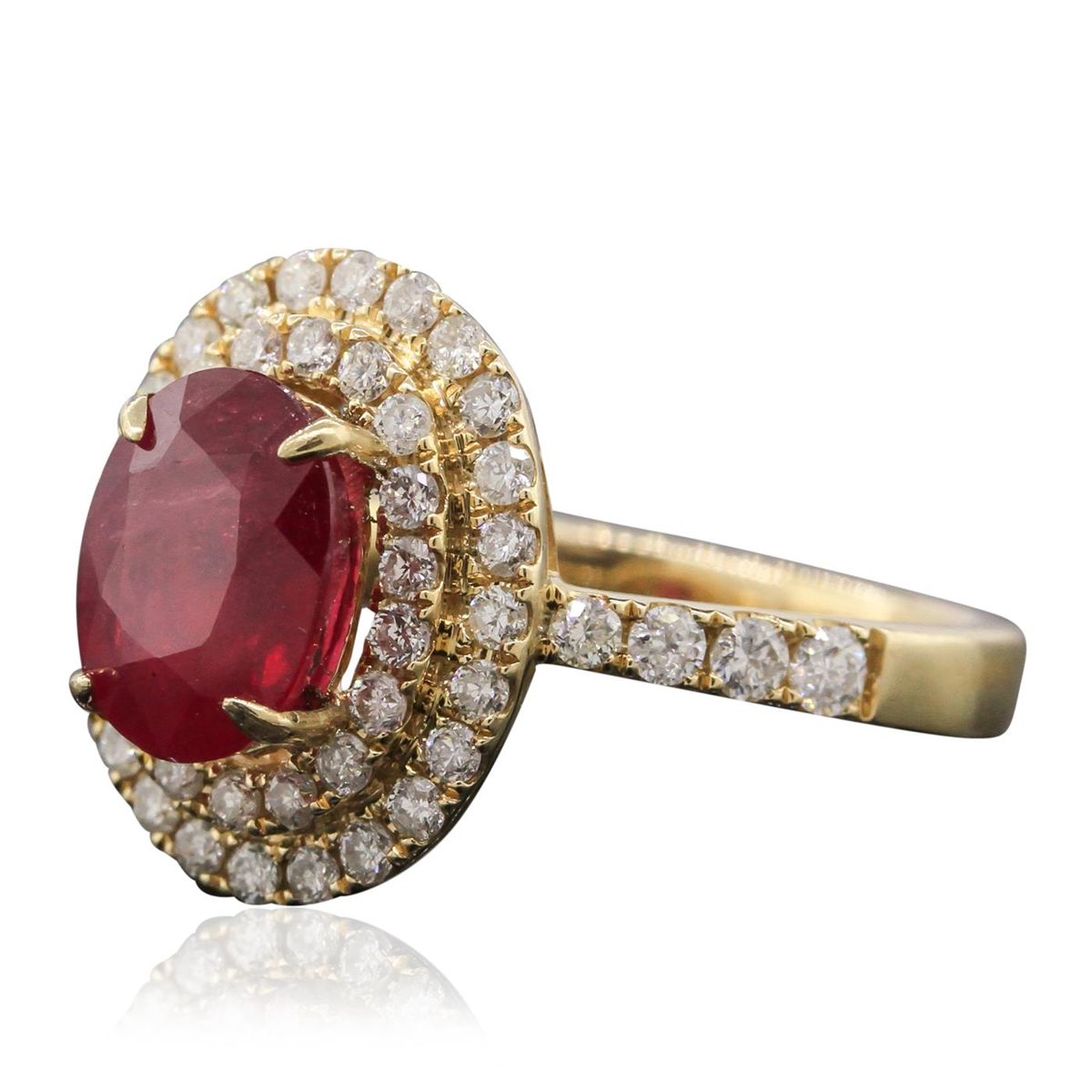 One electronically tested 14KT yellow gold Ladies combination cast & assembled ring with a bright polish finish. Condition is new. Identified with markings of "14K". Containing: One prong set oval modified brilliant cut natural ruby, measuring 8.90 x 7.00 x 4.30mm, approximate weight of 2.17ct., clarity is heavily included, type II, medium dark, moderately strong, strongly purplish red color, (GIA stpR 6/4), cut is good. Colored gemstones are presumed to have been subjected to commonly used color/clarity enhancement processes. Fifty prong set round brilliant cut diamonds, measuring 2.00 - 1.30 x 0.99mm (depth est.) approximate. Total Weight of 50 Stones = 0.50ct. Clarity: I-1 to I-2. Color: I - J, Cut is Good. Total Weight of Colored Stones 2.17ct. Total Weight of Diamonds 0.50ct. Total Weight of Ring 5.30 grams. GGL Appraised at $4,070.00.
