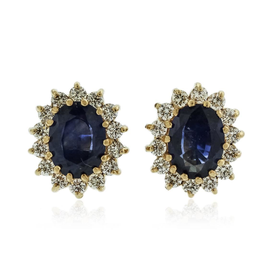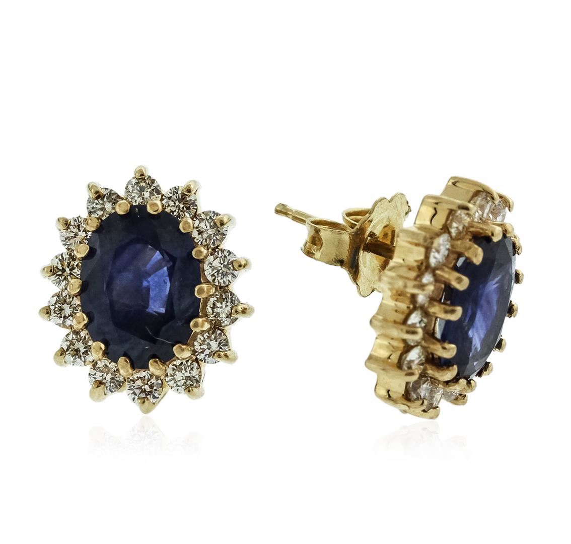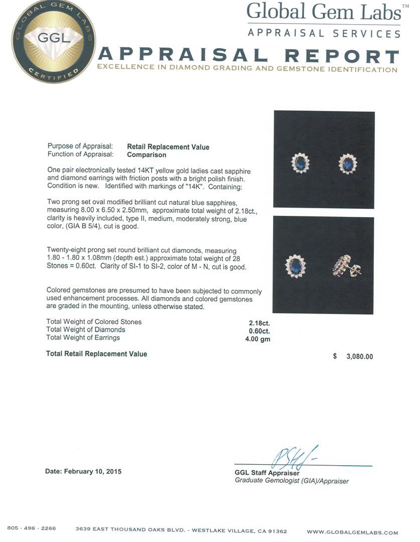 One pair electronically tested 14KT yellow gold ladies cast sapphire and diamond earrings with friction posts with a bright polish finish. Identified with markings of "14K". Condition is new. Containing: Two prong set oval modified brilliant cut natural blue sapphires, measuring 8.00 x 6.50 x 2.50mm, approximate total weight of 2.18ct., clarity is heavily included, type II, medium, moderately strong, blue color, (GIA B 5/4), cut is good. Twenty-Eight prong set round brilliant cut diamonds, measuring 1.80 - 1.80 x 1.08mm (depth est.) approximate total weight of 28 Stones = 0.60ct. Clarity: SI-1 to SI-2. Color: M - N, Cut is Good. Colored gemstones are presumed to have been subjected to commonly used enhancement processes. All diamonds and colored gemstones are graded in the mounting, unless otherwise stated. Total Weight of Colored Stones 2.18ct. Total Weight of Diamonds 0.60ct. Total Weight of Earrings 4.00 grams. GGL Appraised at $3,080.00.