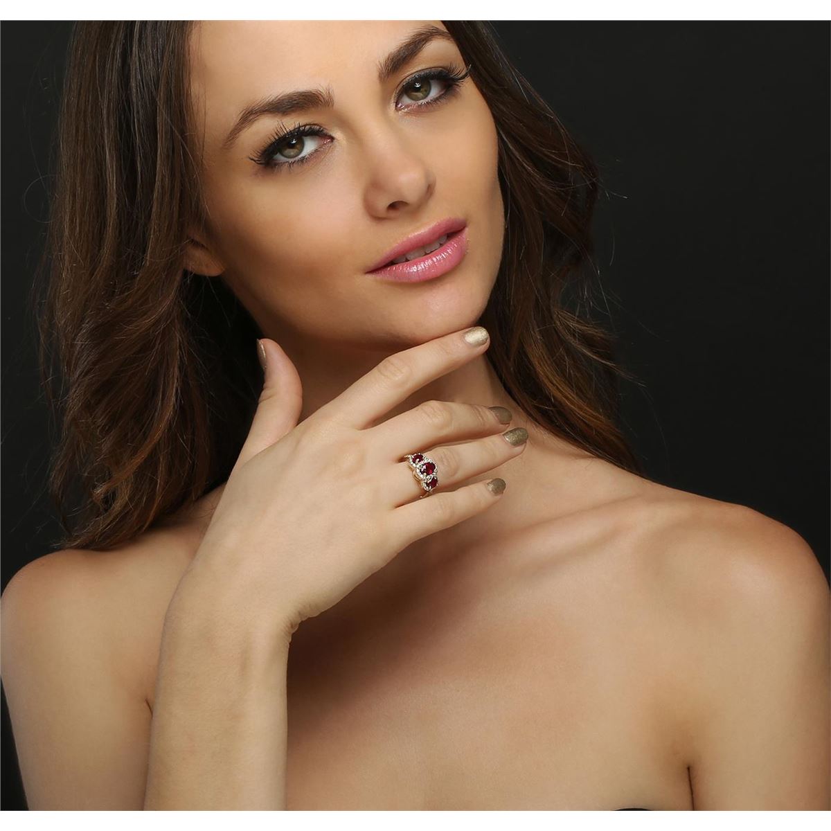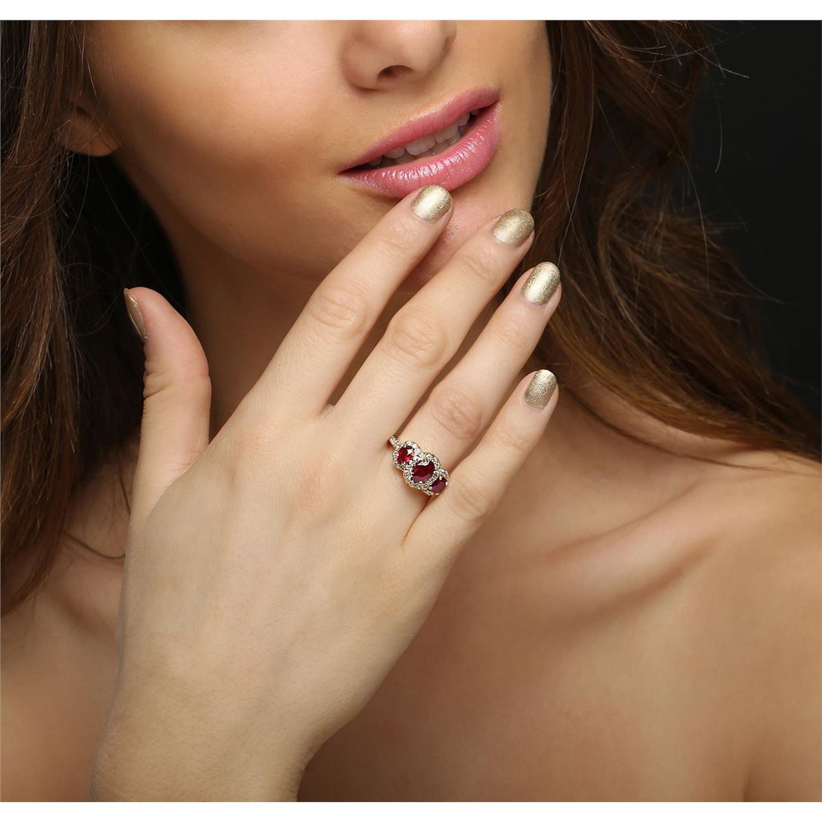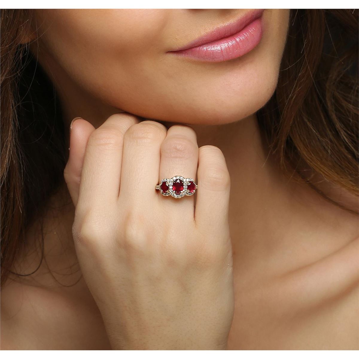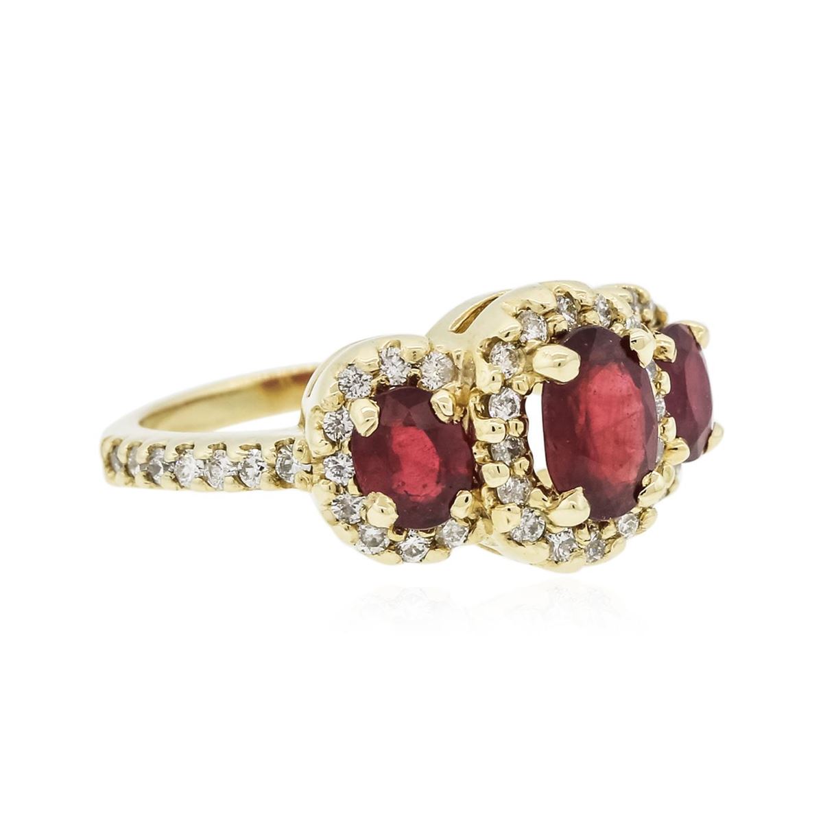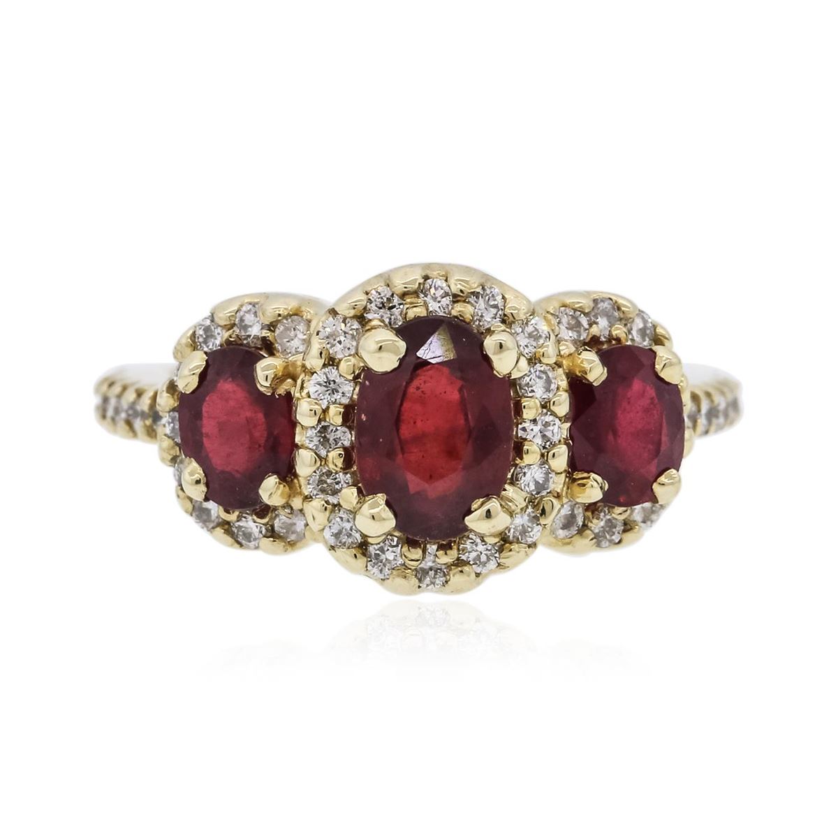 One electronically tested 14KT yellow gold ladies cast ruby and diamond ring with a bright polish finish. The ring features a trio of ruby and diamond bezels supported by diamond set shoulders, completed by a one and one-half millimeter wide band. Identified with markings of "14K". Condition is new, good workmanship. Containing: Three prong set oval mixed cut natural rubies approximate total weight of 2.18ct., clarity is heavily included, type II, medium dark, very slightly brownish, slightly purplish red color, (GIA slpR 6/3), cut is good. Transmitting light somewhat diffusely, transparent to translucent. Naturally occurring internal & external characteristics are present. Indications of laboratory high temperature heat treatment, with glass & flux additives. Color grade is an average for the group. Graded in the setting. Ruby has a low tolerance to rhodium plating, repolishing the surface, & ultrasonic cleaning. Forty-Eight prong set round brilliant cut diamonds, measuring 1.60 - 1.50 x 0.93mm (depth est.) approximate total weight of 48 Stones = 0.75ct. Graded in the setting. Clarity: SI-1 to I-1. Color: G - I. Total Weight of Colored Stones 2.18ct. Total Weight of Diamonds 0.75ct. Total Weight of Ring 5.89 grams. AIG Appraised at $3,615.00.