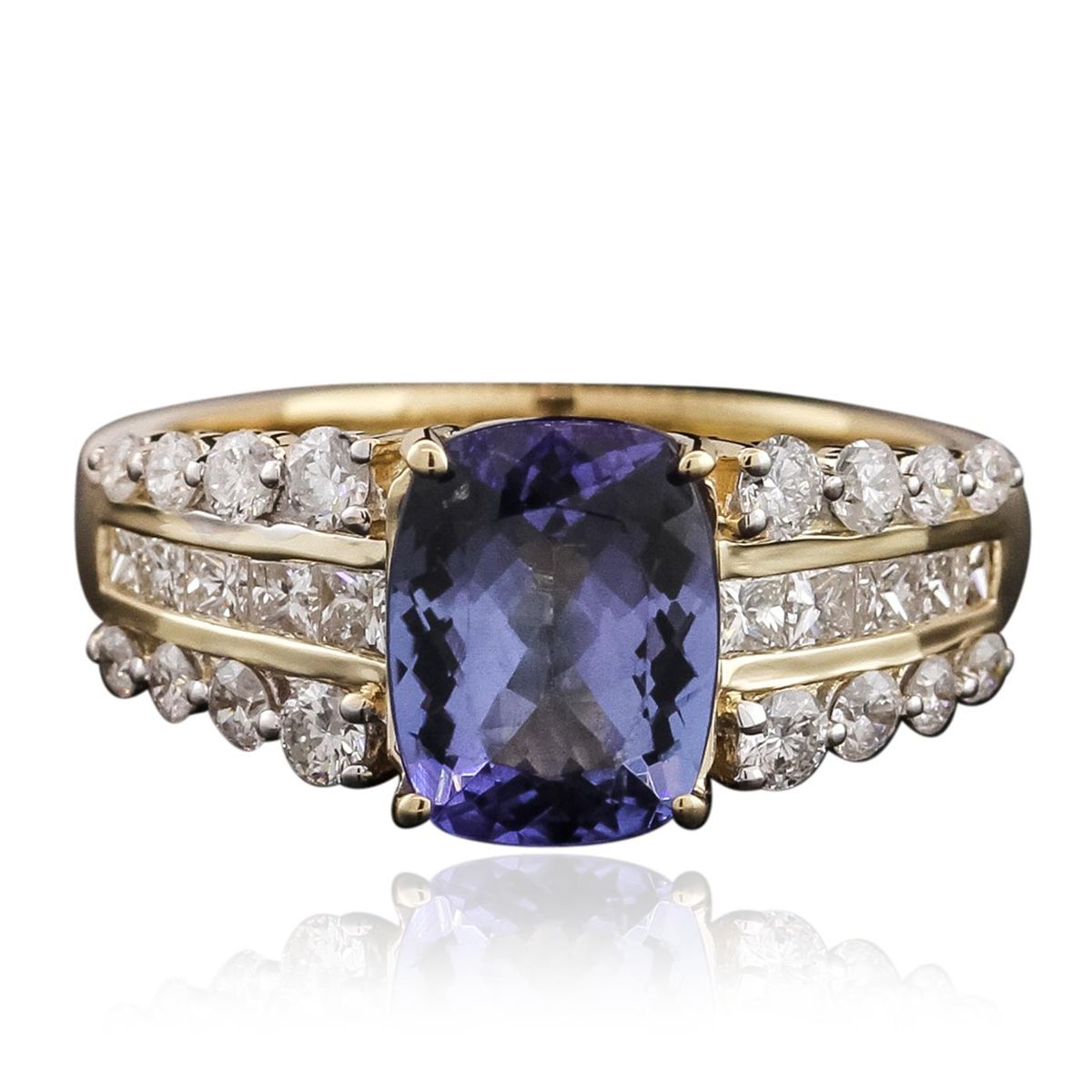 One electronically tested 14KT yellow gold ladies combination cast & assembled tanzanite and diamond ring with a flat shank with a bright polish finish. Identified with markings of "14K". Condition is new. Containing: One prong set rectangular cushion modified brilliant cut natural tanzanite, measuring 9.05 x 6.88 x 4.47mm, approximate weight of 2.19ct., clarity is eye clean, type I, medium light, very slightly grayish, violet color, (GIA V 4/3), cut is good. Sixteen prong set round brilliant cut diamonds, measuring 2.10 - 1.40 x 1.05mm (depth est.) approximate total weight of 16 Stones = 0.31ct. Clarity: SI-2 to I-1. Color: I - J, Cut is Good. Ten channel set princess cut diamonds, measuring 1.50 x 1.50 x 1.13mm (depth est.) approximate total weight of 10 Stones = 0.21ct. Clarity: SI-1. Color: J, Cut is Good. All colored gemstones are graded in the mounting, unless otherwise stated. All diamonds and colored gemstones are graded in the mounting, unless otherwise stated. Total Weight of Colored Stones 2.19ct. Total Weight of Diamonds 0.52ct. Total Weight of Ring 3.90 grams. GGL Appraised at $5,705.00.
