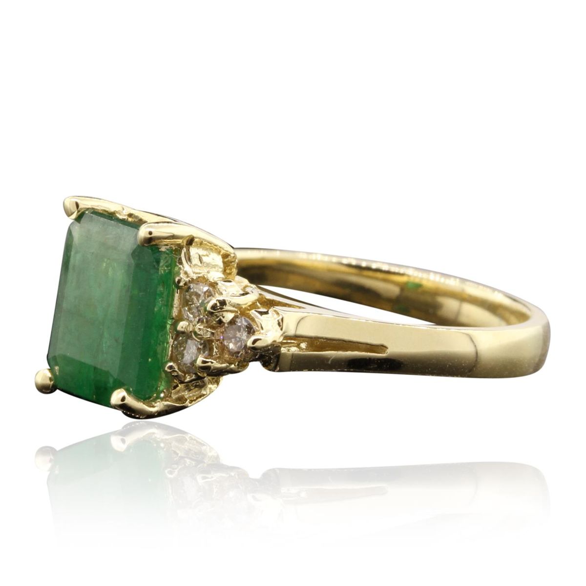 One electronically tested 14KT yellow gold ladies cast emerald and diamond ring with a bright polish finish. The featured emerald is accented by diamond trios on either side supported by split shoulders, completed by a two and one-half millimeter wide band. Identified with markings of "K14". Condition is new, good workmanship. Containing: One prong set rectangular step cut natural emerald, measuring 9.00 x 7.60 x 3.65mm, 8%. bulge factor, approximate weight of 2.20ct., clarity is heavily included, type III, medium, very slightly grayish, very slightly bluish green color, (GIA vslbG 5/3), cut is good. Transmitting light with a minimum of distortion, transparent. Naturally occurring internal & external characteristics are present. Indications of oil & opticon residue. Graded in the setting. Six prong set round brilliant cut diamonds, measuring 2.20 - 2.20 x 1.32mm (depth est.) approximate. Total Weight of 6 Stones = 0.34ct. Graded in the setting. Clarity: SI-1 to I-1 . Color: I - K. Total Weight of Colored Stones 2.20ct. Total Weight of Diamonds 0.34ct. AIG Appraised at $3,290.00.