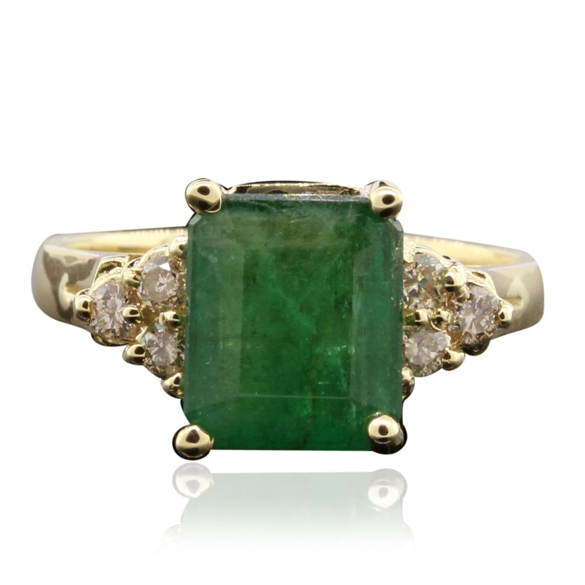 One electronically tested 14KT yellow gold ladies cast emerald and diamond ring with a bright polish finish. The featured emerald is accented by diamond trios on either side supported by split shoulders, completed by a two and one-half millimeter wide band. Identified with markings of "K14". Condition is new, good workmanship. Containing: One prong set rectangular step cut natural emerald, measuring 9.00 x 7.60 x 3.65mm, 8%. bulge factor, approximate weight of 2.20ct., clarity is heavily included, type III, medium, very slightly grayish, very slightly bluish green color, (GIA vslbG 5/3), cut is good. Transmitting light with a minimum of distortion, transparent. Naturally occurring internal & external characteristics are present. Indications of oil & opticon residue. Graded in the setting. Six prong set round brilliant cut diamonds, measuring 2.20 - 2.20 x 1.32mm (depth est.) approximate. Total Weight of 6 Stones = 0.34ct. Graded in the setting. Clarity: SI-1 to I-1 . Color: I - K. Total Weight of Colored Stones 2.20ct. Total Weight of Diamonds 0.34ct. AIG Appraised at $3,290.00.