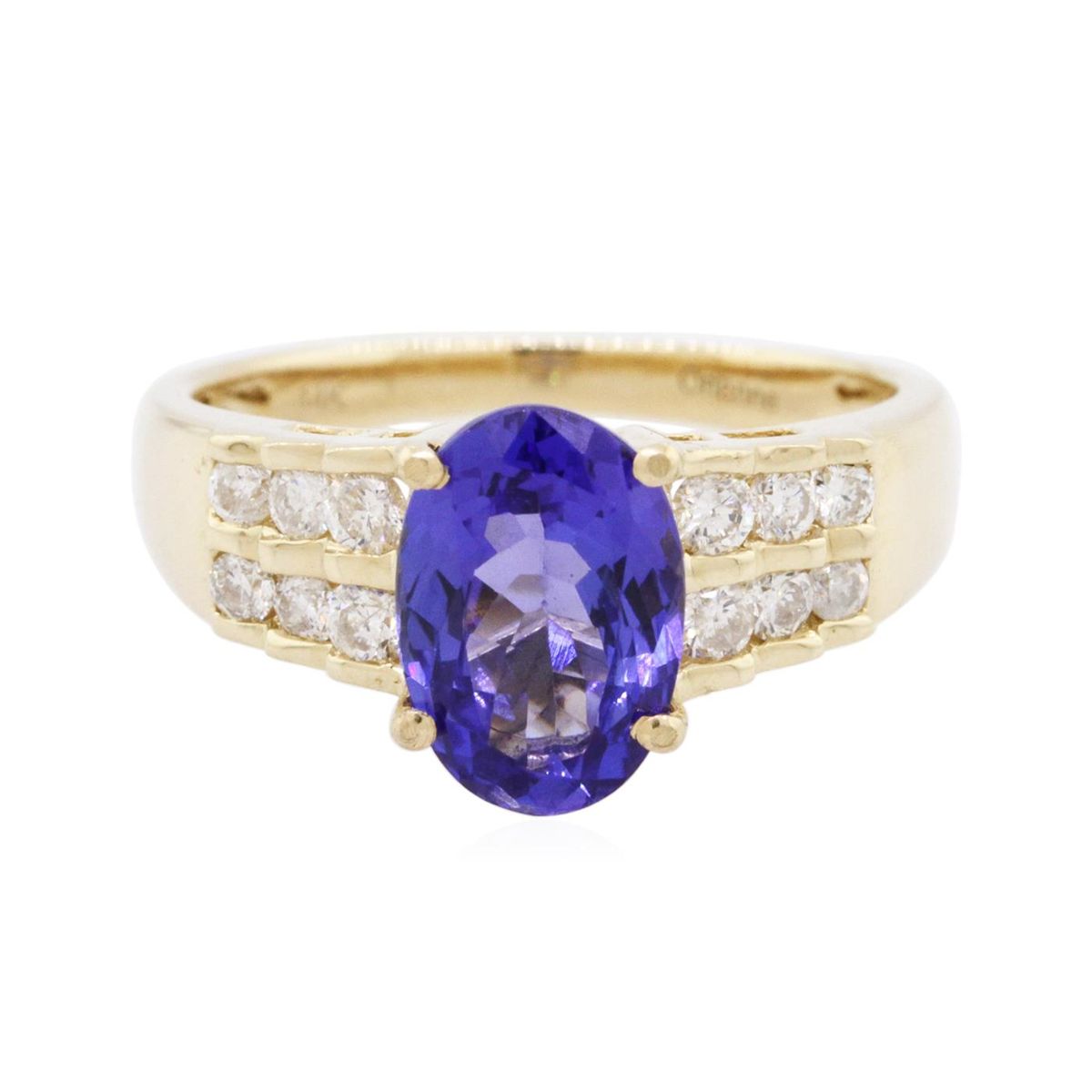 One electronically tested 14KT yellow gold ladies cast tanzanite and diamond ring with a bright polish finish. The featured tanzanite is supported by diamond set shoulders, completed by a two millimeter wide band Trademark is Orianne. Identified with markings of "14K". Condition is new, good workmanship. Containing: One prong set oval brilliant cut natural tanzanite, measuring 9.90 x 6.80 x 4.45mm, 6% bulge factor, approximate weight of 2.20ct., clarity is eye clean, type I, medium dark, moderately strong, violetish blue color, (GIA vB 6/4), cut is good. Transmitting light with no distortion, transparent. Graded in the setting.Tanzanite is a very rare gemstone that is only found in the country of Tanzania. Originally discovered in 1967. Tiffany & Company, named the stone Tanzanite. It is found in the Usumburu Mountains that border the Umba Valley of northern Tanzania. Tanzanite occurs in gray, brown, violet, blue, reddish-purple, & green. The gem is interesting because of its exceptional pleochroism. Rotated in different directions a tanzanite will exhibit multiple changes of color. Tanzanite has a low tolerance to ultrasonic cleaning, and should not be cleaned using this method.Twelve channel set round brilliant cut diamonds, measuring 2.20 - 2.00 x 1.26mm (depth est.) approximate total weight of 12 Stones = 0.50ct. Graded in the setting. Clarity: SI-2 to I-1. Color: G - I. Total Weight of Colored Stones 2.20ct. Total Weight of Diamonds 0.50ct. Total Weight of Ring 3.97 grams. AIG Appraised at $7,275.00.