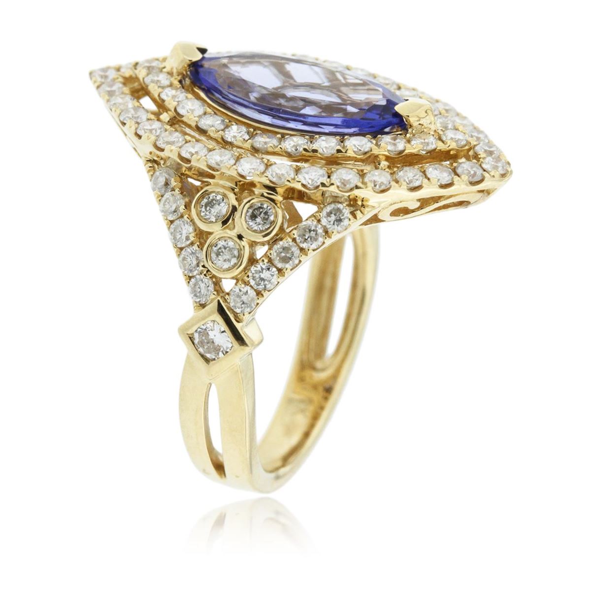 One electronically tested 14KT yellow gold Ladies combination cast & assembled ring with a bright polish finish. Condition is new. Identified with markings of "14K". Containing: Eighty prong set round brilliant cut diamonds, measuring 1.50 - 1.50 x 0.90mm (depth est.) approximate. Total Weight of 80 Stones = 1.52ct. Clarity: I-1 to I-2. Color: I - J, Cut is Good. Two prong set round brilliant cut diamonds, measuring 2.20 - 2.20 x 1.32mm (depth est.) approximate. Total Weight of 2 Stones = 0.08ct. Clarity: I-1 to I-2. Color: I - J, Cut is Good. One prong set marquise modified brilliant cut natural tanzanite, measuring 14.00 x 6.60 x 3.80mm, exact weight 2.20ct., clarity is eye clean, type I, medium light, very slightly grayish, violet color, (GIA V 4/3), cut is very good. Colored gemstones are presumed to have been subjected to commonly used color/clarity enhancement processes. Total Weight of Colored Stones 2.20ct. Total Weight of Diamonds 1.60ct. Total Weight of Ring 7.40 grams. GGL Appraised at $6,545.00.
