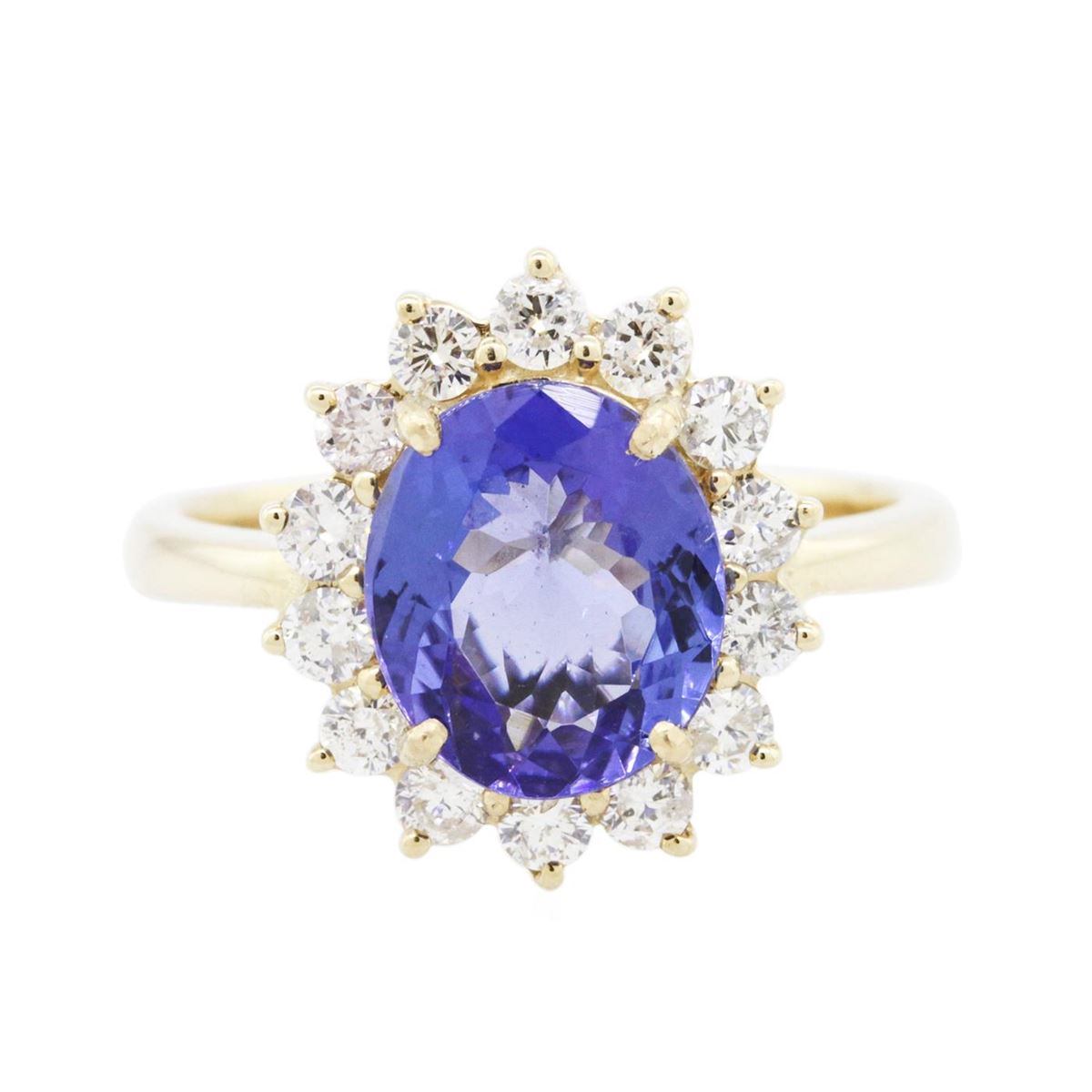 One electronically tested 14KT yellow gold ladies combination cast & assembled tanzanite and diamond ring with a flat shank with a bright polish finish. Identified with markings of "14K". Condition is new. Containing: One prong set oval modified brilliant cut natural tanzanite, measuring 9.72 x 8.35 x 4.10mm, approximate weight of 2.24ct., clarity is eye clean, type I, medium, moderately strong, bluish violet color, (GIA bV 5/4), cut is good. Fourteen prong set round brilliant cut diamonds, measuring 2.00 - 2.00 x 1.20mm (depth est.) approximate total weight of 14 Stones = 0.41ct. Clarity: SI-2 to I-1. Color: I - J, Cut is Good. Colored gemstones are presumed to have been subjected to commonly used enhancement processes. All diamonds and colored gemstones are graded in the mounting, unless otherwise stated total weight of Colored Stones 2.24ct. Total Weight of Diamonds 0.41ct. Total Weight of Ring 4.20 grams. GGL Appraised at $6,155.00.