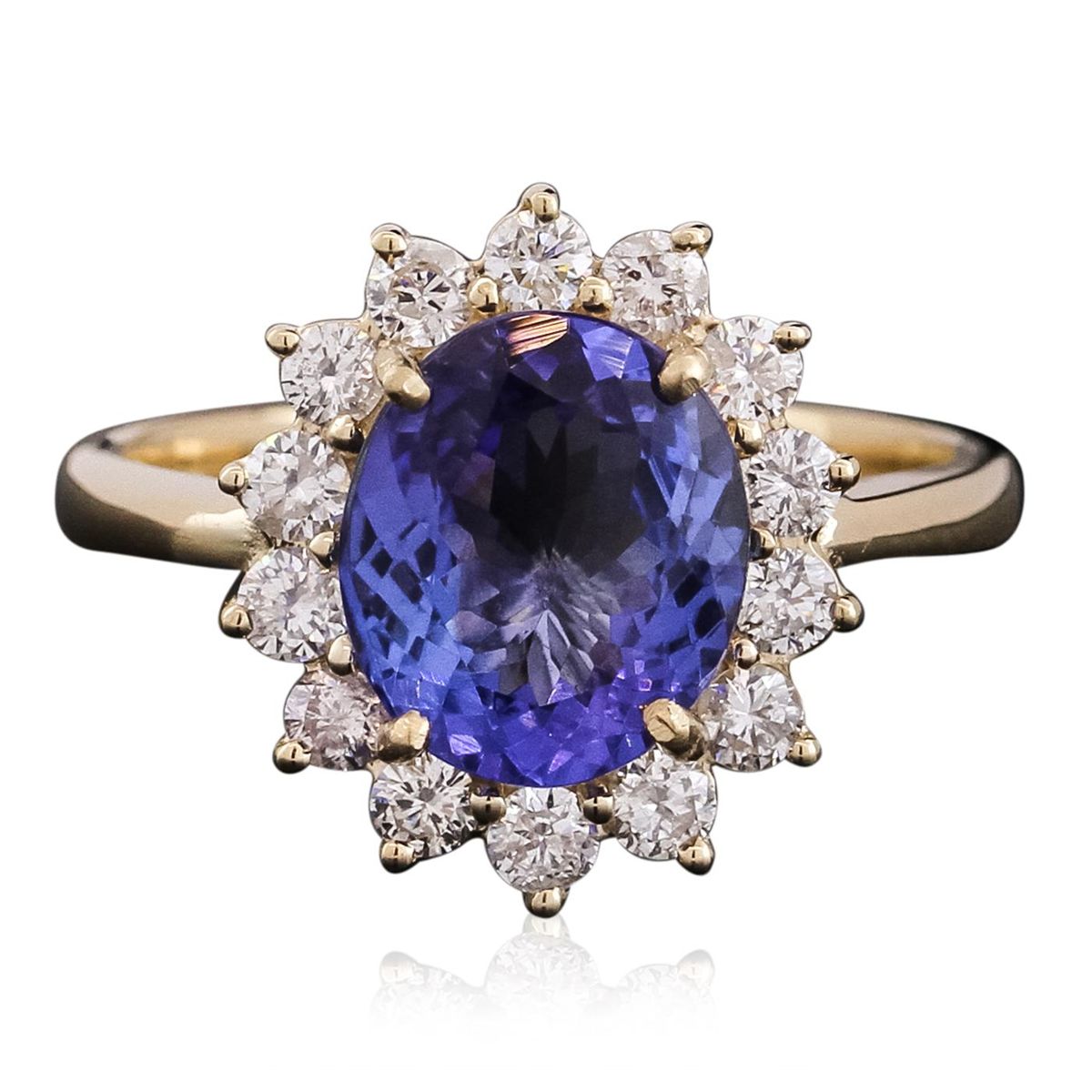One electronically tested 14KT yellow gold ladies combination cast & assembled tanzanite and diamond ring with a flat shank with a bright polish finish. Identified with markings of "14K". Condition is new. Containing: One prong set oval modified brilliant cut natural tanzanite, measuring 9.72 x 8.35 x 4.10mm, approximate weight of 2.24ct., clarity is eye clean, type I, medium, moderately strong, bluish violet color, (GIA bV 5/4), cut is good. Fourteen prong set round brilliant cut diamonds, measuring 2.00 - 2.00 x 1.20mm (depth est.) approximate total weight of 14 Stones = 0.41ct. Clarity: SI-2 to I-1. Color: I - J, Cut is Good. Colored gemstones are presumed to have been subjected to commonly used enhancement processes. All diamonds and colored gemstones are graded in the mounting, unless otherwise stated total weight of Colored Stones 2.24ct. Total Weight of Diamonds 0.41ct. Total Weight of Ring 4.20 grams. GGL Appraised at $6,155.00.