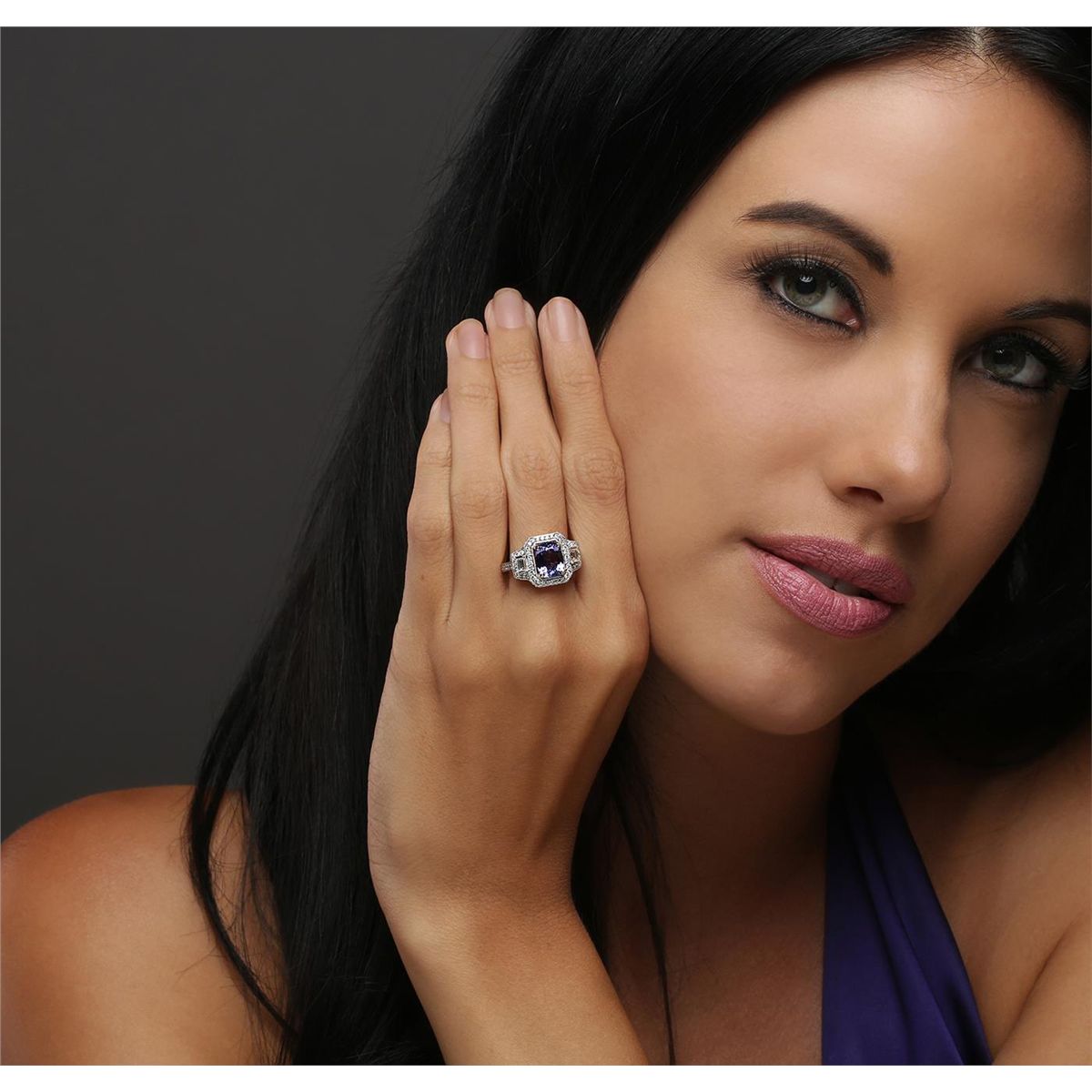 One electronically tested 14KT yellow gold ladies combination cast & assembled tanzanite and diamond ring with a flat shank with a bright polish finish. Identified with markings of "14K". Condition is new. Containing: One prong set rectangular cushion modified brilliant cut natural tanzanite, measuring 8.89 x 7.01 x 4.56mm, approximate weight of 2.24ct., clarity is eye clean, type I, medium, very slightly grayish, violet color, (GIA V 5/3), cut is good. One Hundred prong set round brilliant cut diamonds, measuring 1.00 - 1.00 x 0.60mm (depth est.) approximate total weight of 100 Stones = 0.36ct. Clarity: SI-2 to I-1. Color: I - J, Cut is Good. Two prong set baguette cut diamonds, measuring 3.00 x 2.00 x 1.70mm (depth est.) approximate total weight of 2 Stones = 0.19ct. Clarity: SI-1. Color: I, Cut is Good. Colored gemstones are presumed to have been subjected to commonly used enhancement processes. All diamonds and colored gemstones are graded in the mounting, unless otherwise stated. Total Weight of Colored Stones 2.24ct. Total Weight of Diamonds 0.55ct. Total Weight of Ring 4.90 grams. GGL Appraised at $5,720.00.