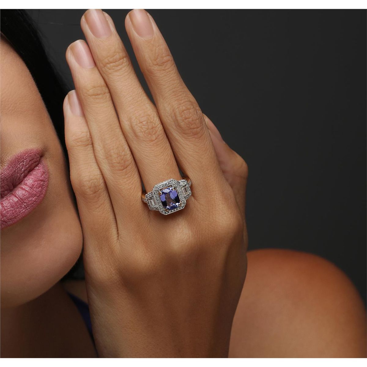 One electronically tested 14KT yellow gold ladies combination cast & assembled tanzanite and diamond ring with a flat shank with a bright polish finish. Identified with markings of "14K". Condition is new. Containing: One prong set rectangular cushion modified brilliant cut natural tanzanite, measuring 8.89 x 7.01 x 4.56mm, approximate weight of 2.24ct., clarity is eye clean, type I, medium, very slightly grayish, violet color, (GIA V 5/3), cut is good. One Hundred prong set round brilliant cut diamonds, measuring 1.00 - 1.00 x 0.60mm (depth est.) approximate total weight of 100 Stones = 0.36ct. Clarity: SI-2 to I-1. Color: I - J, Cut is Good. Two prong set baguette cut diamonds, measuring 3.00 x 2.00 x 1.70mm (depth est.) approximate total weight of 2 Stones = 0.19ct. Clarity: SI-1. Color: I, Cut is Good. Colored gemstones are presumed to have been subjected to commonly used enhancement processes. All diamonds and colored gemstones are graded in the mounting, unless otherwise stated. Total Weight of Colored Stones 2.24ct. Total Weight of Diamonds 0.55ct. Total Weight of Ring 4.90 grams. GGL Appraised at $5,720.00.