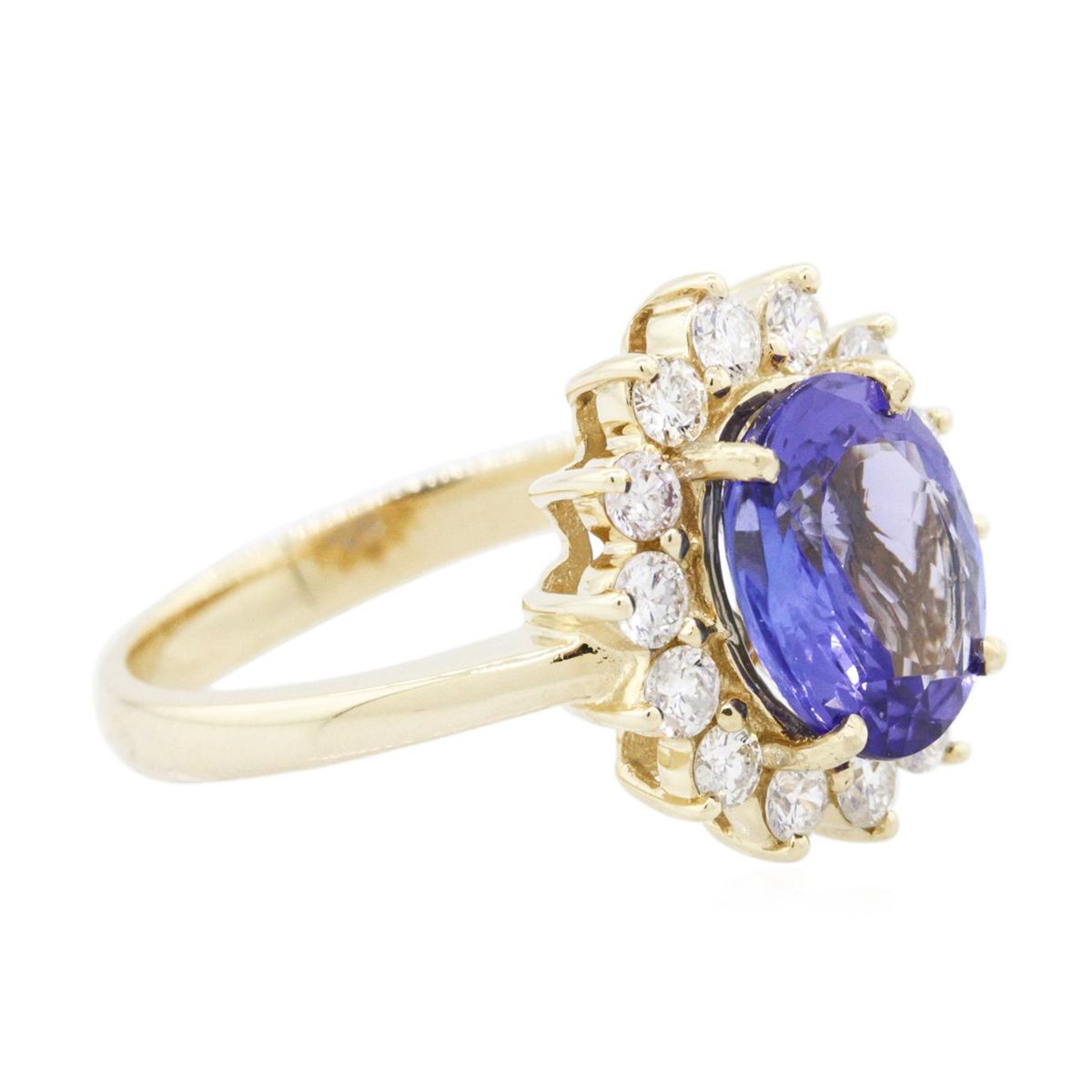 One electronically tested 14KT yellow gold ladies combination cast & assembled tanzanite and diamond ring with a flat shank with a bright polish finish. Identified with markings of "14K". Condition is new. Containing: One prong set oval modified brilliant cut natural tanzanite, measuring 9.72 x 8.35 x 4.10mm, approximate weight of 2.24ct., clarity is eye clean, type I, medium, moderately strong, bluish violet color, (GIA bV 5/4), cut is good. Fourteen prong set round brilliant cut diamonds, measuring 2.00 - 2.00 x 1.20mm (depth est.) approximate total weight of 14 Stones = 0.41ct. Clarity: SI-2 to I-1. Color: I - J, Cut is Good. Colored gemstones are presumed to have been subjected to commonly used enhancement processes. All diamonds and colored gemstones are graded in the mounting, unless otherwise stated total weight of Colored Stones 2.24ct. Total Weight of Diamonds 0.41ct. Total Weight of Ring 4.20 grams. GGL Appraised at $6,155.00.