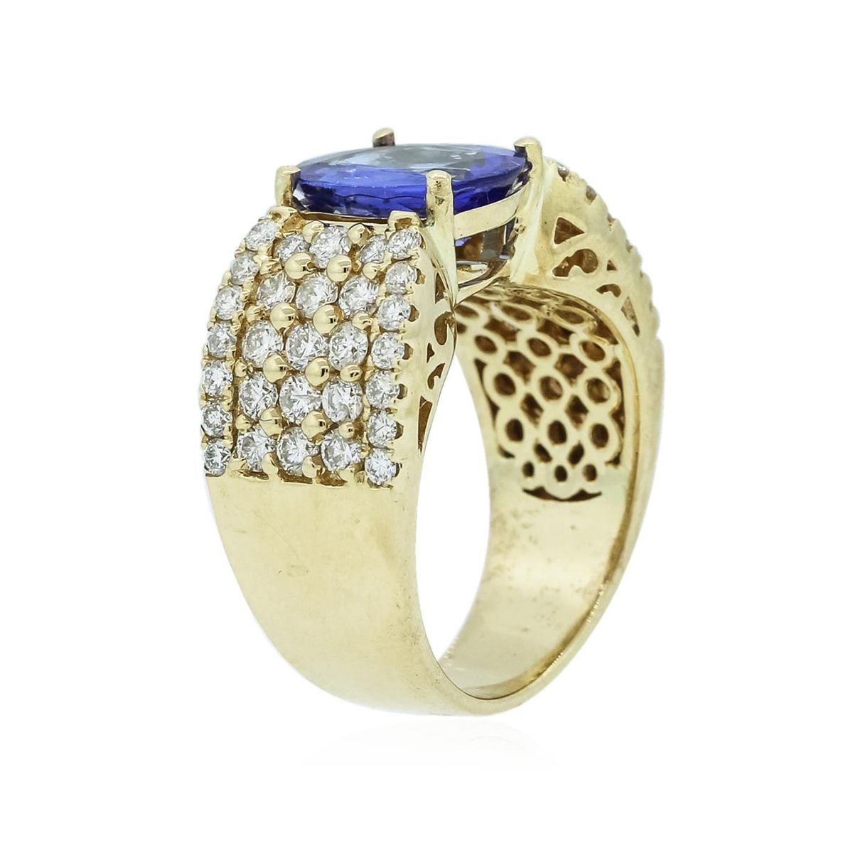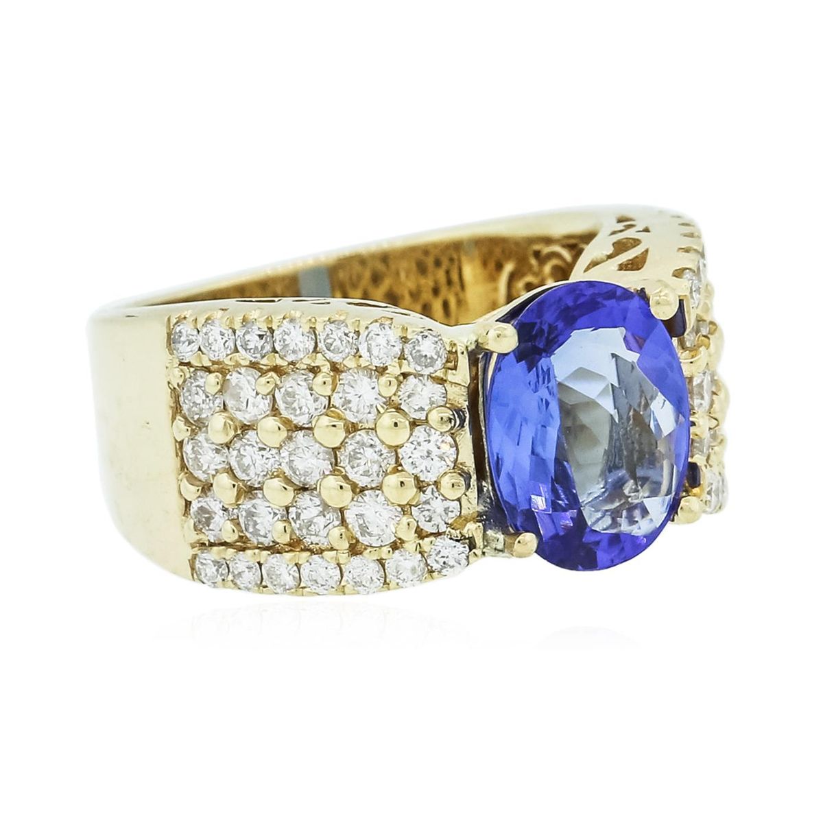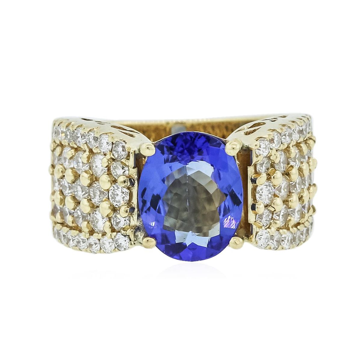 One electronically tested 14KT yellow gold ladies combination cast & assembled tanzanite and diamond ring with a flat shank with a bright polish finish. Identified with markings of "14K". Condition is new. Containing: One prong set oval modified brilliant cut natural tanzanite, measuring 10.41 x 8.28 x 3.83mm, approximate weight of 2.24ct., clarity is eye clean, type I, medium light, moderately strong, bluish violet color, (GIA bV 4/4), cut is good. Fifty-Eight prong set round brilliant cut diamonds, measuring 1.90 - 1.50 x 1.02mm (depth est.) stated total weight of 58 Stones = 1.04ct. Clarity: I-1 to I-2. Color: J - K, Cut is Good. Colored gemstones are presumed to have been subjected to commonly used enhancement processes. All diamonds and colored gemstones are graded in the mounting, unless otherwise stated total weight of Colored Stones 2.24ct. Total Weight of Diamonds 1.04ct. Total Weight of Ring 10.10 grams. GGL Appraised at $8,445.00.