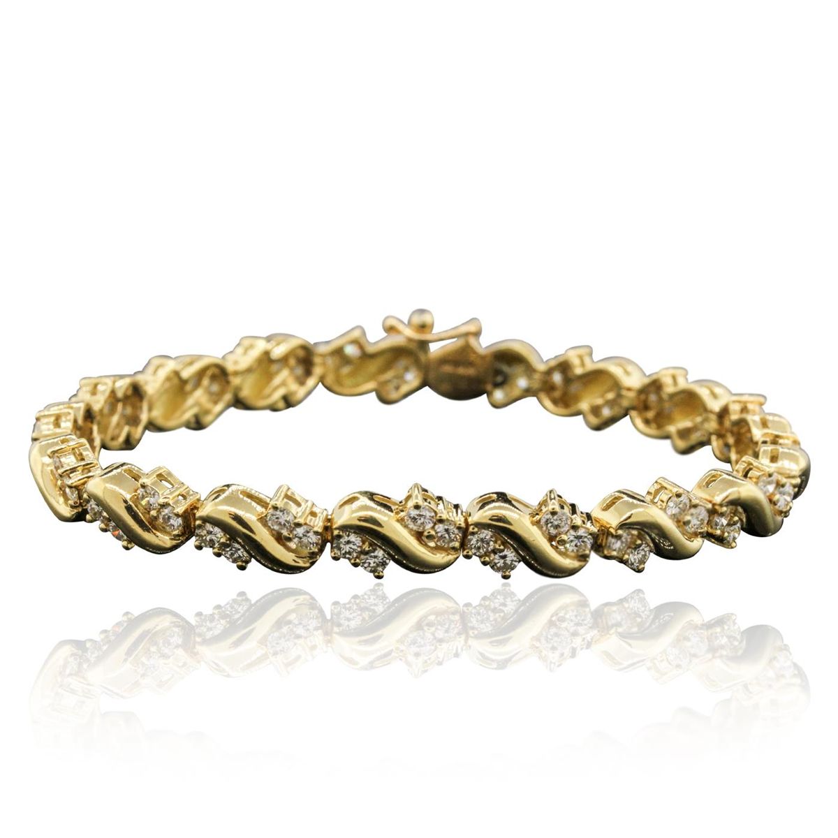 One electronically tested 18KT yellow gold ladies cast & assembled diamond bracelet with a bright polish finish. Condition is new, good workmanship. Six and one-half inch length bracelet features a series of diamond duos and "s" shaped links, terminating in a concealed clasp with safety. Identified with markings of "18K". Containing: Sixty-Eight prong set round brilliant cut diamonds, measuring 2.10 - 2.00 x 1.23mm (depth est.) approximate. Total Weight of 68 Stones = 2.24ct. Graded in the setting. Clarity: VS-1 to VS-2. Color: G - I. Total Weight of Diamonds 2.24ct. Total Weight of Bracelet 17.07 grams. AIG Appraised at $12,030.00.