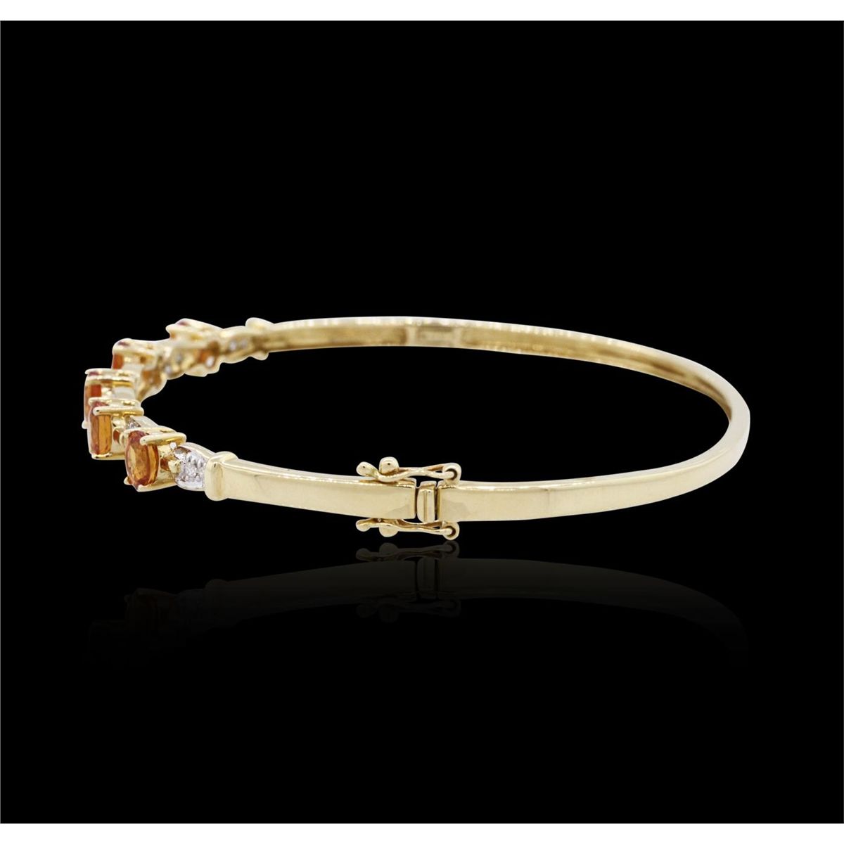 One bangle bracelet featuring: 14KT yellow gold weighing 7.33 grams containing five orange sapphires with a total weight of 2.26cts and 16 round cut diamonds with a total weight of 0.14cts.